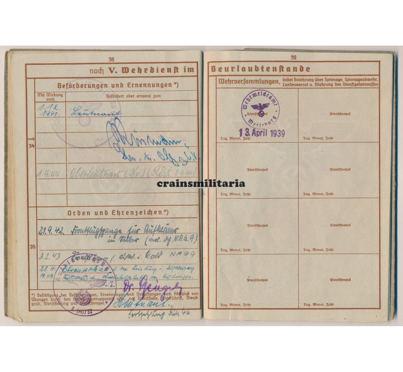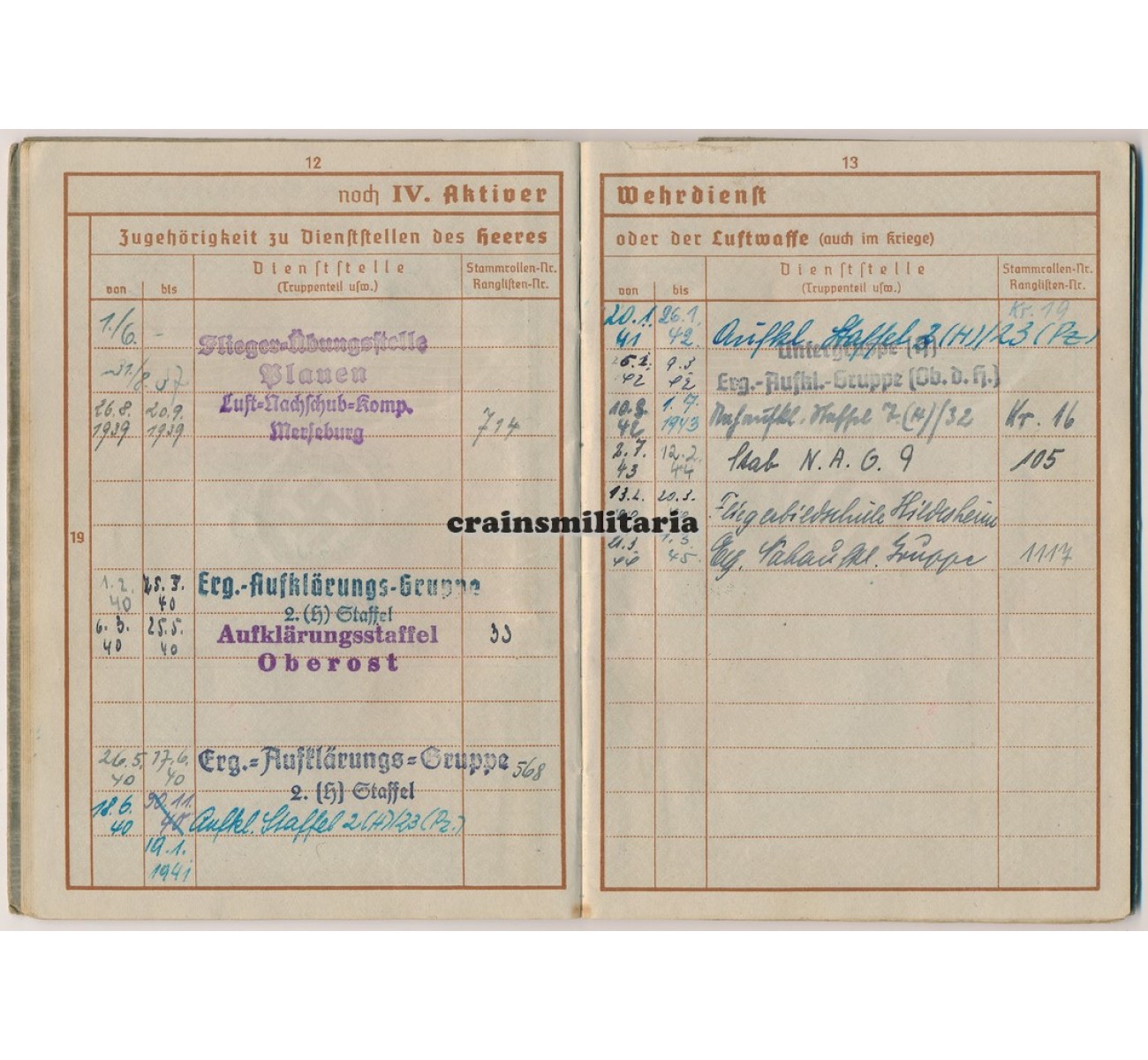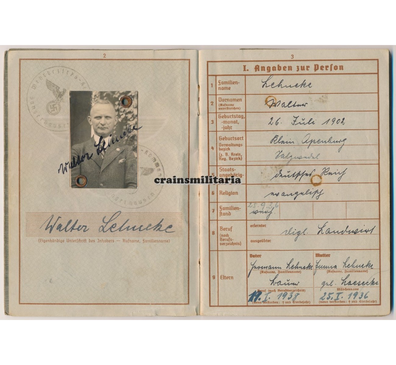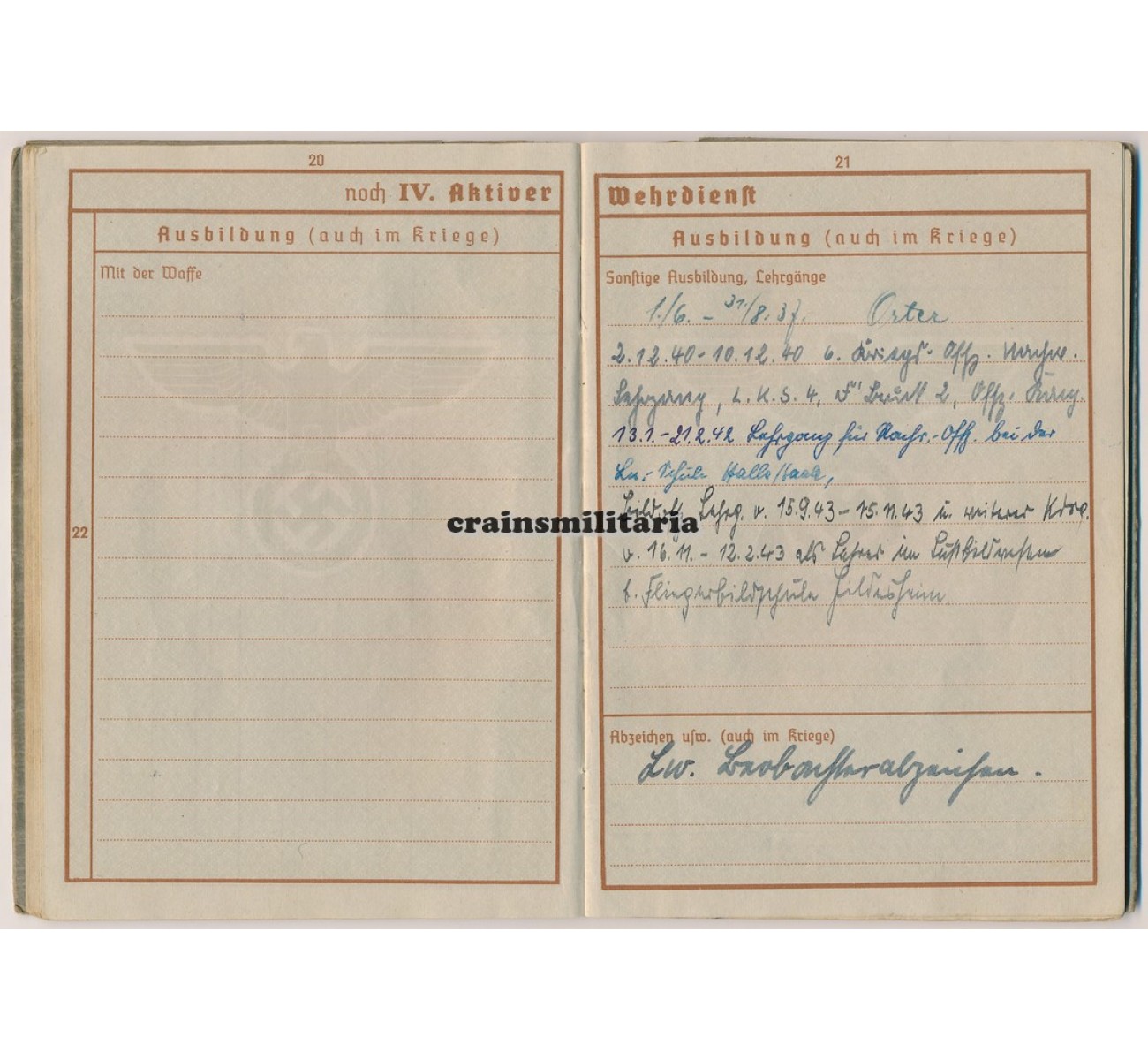- Wehrpass to Oberleutnant Walter Lehneke. First issue from May 1937. Called up with the Luftwaffe in February 1940, Lehneke quite surprisingly was assigned in a flying role despite his respectable age - he was born in 1902. Trained as a Beobachter in Nahaufklärung units, he saw action in France 1940, then on the northern sector of the Eastern Front (Lithuania, Estonia, Leningrad), where he earned his EKII. A new series of awards followed mid 1942 when he was deployed with Nahaufklärungs-Staffel 7 (H) / 32 on the Southern sector of the Eastern front, earning him the EKI and two flying clasps. Major awards followed in 1943: the Frontflugspange für Aufklärer in Gold, the Ehrenpokal and the Deutsches Kreuz in Gold awarded on 12th of July 1943. In February 1944 he was taken away from the front, tos erve with the Fliegerbildschule Hildesheim and later the Erganzungs-Nahaufklärungsgruppe.