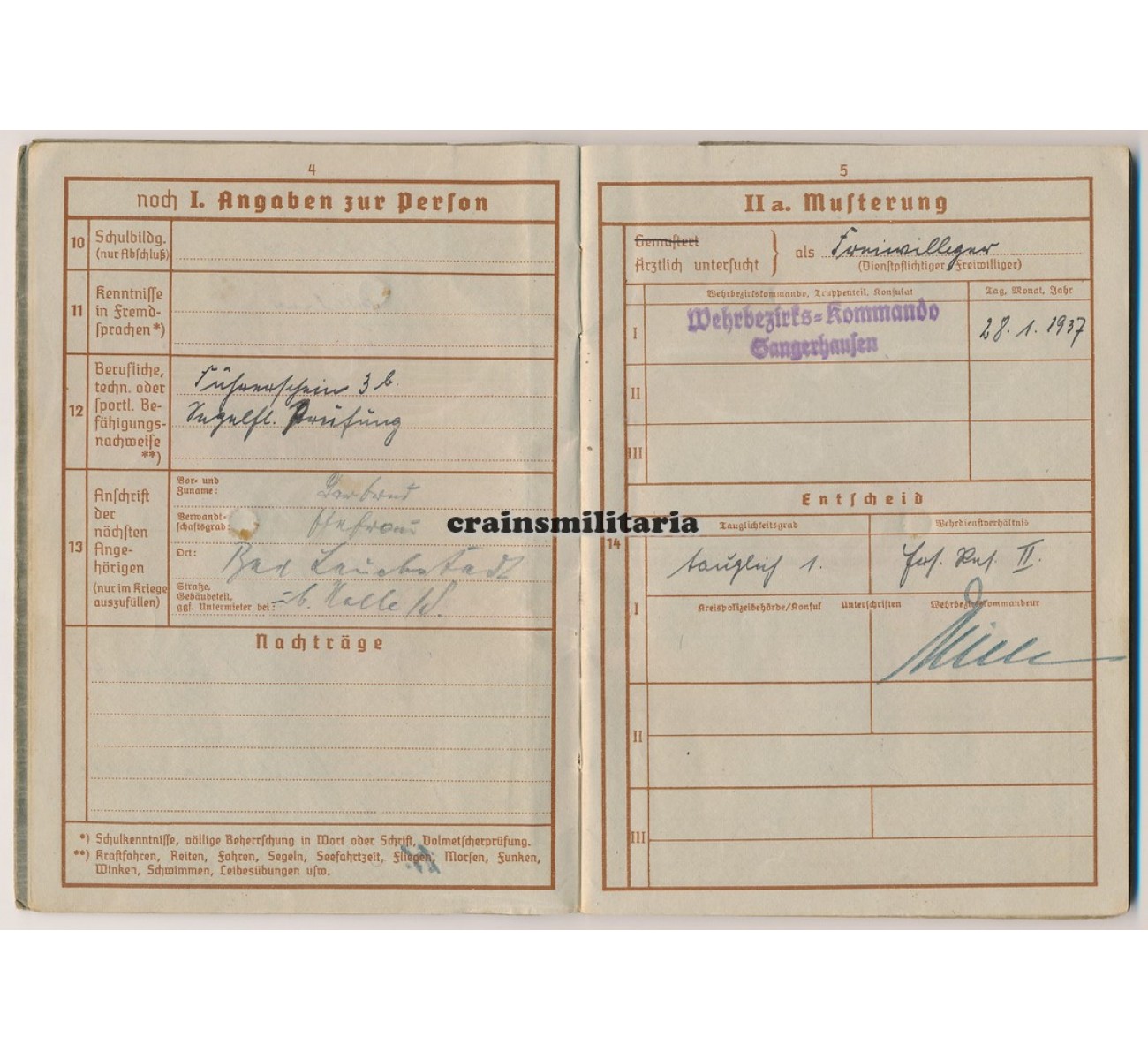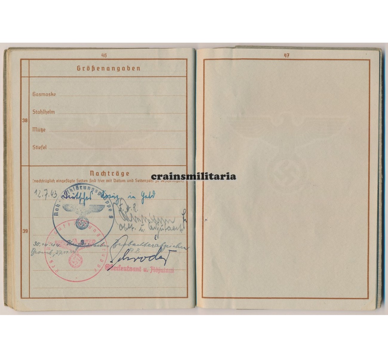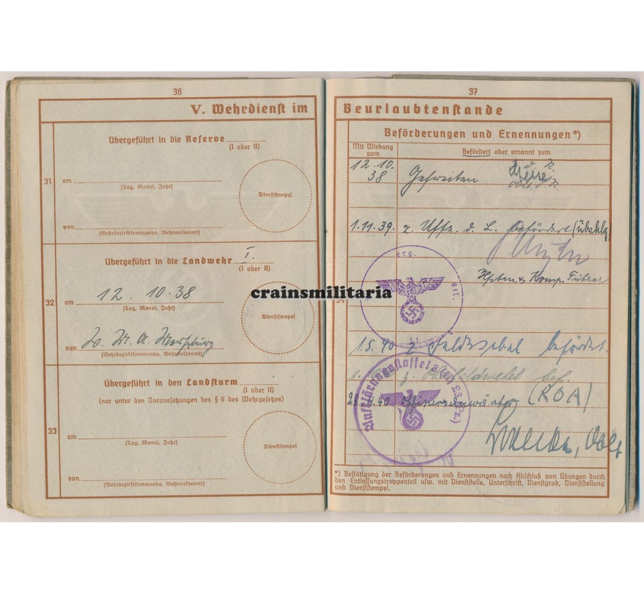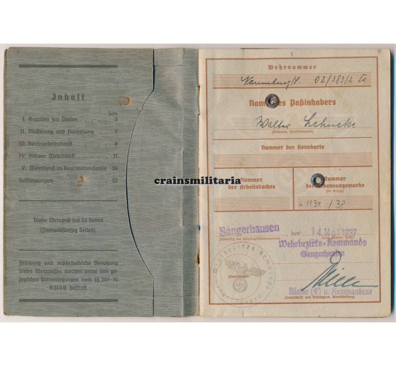 - Wehrpass to Oberleutnant Walter Lehneke. First issue from May 1937. Called up with the Luftwaffe in February 1940, Lehneke quite surprisingly was assigned in a flying role despite his respectable age - he was born in 1902. Trained as a Beobachter in Nahaufklärung units, he saw action in France 1940, then on the northern sector of the Eastern Front (Lithuania, Estonia, Leningrad), where he earned his EKII. A new series of awards followed mid 1942 when he was deployed with Nahaufklärungs-Staffel 7 (H) / 32 on the Southern sector of the Eastern front, earning him the EKI and two flying clasps. Major awards followed in 1943: the Frontflugspange für Aufklärer in Gold, the Ehrenpokal and the Deutsches Kreuz in Gold awarded on 12th of July 1943. In February 1944 he was taken away from the front, tos erve with the Fliegerbildschule Hildesheim and later the Erganzungs-Nahaufklärungsgruppe.
