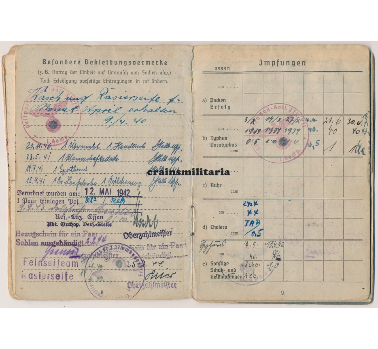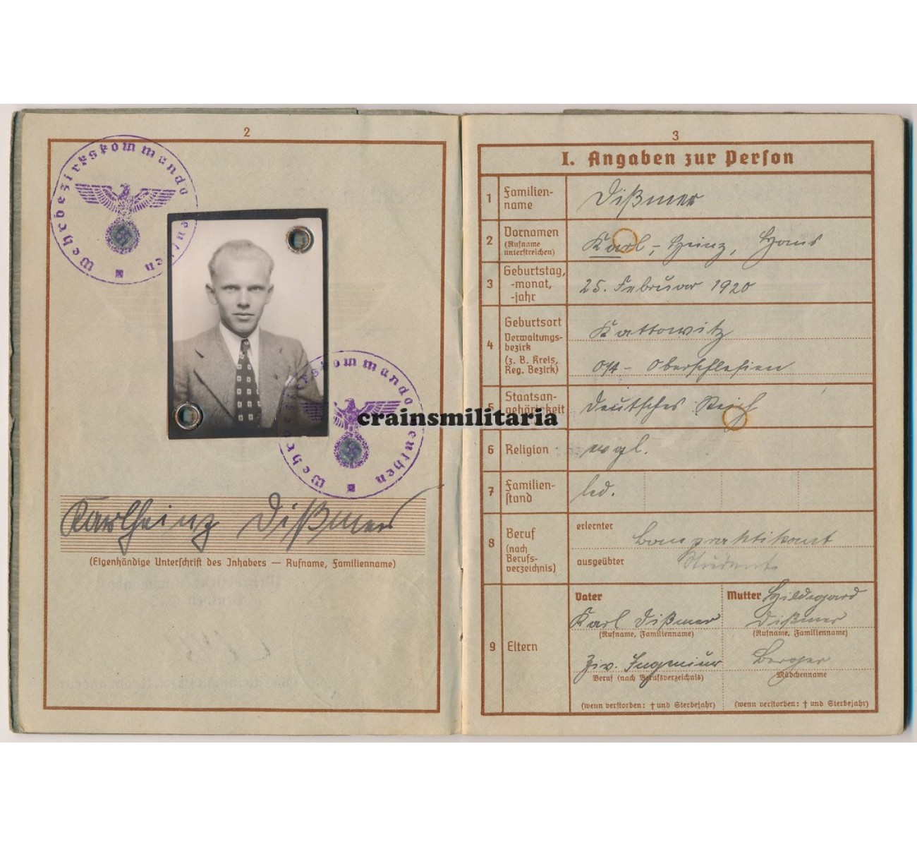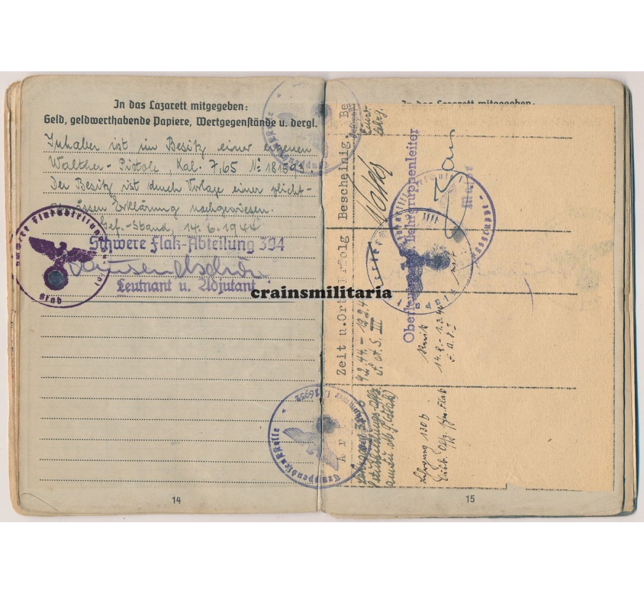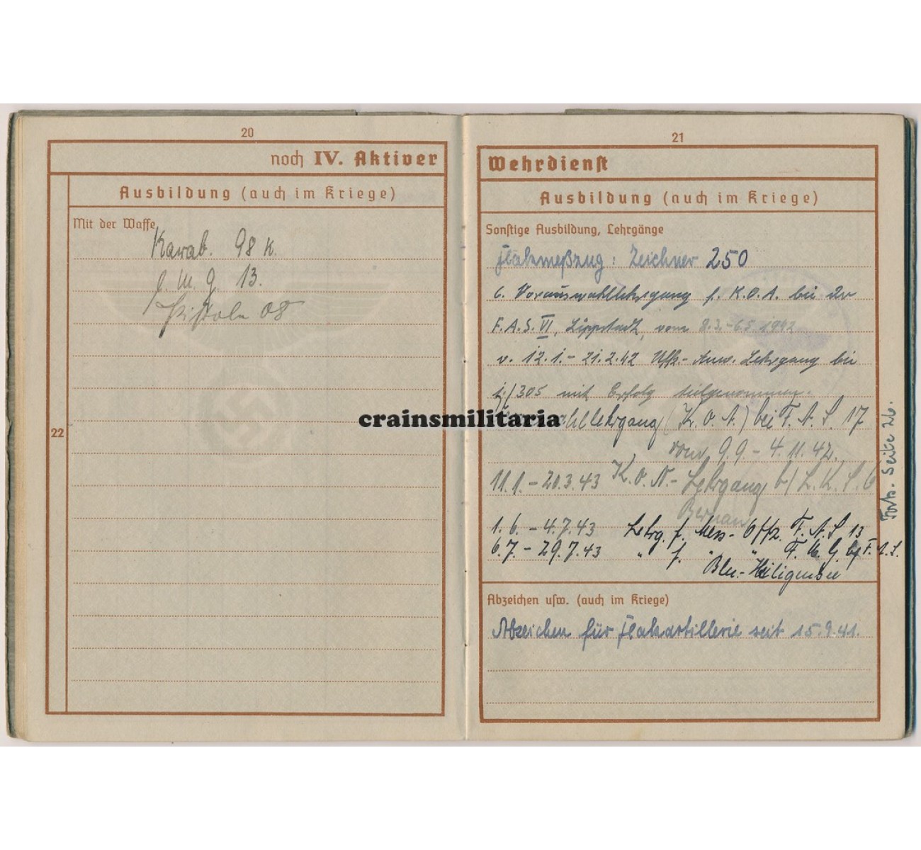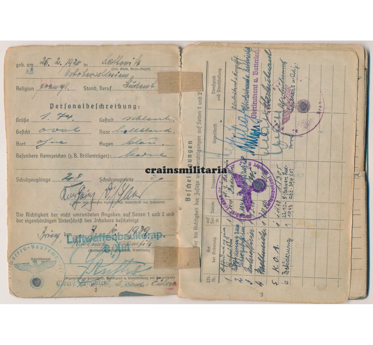 - The Soldbuch has some repairs and pages 6-7 and 23-24 have been torn, but all pages are still there. Great portrait photo with the KVKII and part of the Flak badge in wear. The Wehrpass is in excellent condition and complete as well. Both booklets are packed with entries, lots of training, extra pages, private Walther pistol in the Soldbuch, etc. Also added is a confirmation of his sports results, counting for the awarding of the SA Sportabzeichen.