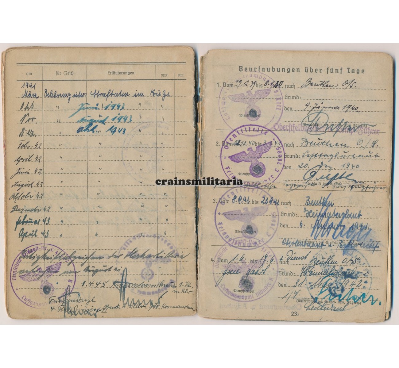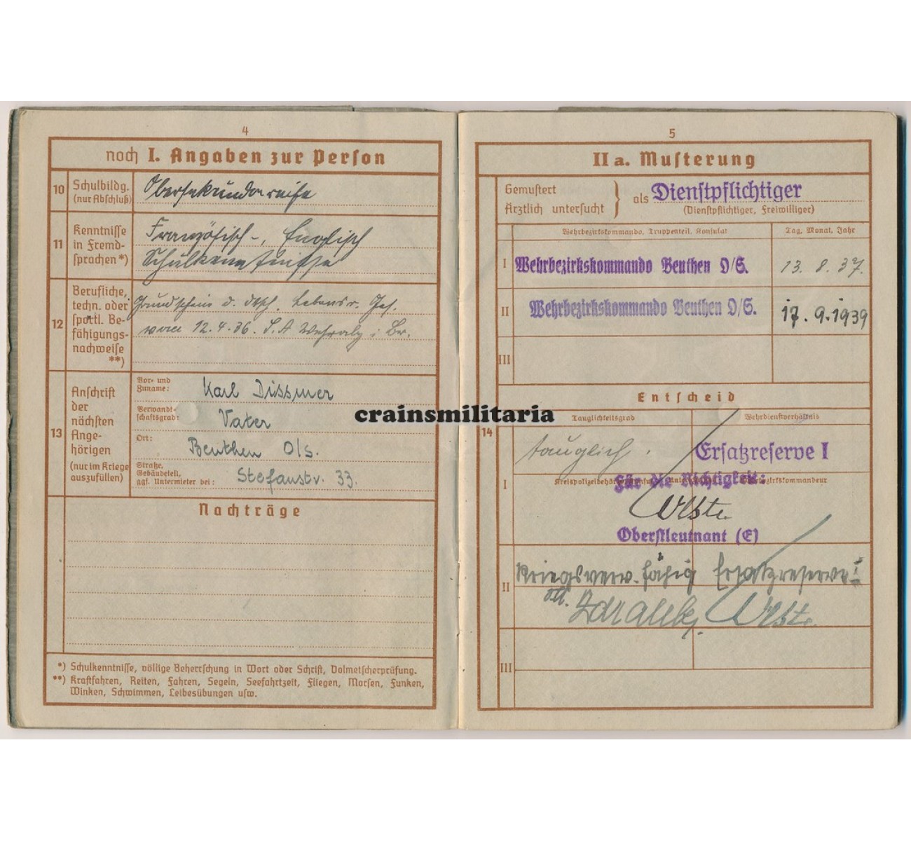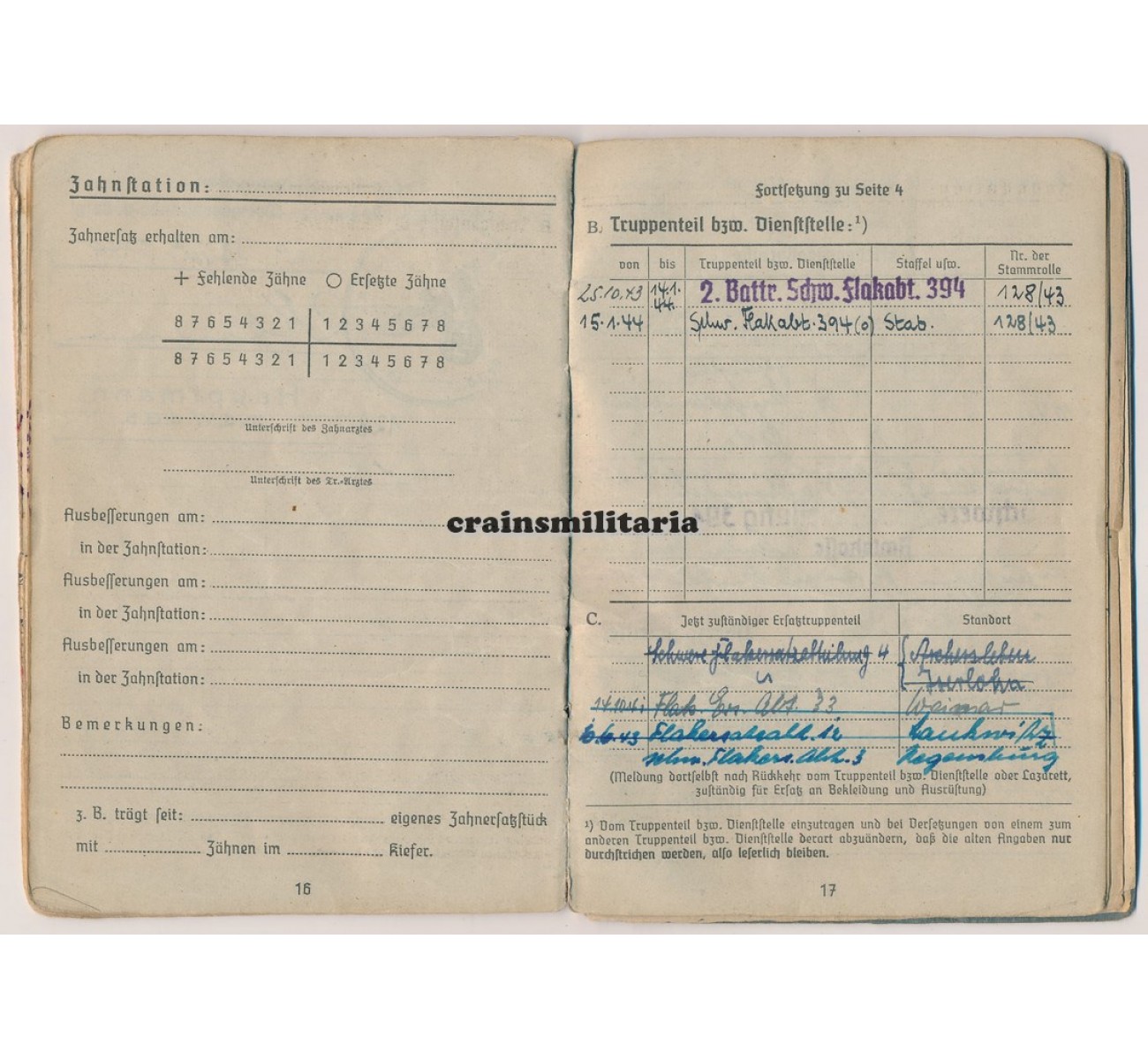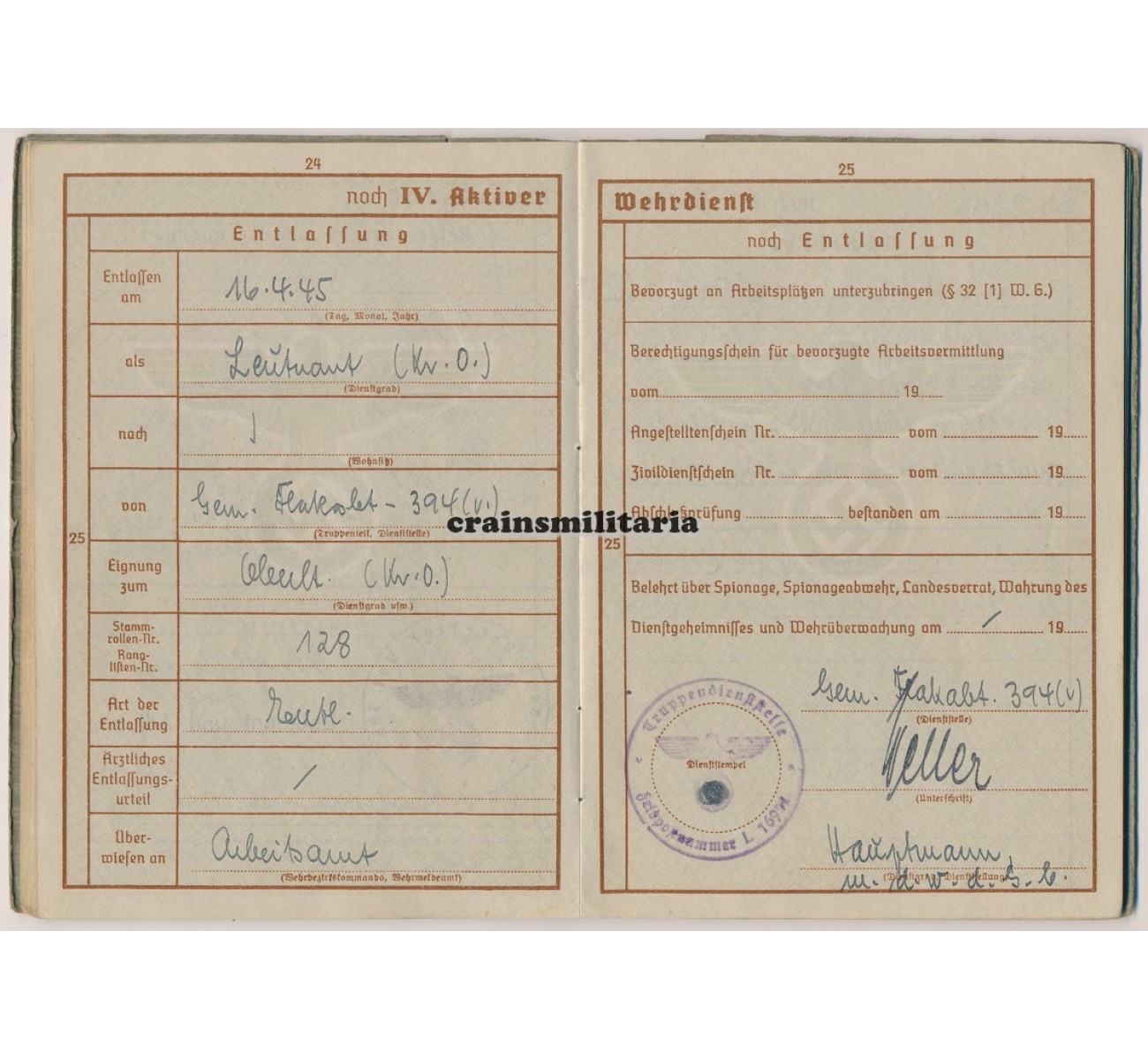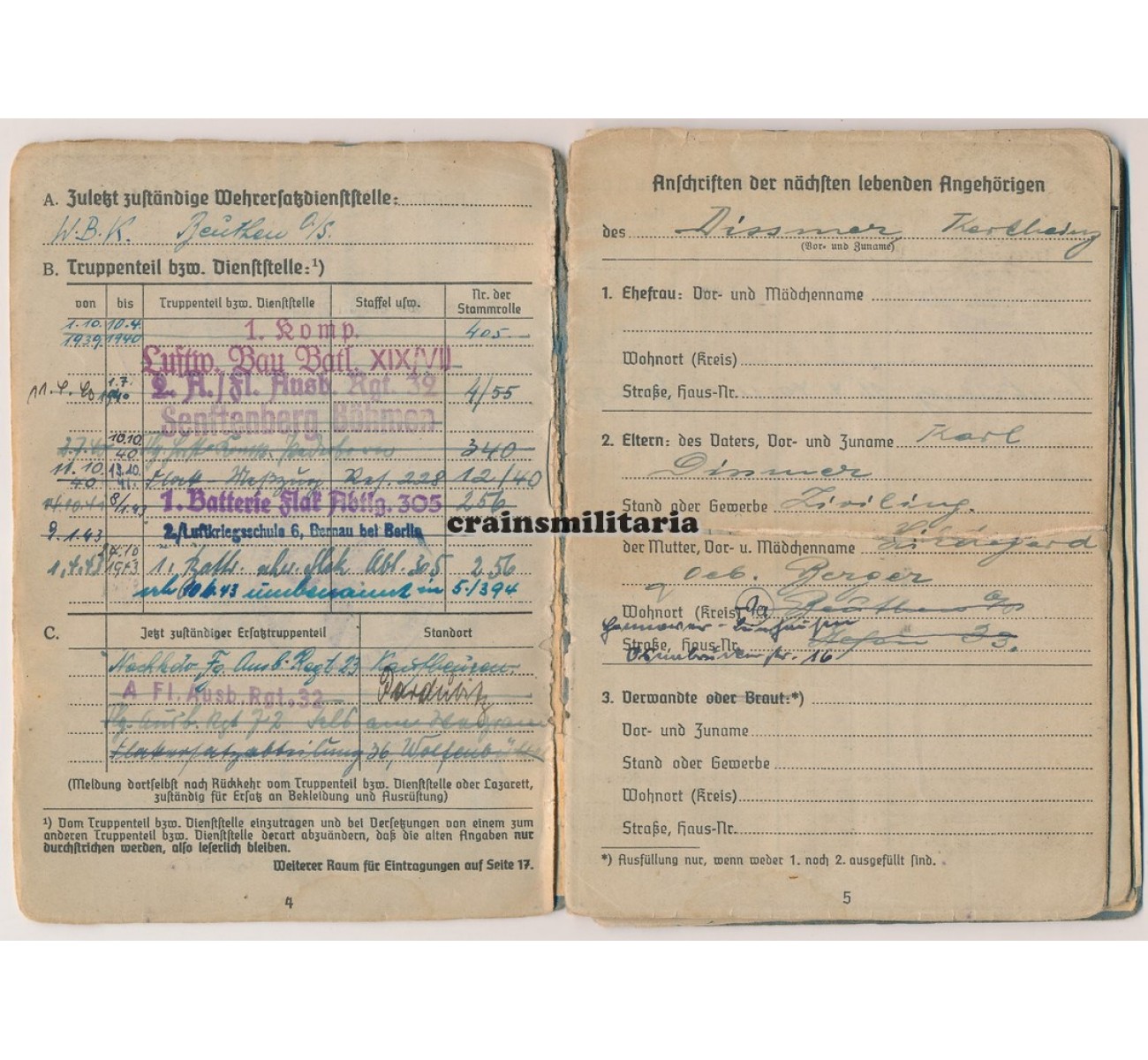 - Soldbuch and Wehrpass grouping to Leutnant Karl Dissmer. The son of a civil engineer from Kattowitz (Silesia, now Poland), Dissmer joined a Luftwaffe Bau-Bataillon in October 1939. It was not until one year later that he reached his final branch of service: the anti-aircraft artillery. He was a year with the Reserve-Flakmesszug 228, then two years with Flak-Abteilung 305, until it was October 1943 reformed into schwere Flak-Abteilung 394. All this time, he served within the Reich, protecting the industry near Duisburg. By September 1943 he was promoted to Leutnant. In 1944, he followed infantry training on the Truppenübungsplatz Elsenborn (now Belgium), and later an Erdkampf training in Podhradik, Slovakia.
