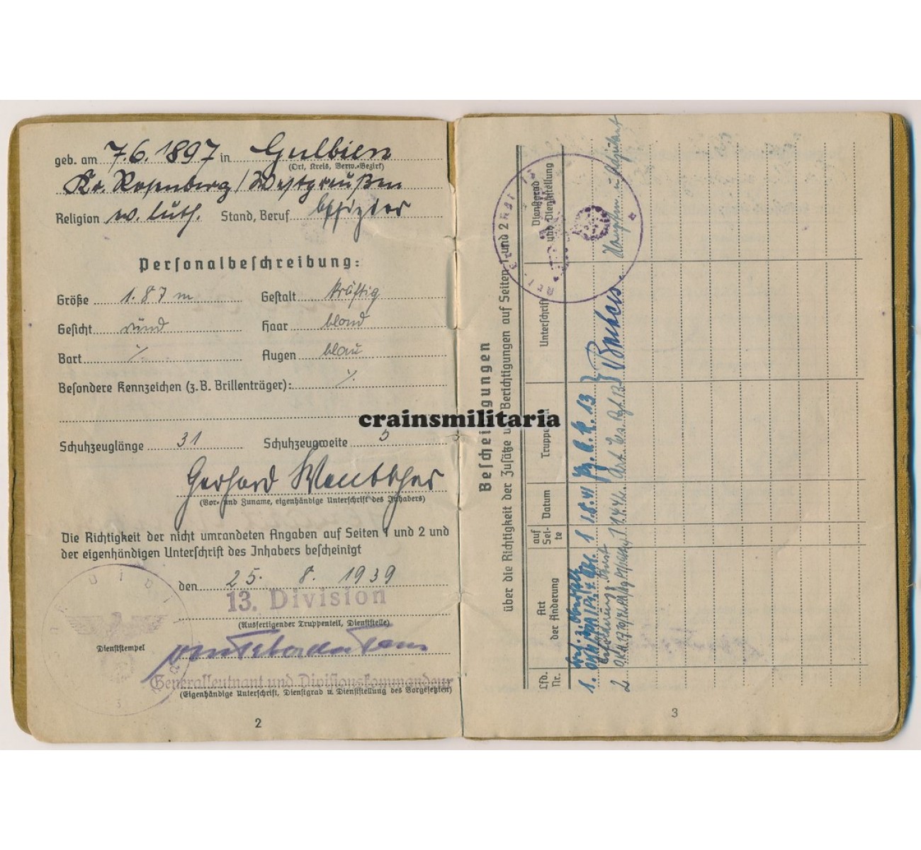 - The Soldbuch features a large portrait photo that will likely be one of the very best you will ever see. Wentscher is holding a telephone (completely against regulations for Soldbuch photos) and is wearing his DKiG and other awards. Soldbuch was opened August 1939 by Generalleutnant Moritz von Faber du Faur, divisional commander. It is complete and remains in very good condition.