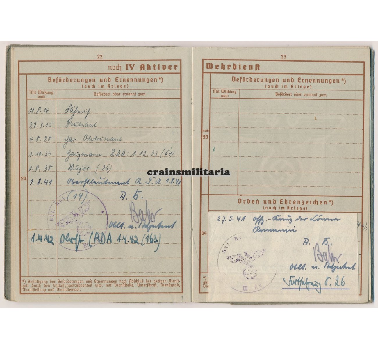 - The Wehrpass also has a military portrait photo of Wentscher, showing his WWI EK1. Opened in January 1941, the Wehrpass is also in excellent and complete condition, listing all his awards, battles and assignments.