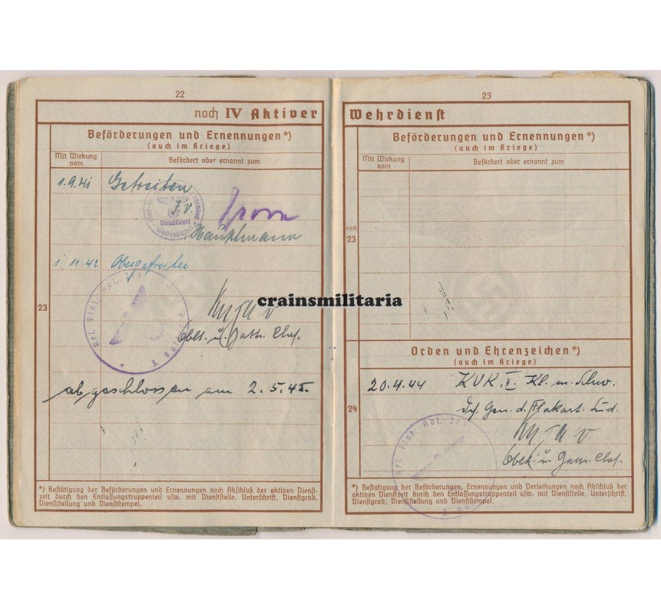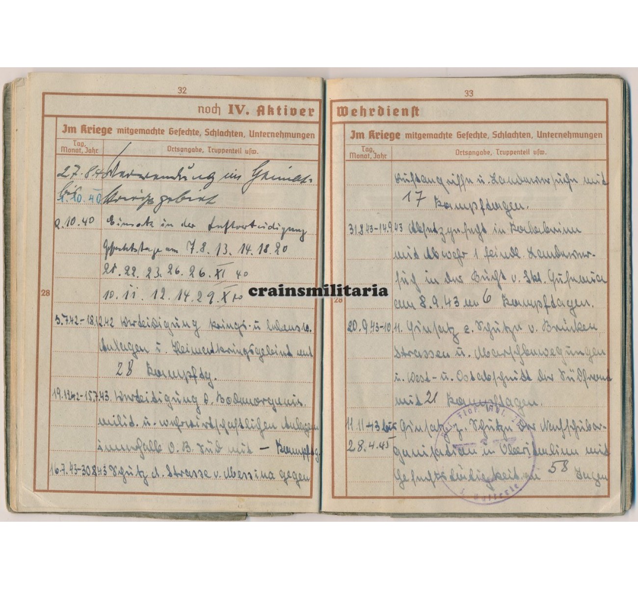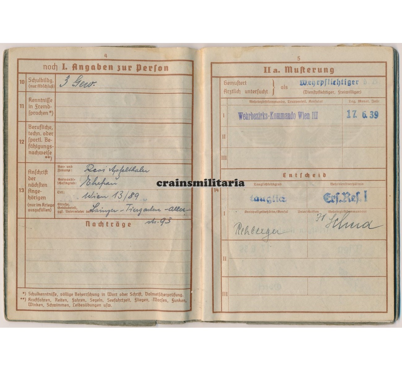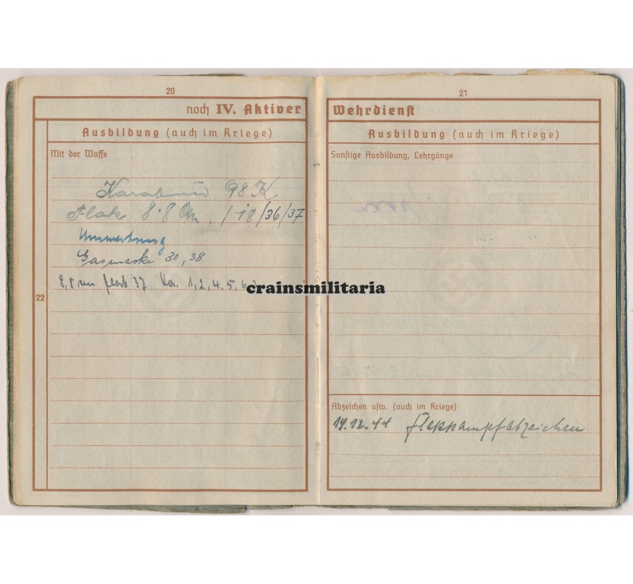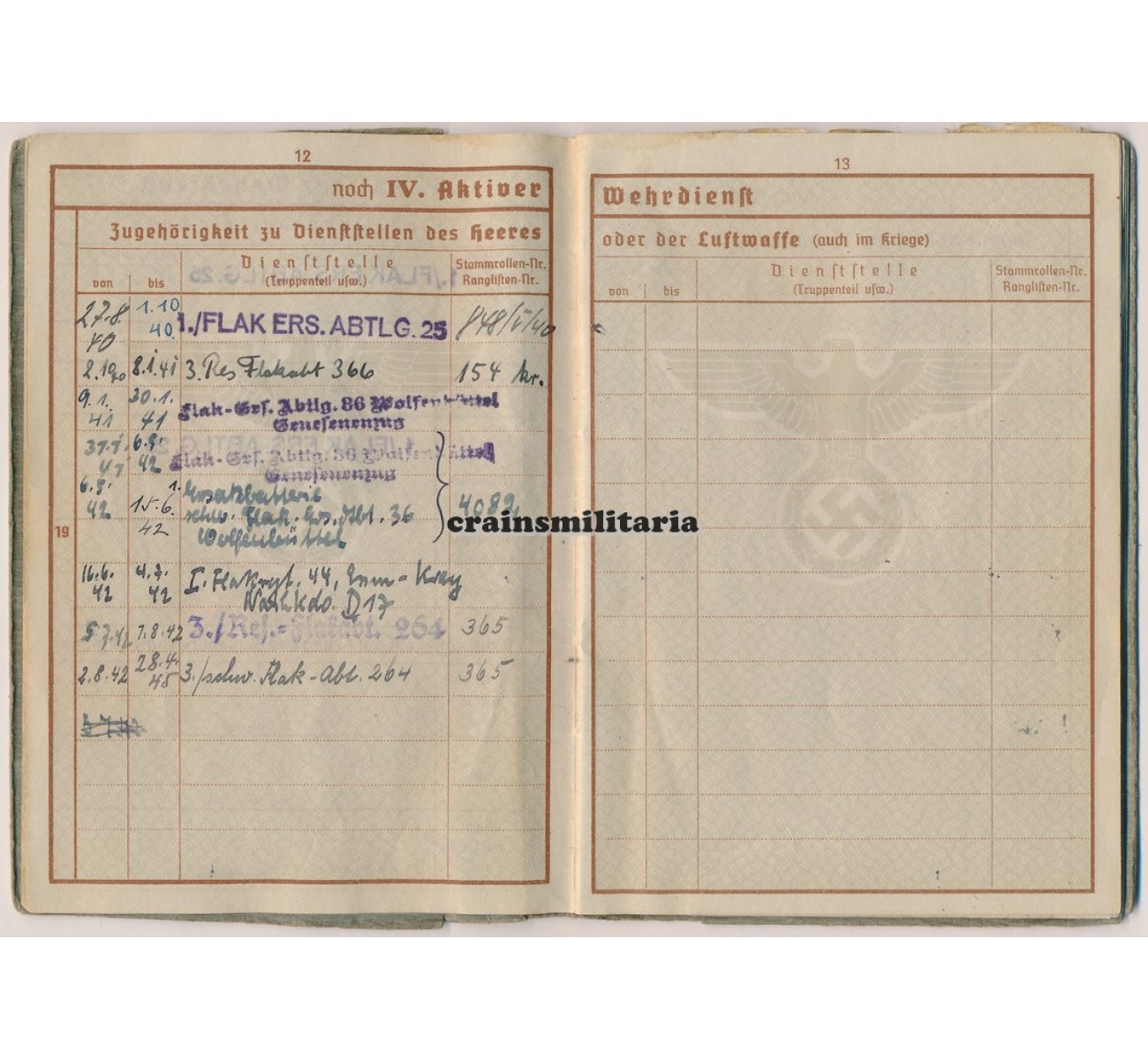 - Wehrpass to Obergefreiter Hermann Apfelthaler from Vienna, Austria. He served with different (heavy) anti-aircraft units from 1940 until the end of the war. He was first with Reserve-Flak-Abteilung 366 in Dorsten, then with reserve Flak units in Wolfenbüttel. From August 1942, he was with schwere Flak-Abteilung 264, which was moved to Sicily in February 1943. His 3. Batterie stayed on the Italian front - the other 2 Batteries were transported to Africa and destroyed there little later. Some interesting battle entries relate to the protection of the street of Messina and the Allied landing there, and the defense against another landing in Calabria. The Abteilung then retreated through the Italian mainland to northern Italy where it arrived in Verona in March 1944, staying in that area until the final stage of the war. For his actions on the Italian front, Apfelthaler received the KVKII in April 1944 and the Flak-Kampfabzeichen in December 1944.