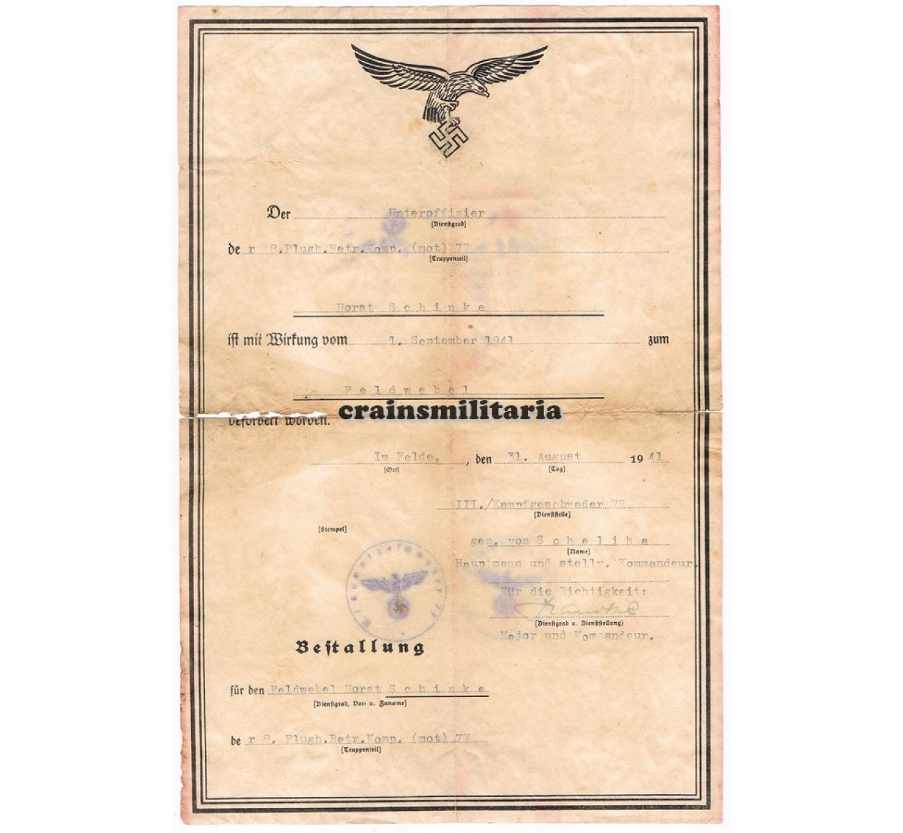 - Promotion document to Feldwebel, signed by Major Ernst-Günther von Scheliha, Gruppenkommandeur III/KG77.
