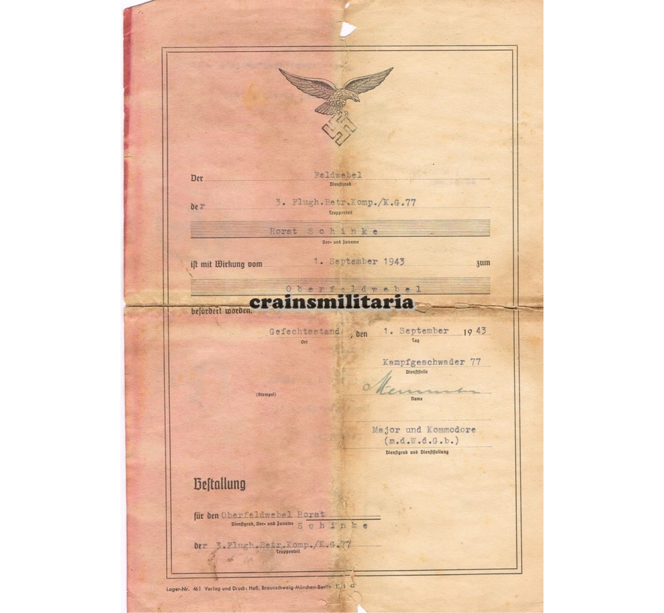 - Promotion document to Oberfeldwebel, signed by Major Wilhelm Stemmler, Ritterkreuzträger and Kommodore KG77.