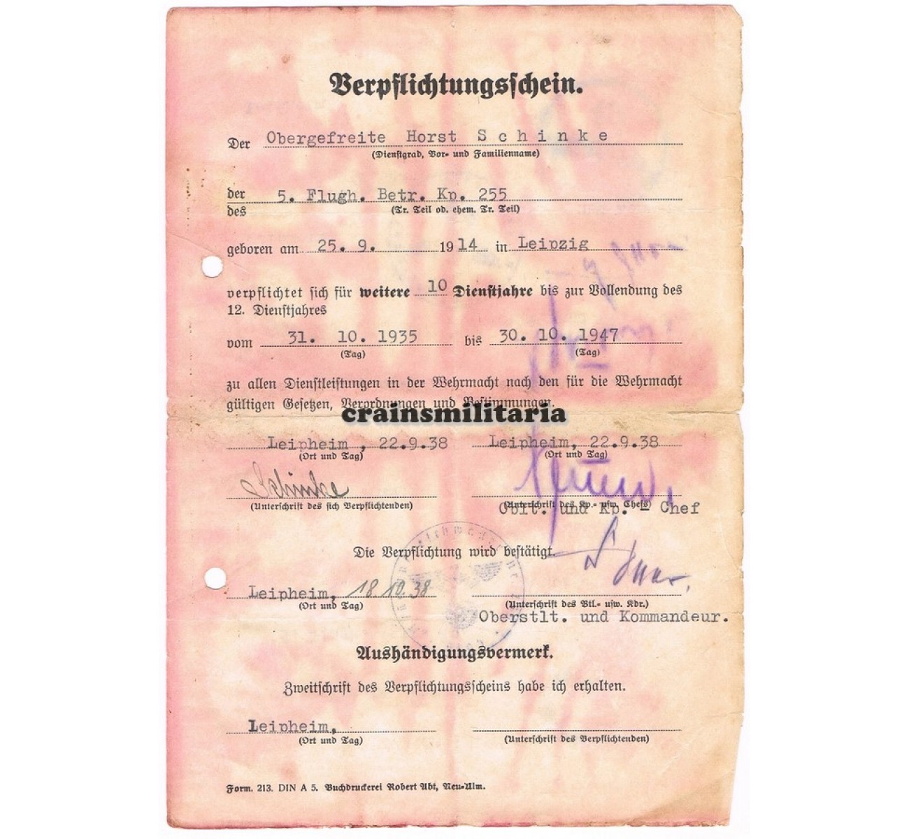 - Verpflichtungsschein for 10 years of service, 1938, signed by the commander of Kampfgeschwader 255.