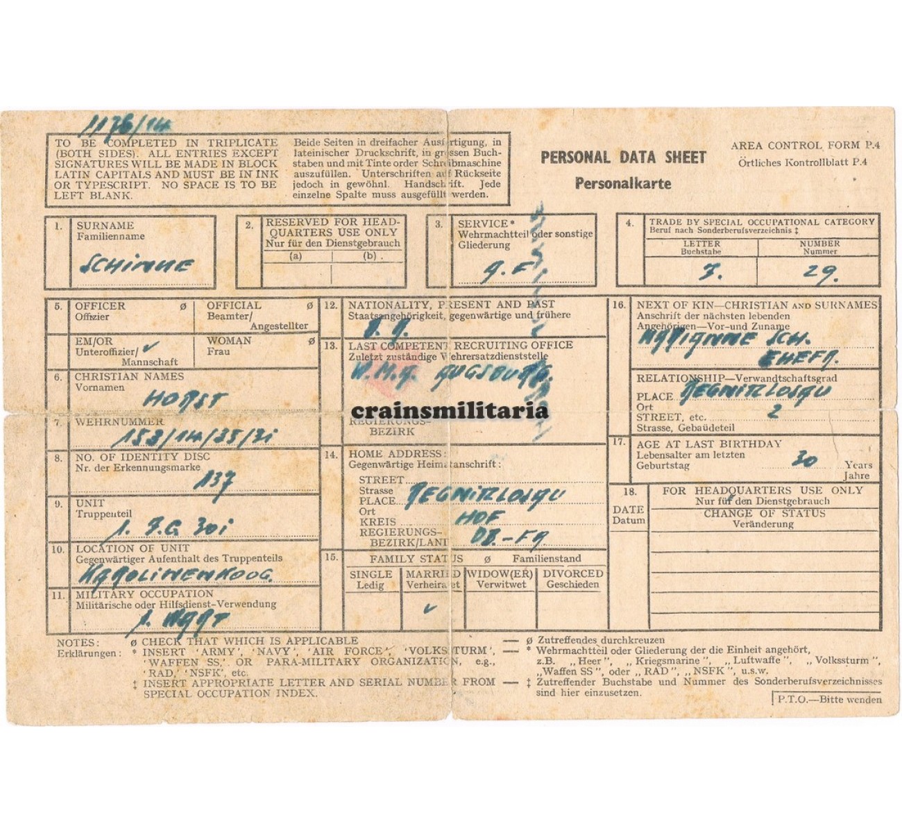 - Personal data sheet as Allied POW.