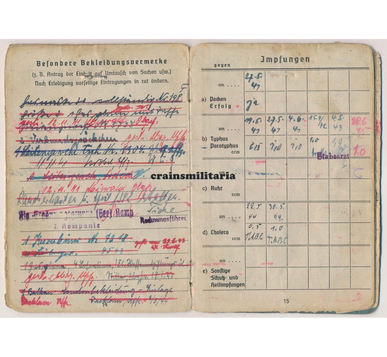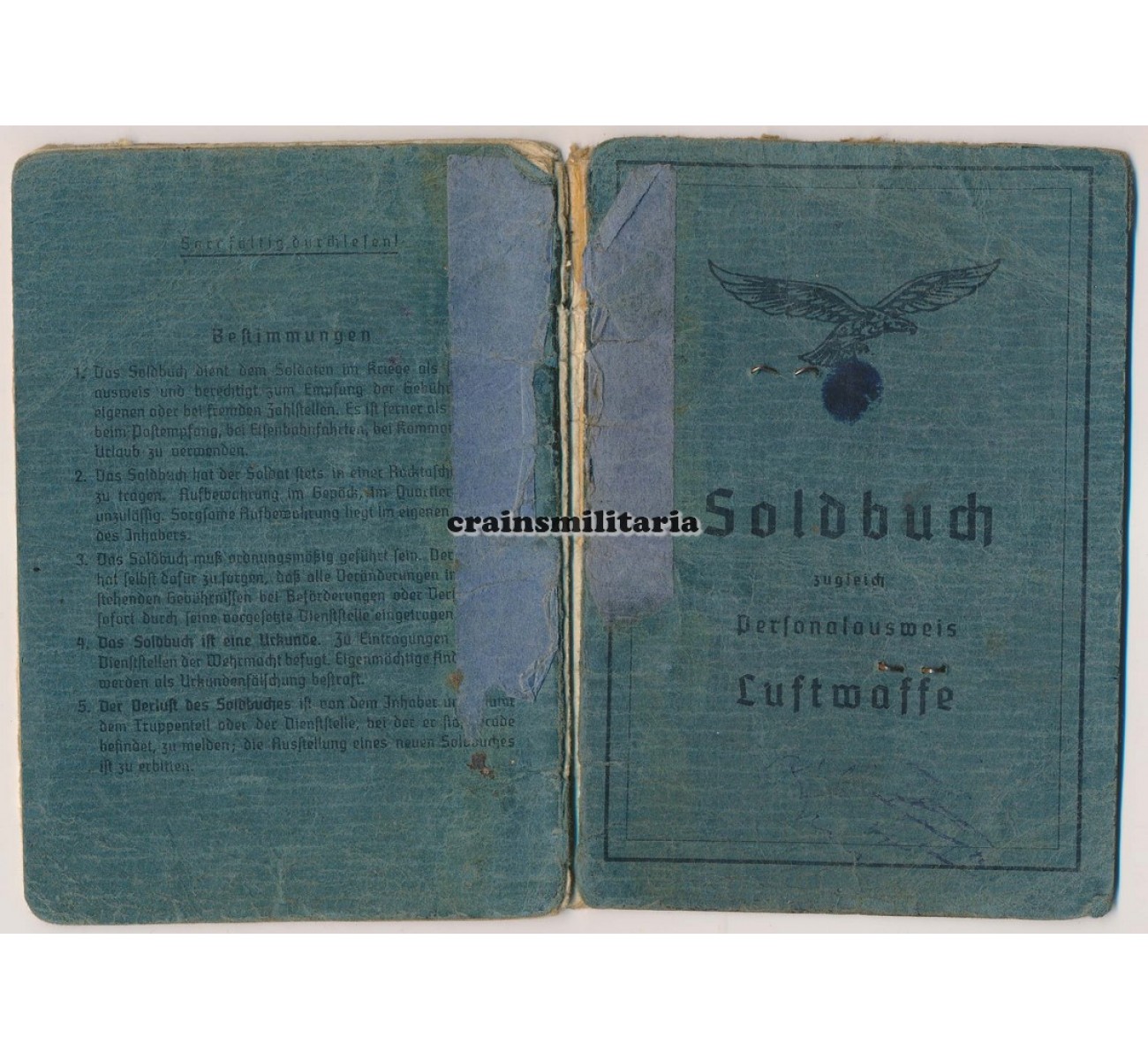- Soldbuch in good condition, though the cover is loose, but a 100% complete with all pages and the portrait photo. Interesting entries include a private P.08 Luger pistol, the "Fliegendes Personal" marking on page 1, and special pilot equipment such as "Flieger-Schuhe mit erhöhter Schacht" and a "Balkan-Sonderbekleidung".