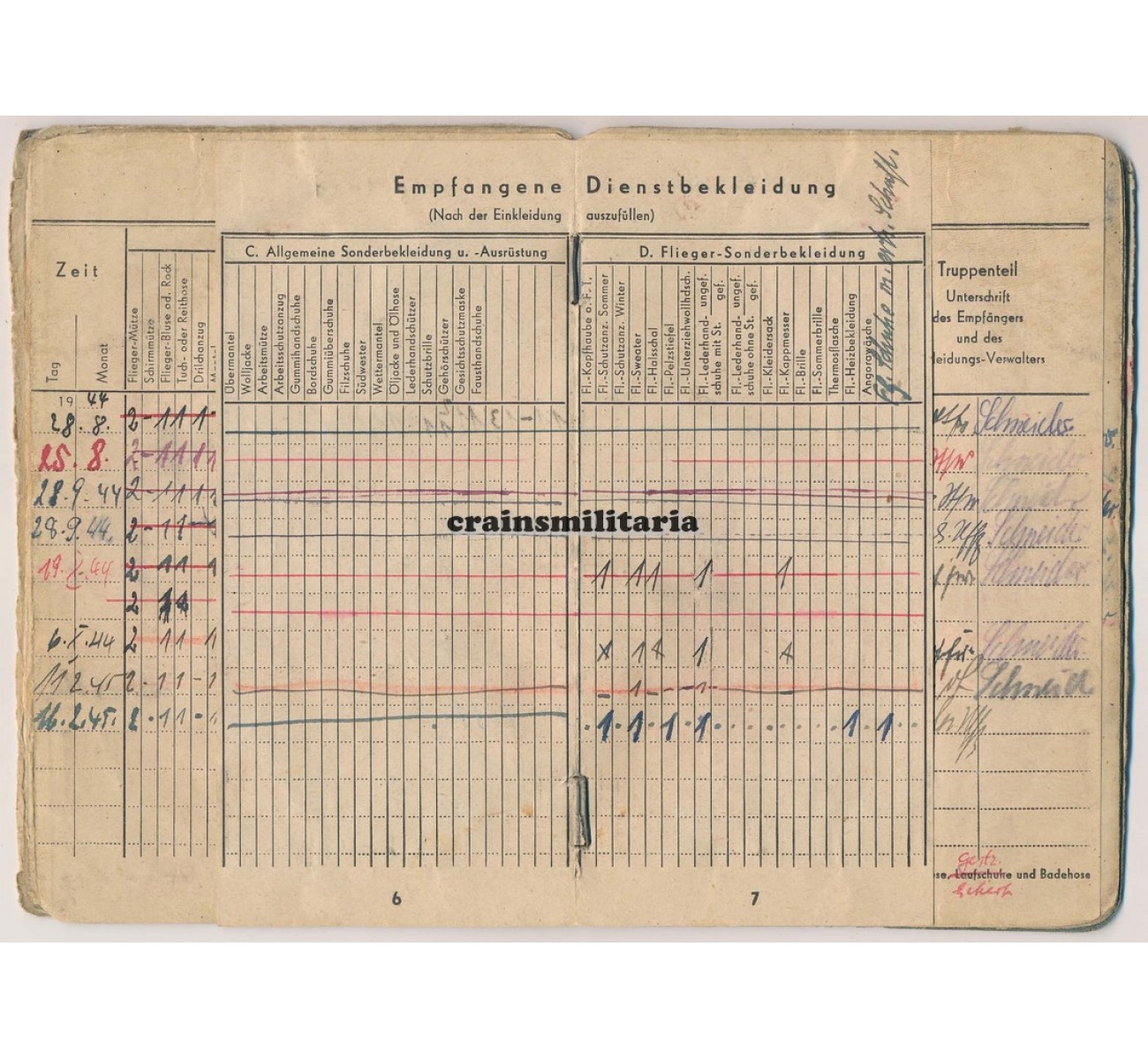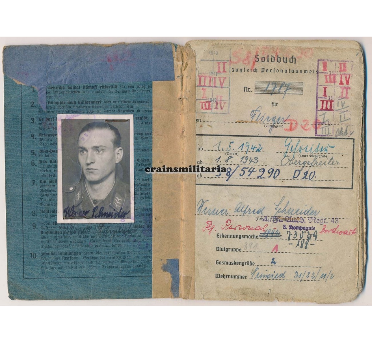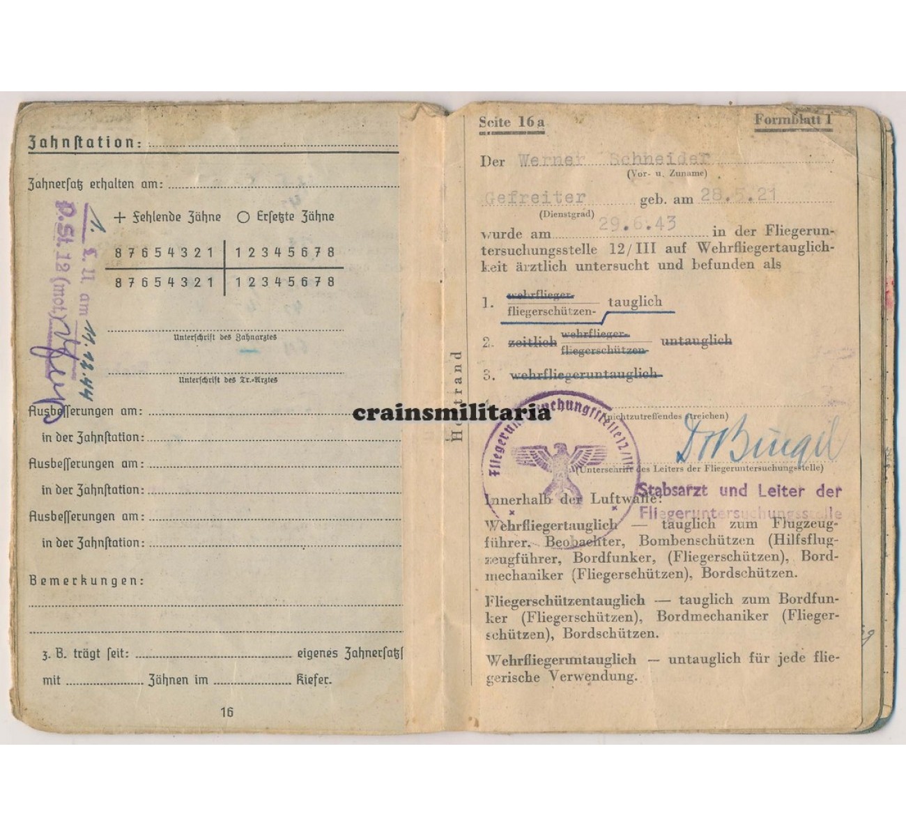 - Soldbuch to Obergefreiter Werner Schneider. First issue from May 1941. Called up by the Luftwaffe that month, Schneider was trained to serve as a Bordwart (mechanic on board) on sea reconnaiscance planes. In January 1942 he was sent to the 1. Staffel of Aufklärungsgruppe 125 (See), at that time based in Billefjord, Norway. When this Gruppe was moved from Norway to the Krim, Schneider stayed with the Ergänzungs-Küstenfliegerstaffel until in May 1944 he was sent to a front unit again: the 1. Staffel of Seeaufklärungsgruppe 131, based on the Black Sea (Varna, Sewastopol). He ended the war with the 3. Staffel of Seeaufklärungsgruppe 126, flying with Arado Ar 196 from the island Rügen. Schneider was awarded the Fliegerschützenabzeichen ohne Blitzbündel in April 1944.