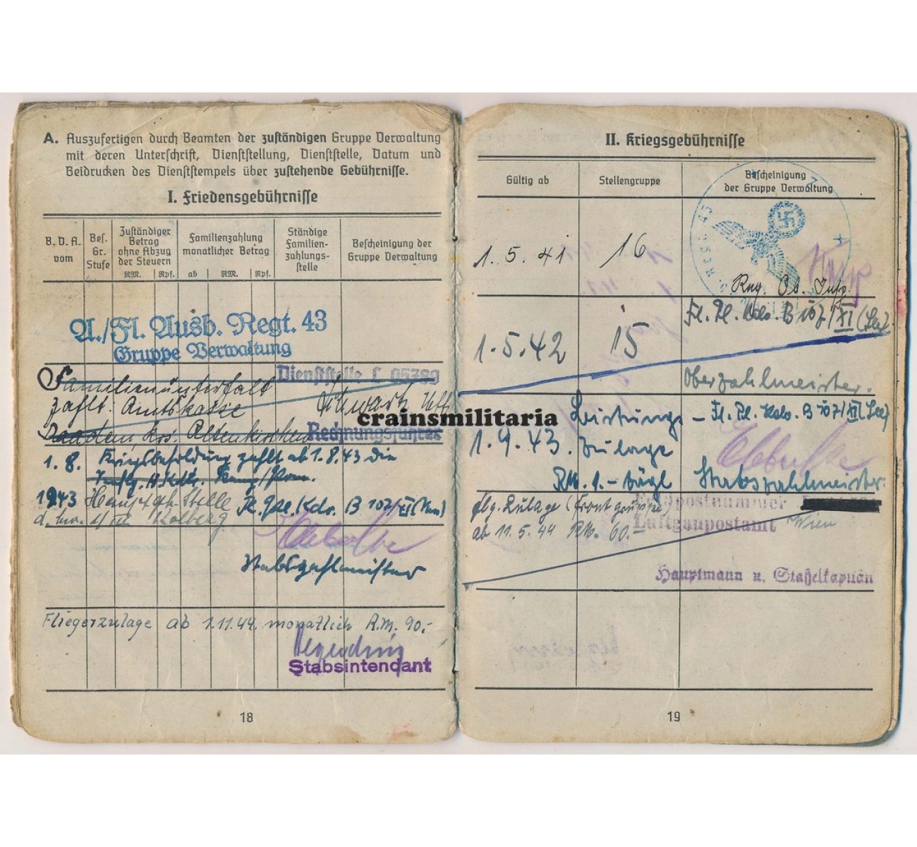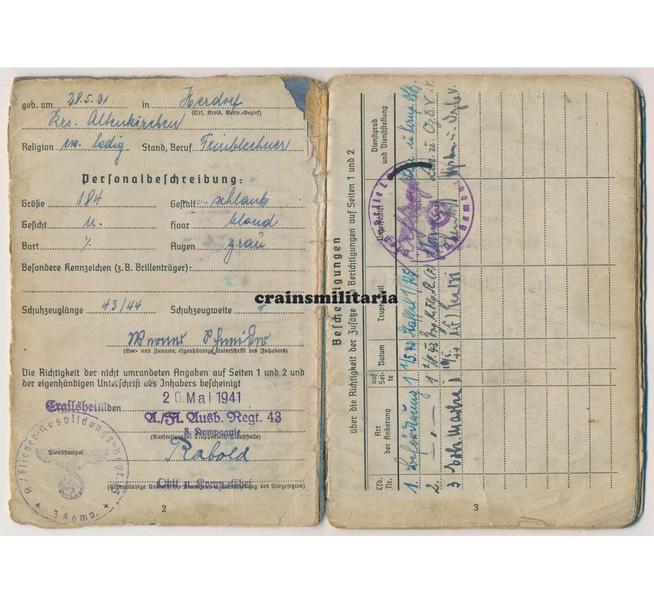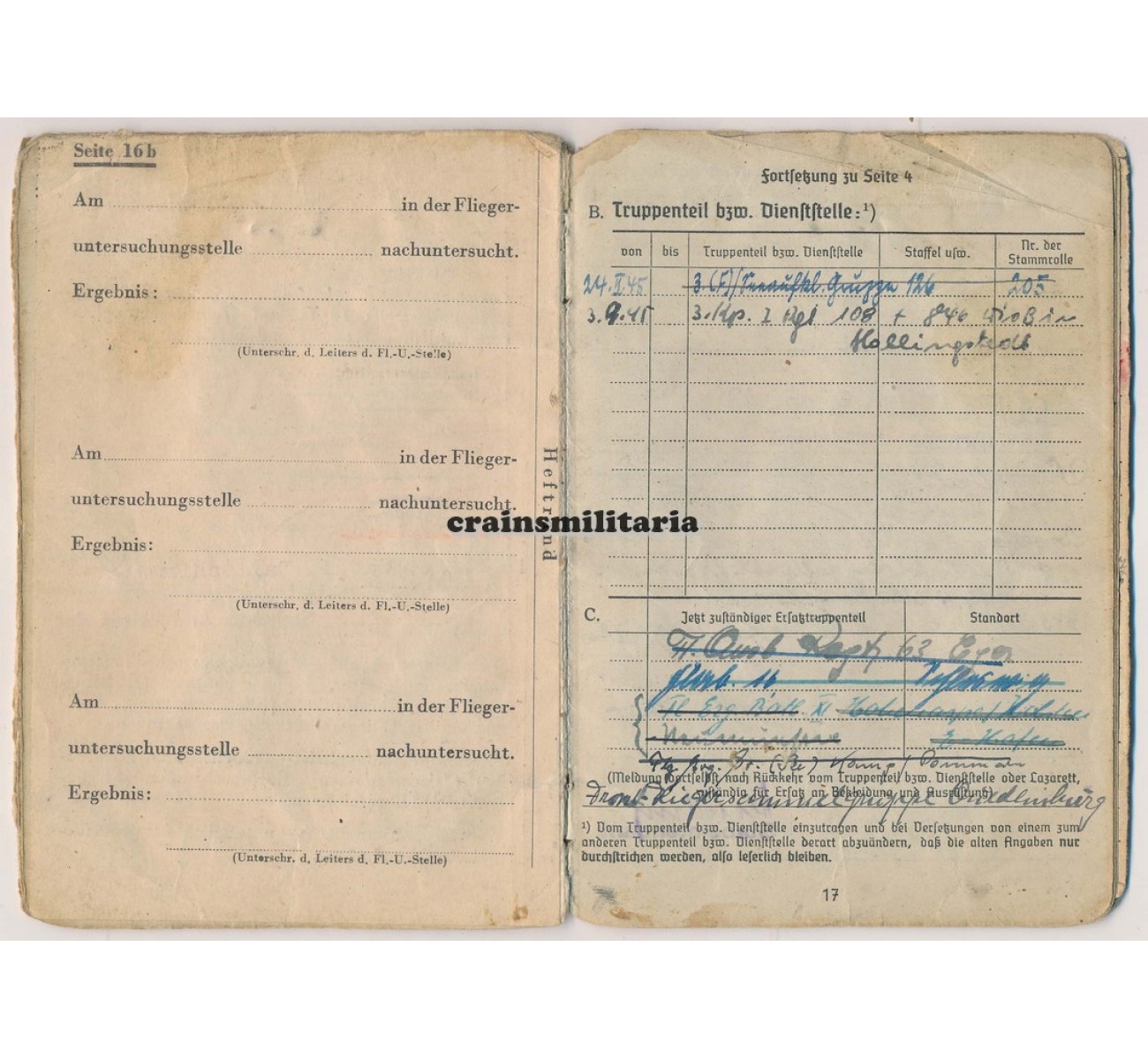 - Soldbuch to Obergefreiter Werner Schneider. First issue from May 1941. Called up by the Luftwaffe that month, Schneider was trained to serve as a Bordwart (mechanic on board) on sea reconnaiscance planes. In January 1942 he was sent to the 1. Staffel of Aufklärungsgruppe 125 (See), at that time based in Billefjord, Norway. When this Gruppe was moved from Norway to the Krim, Schneider stayed with the Ergänzungs-Küstenfliegerstaffel until in May 1944 he was sent to a front unit again: the 1. Staffel of Seeaufklärungsgruppe 131, based on the Black Sea (Varna, Sewastopol). He ended the war with the 3. Staffel of Seeaufklärungsgruppe 126, flying with Arado Ar 196 from the island Rügen. Schneider was awarded the Fliegerschützenabzeichen ohne Blitzbündel in April 1944.