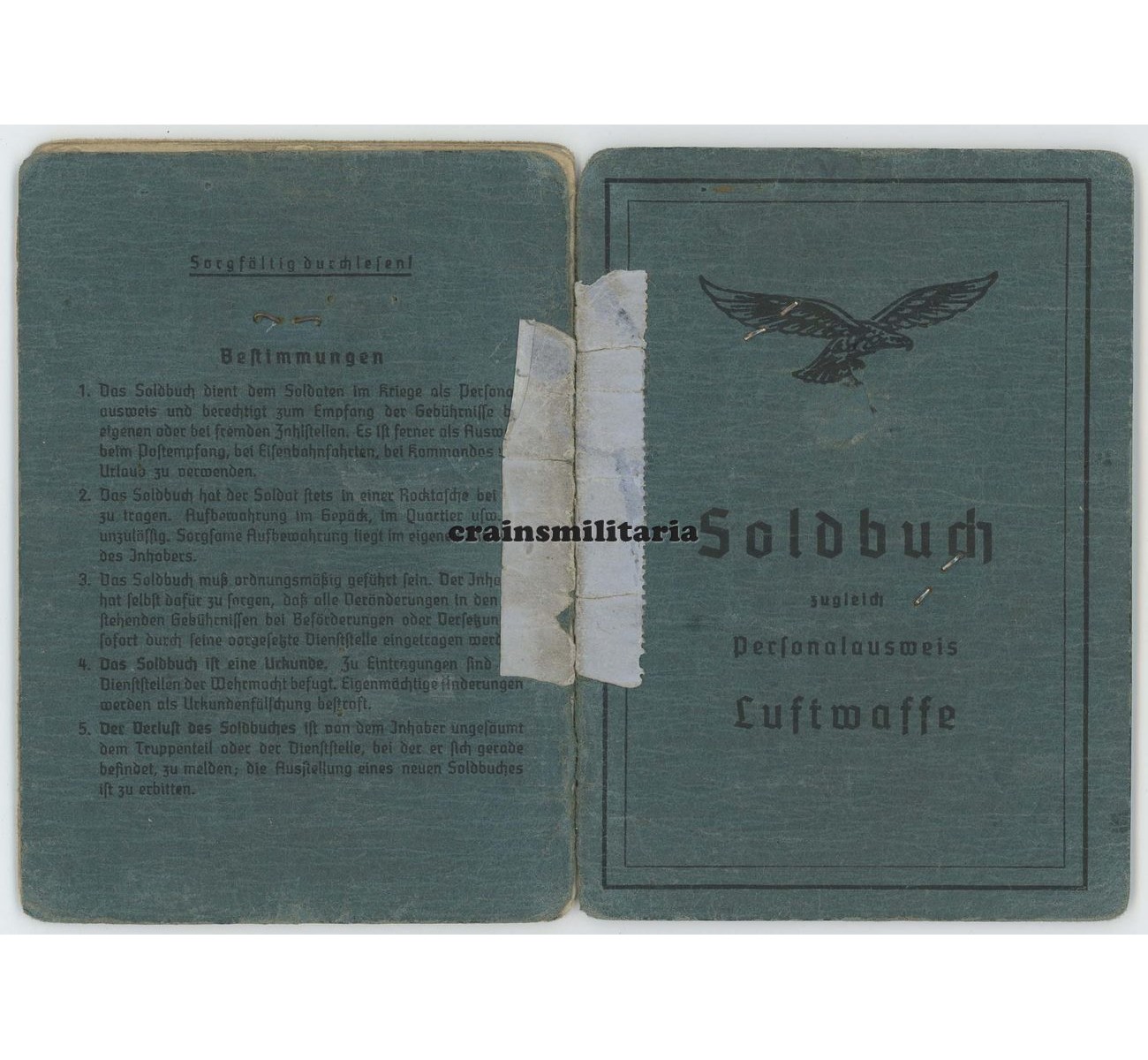 - Soldbuch in good condition, the cover is loose but a 100% complete and packed with entries. Many interesting equipment and pilot specific entries like extra "Fliegerzulage" pay, Jagdhose and Jagdbluse, a watch ("Luftwaffen-Uhr"), the Führergeschenk, and a Hungarian Frommer pistol on page 20. Original portrait photo inserted during his NJG4 time.