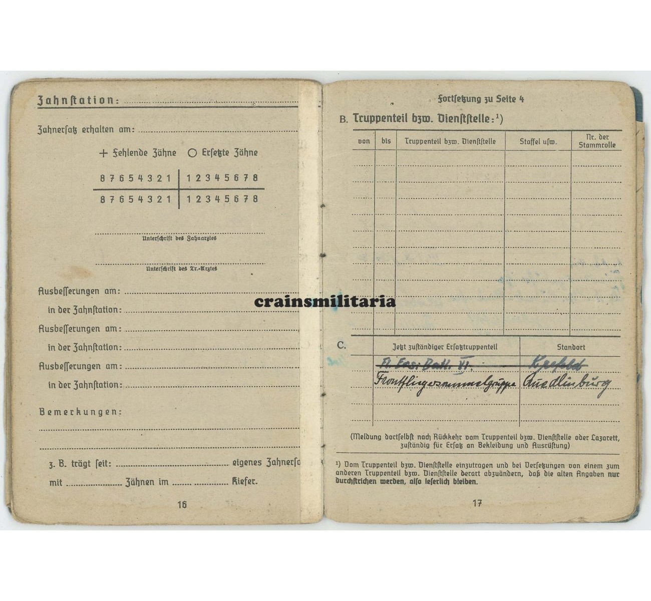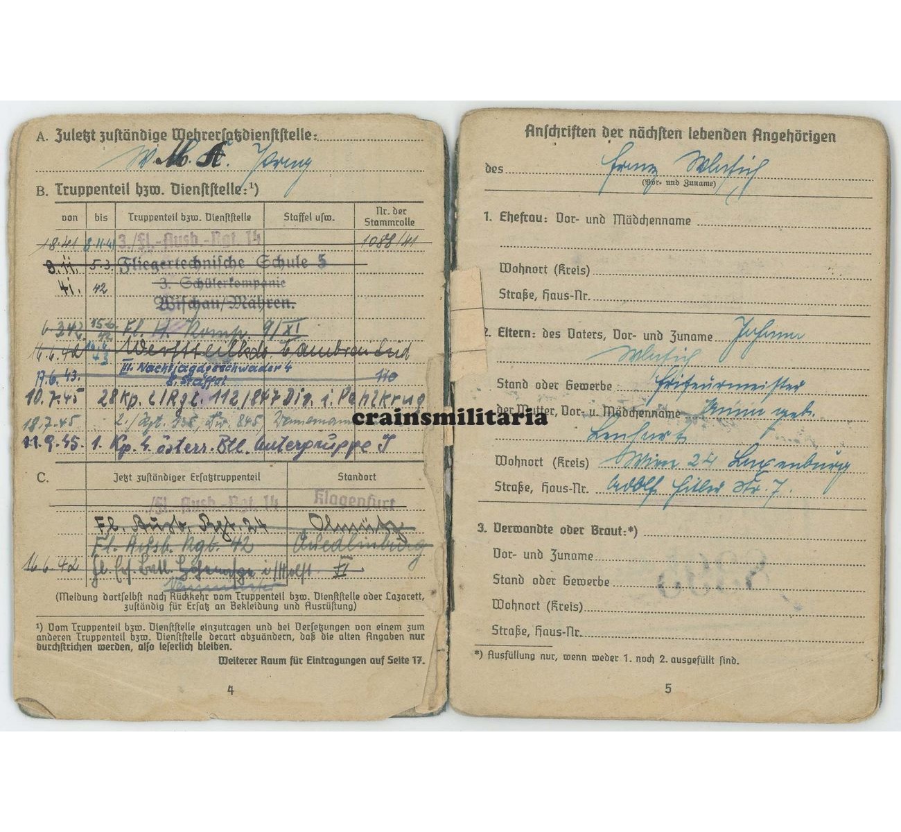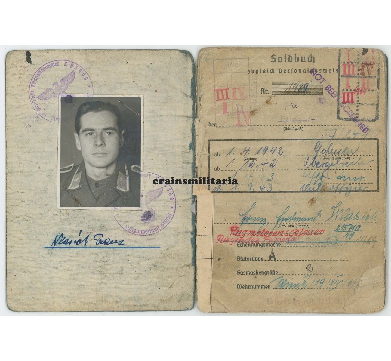 - Superb Soldbuch to Unteroffizier Franz Wlasich. First issue from September 1941. After his basic training and Fliegertechnische Schule, he moved to France in 1942 and served for an entire year on the Werftteilkommando Cambrai-Süd. In June 1943, he was transferred to a higher profile unit: the 8. Staffel of Nachtjagdgeschwader 4. The Staffel was located in Juvincourt, north of Reims, France. Though mainly used as a mechanic ("Flugmotorenschlosser"), he did serve on board of the Messerschmitt Bf 110s (plus Do 217 and Ju 88) as well, undoubtly as a Bordmechaniker. Notice the "Fliegendes Personal" entry on page 1.