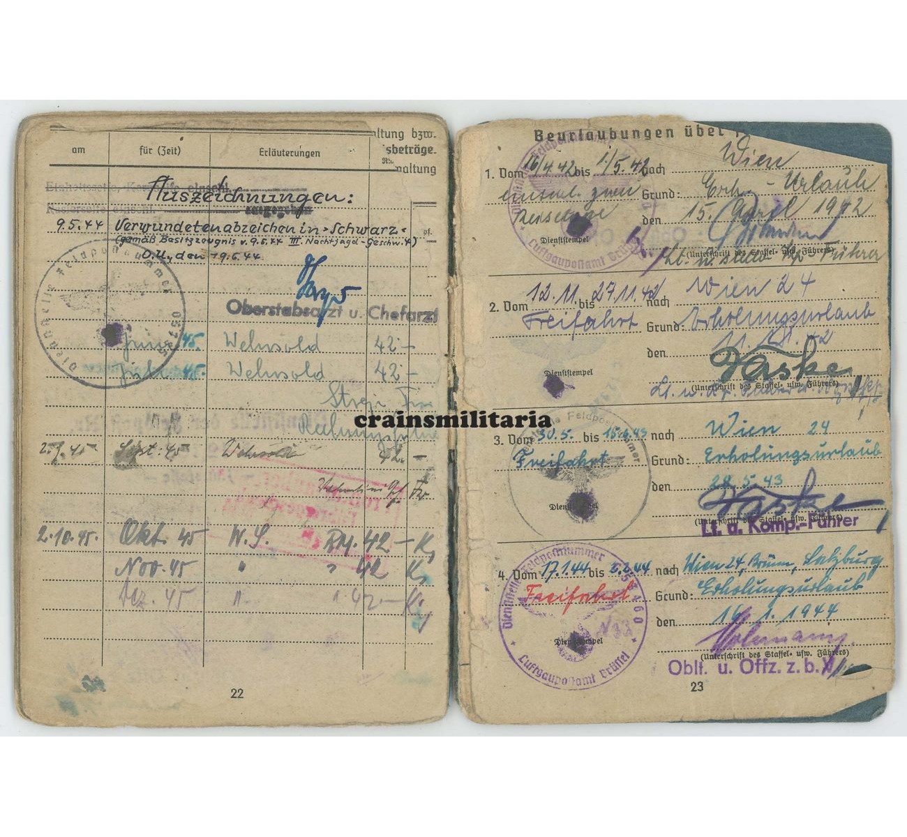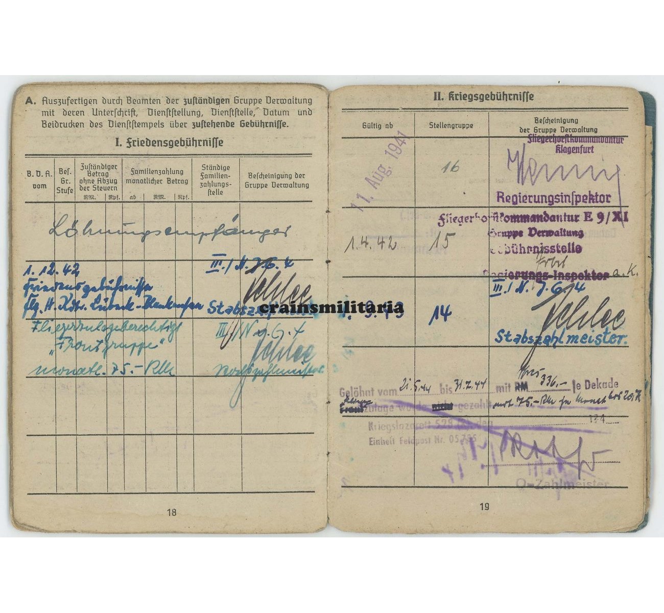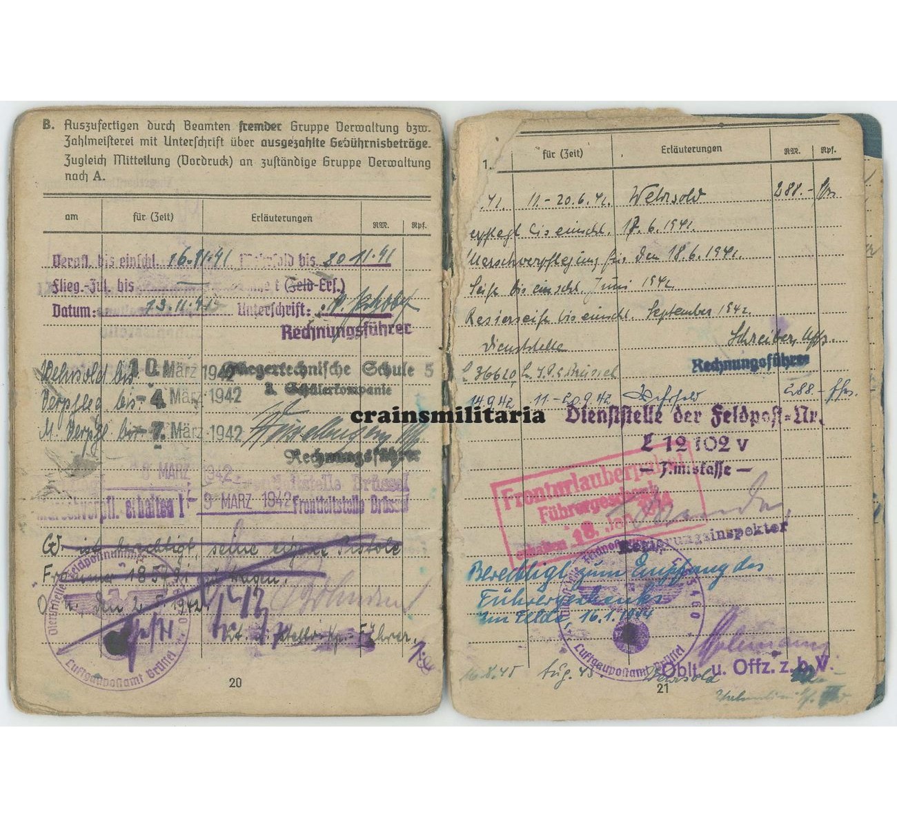 - Superb Soldbuch to Unteroffizier Franz Wlasich. First issue from September 1941. After his basic training and Fliegertechnische Schule, he moved to France in 1942 and served for an entire year on the Werftteilkommando Cambrai-Süd. In June 1943, he was transferred to a higher profile unit: the 8. Staffel of Nachtjagdgeschwader 4. The Staffel was located in Juvincourt, north of Reims, France. Though mainly used as a mechanic ("Flugmotorenschlosser"), he did serve on board of the Messerschmitt Bf 110s (plus Do 217 and Ju 88) as well, undoubtly as a Bordmechaniker. Notice the "Fliegendes Personal" entry on page 1.