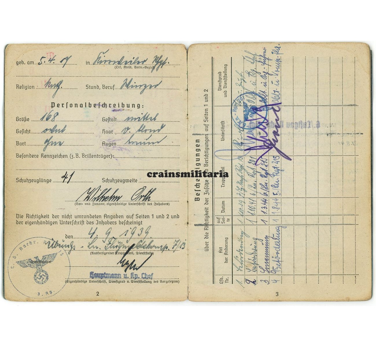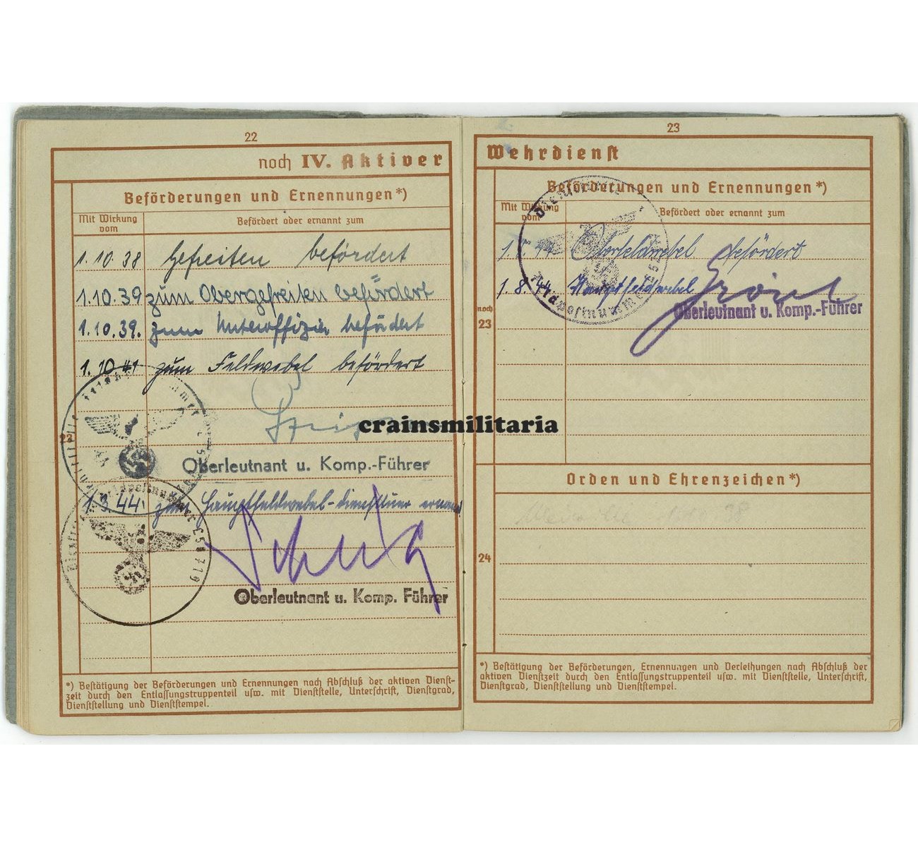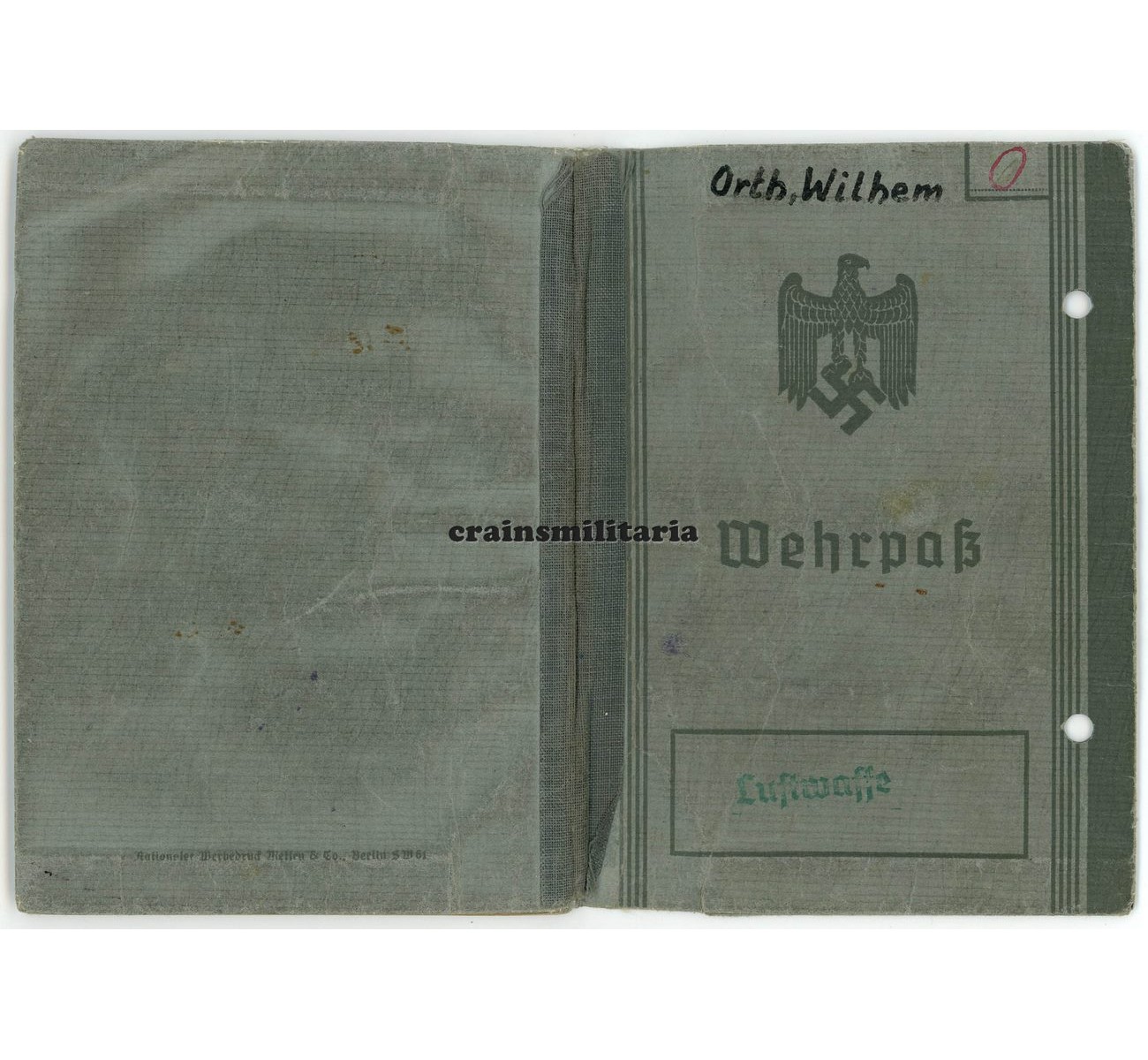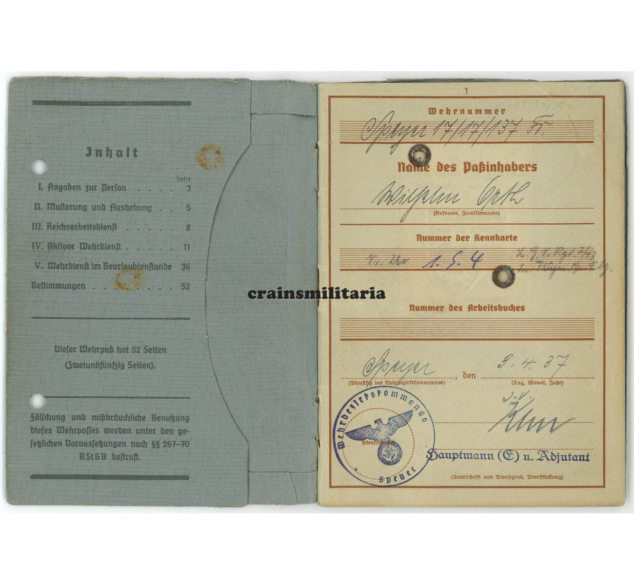 - Wehrpass, first issue from April 1937. Complete and very good condition. Interesting entries include the Nachtjagd battle entries, lots of training including the Freya radar, and a course followed in Brielle, on the Dutch coast near Hoek van Holland.