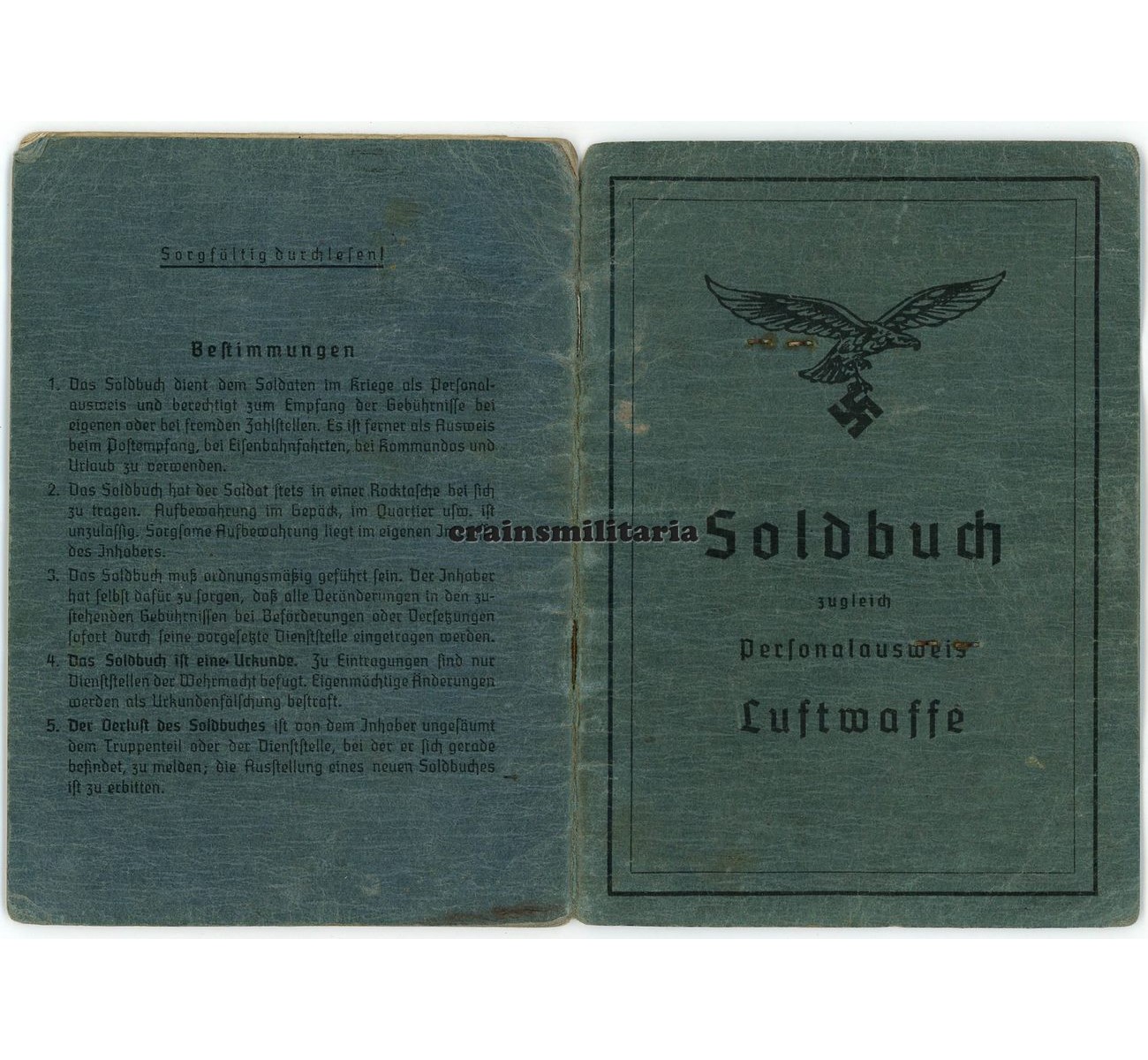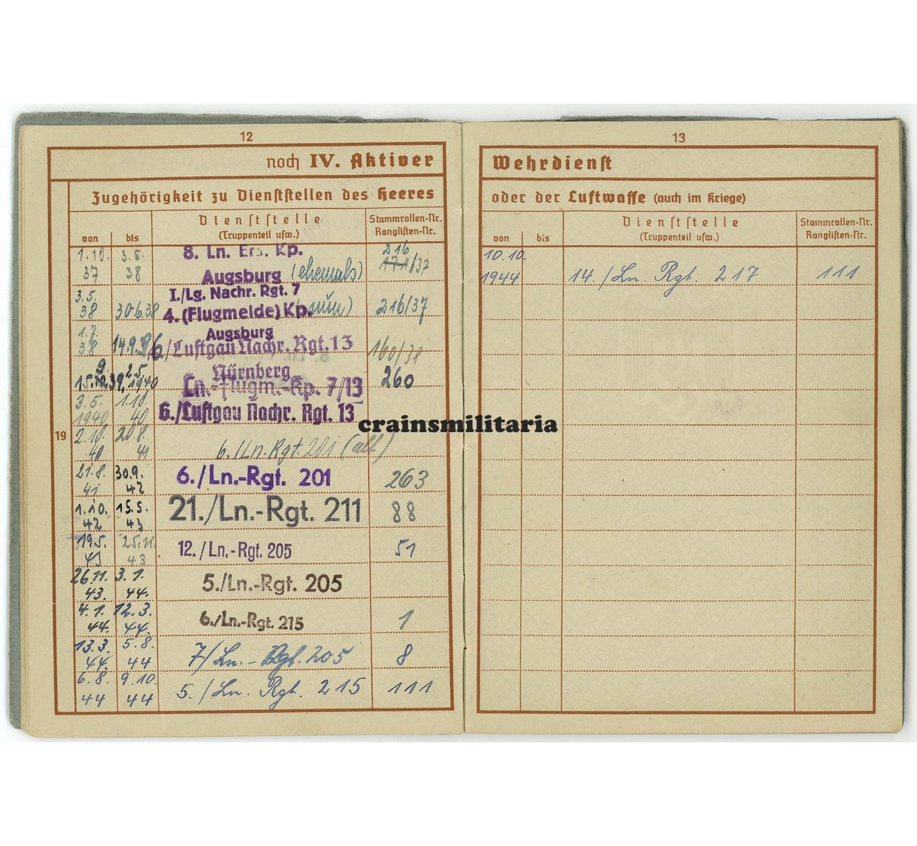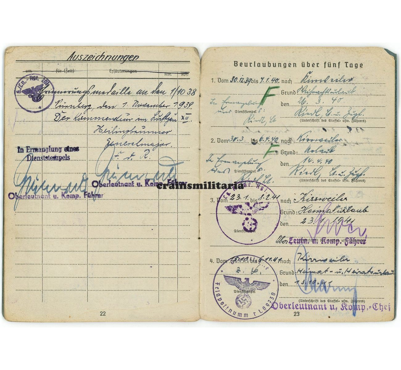 - Wehrpass, first issue from April 1937. Complete and very good condition. Interesting entries include the Nachtjagd battle entries, lots of training including the Freya radar, and a course followed in Brielle, on the Dutch coast near Hoek van Holland.