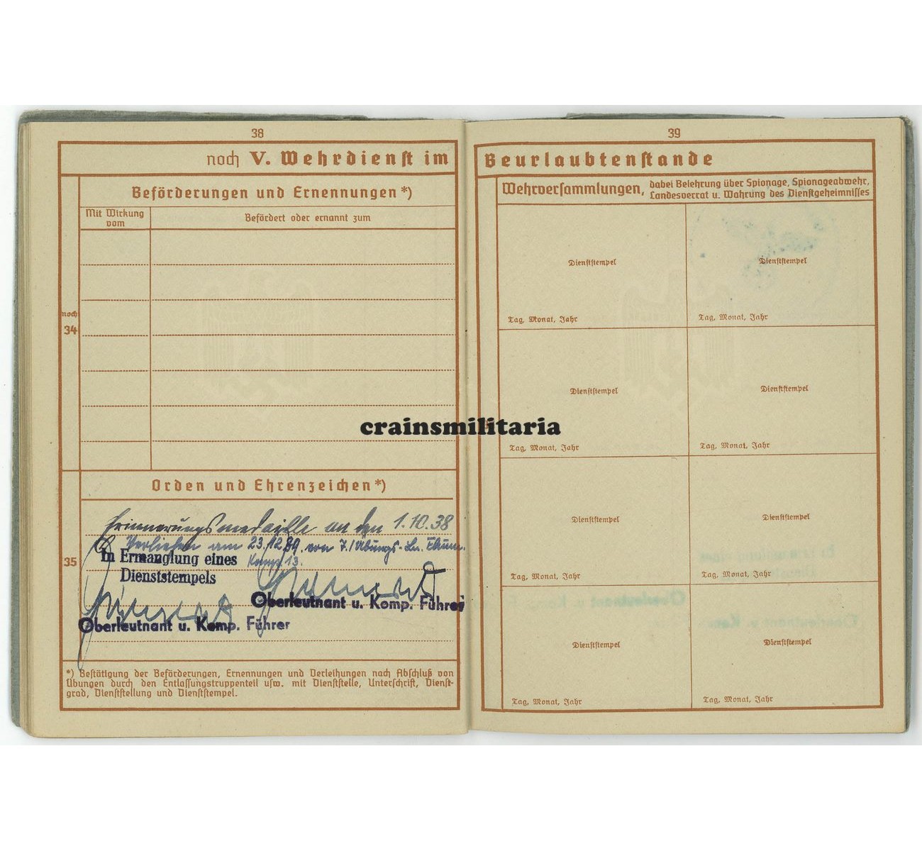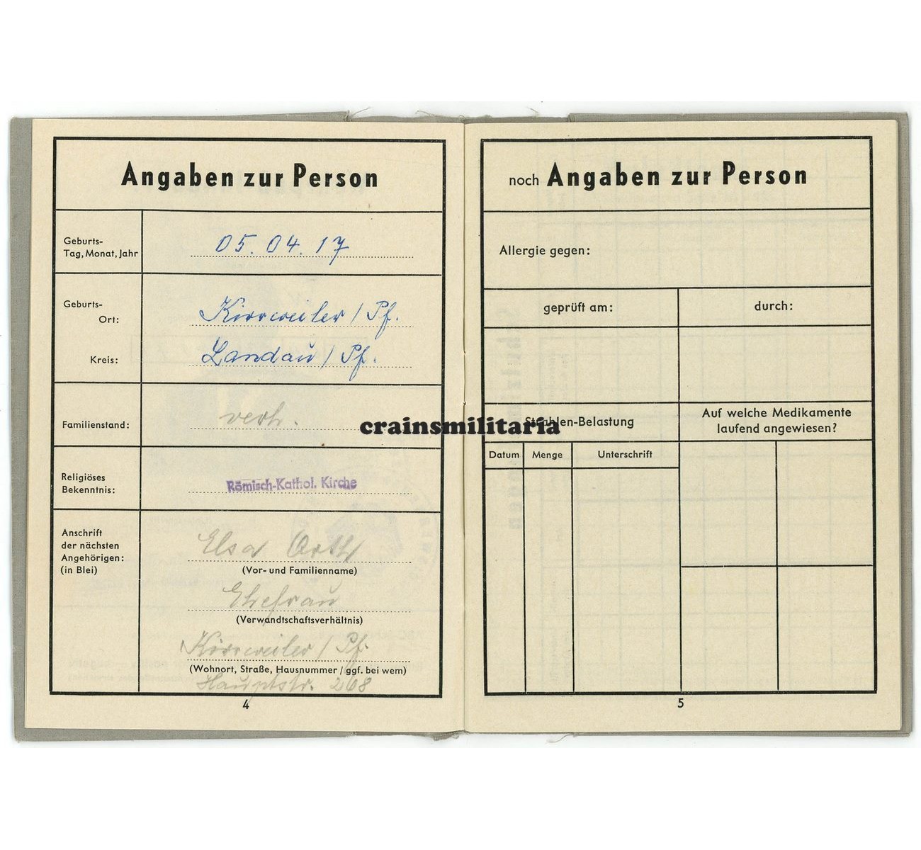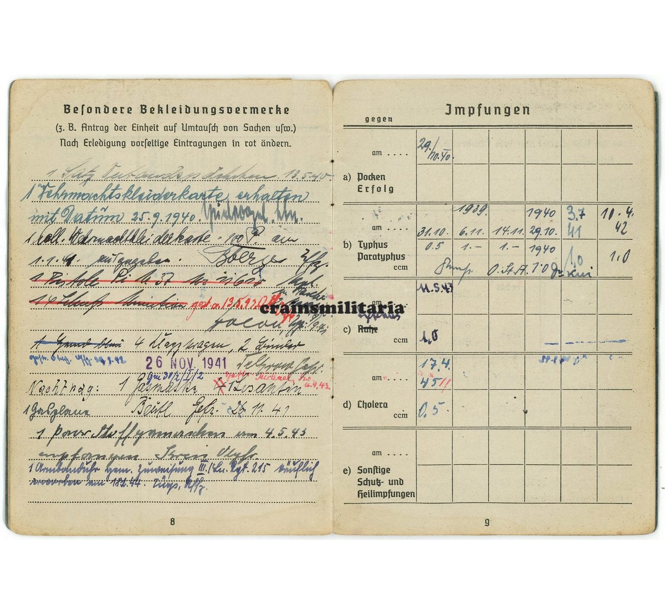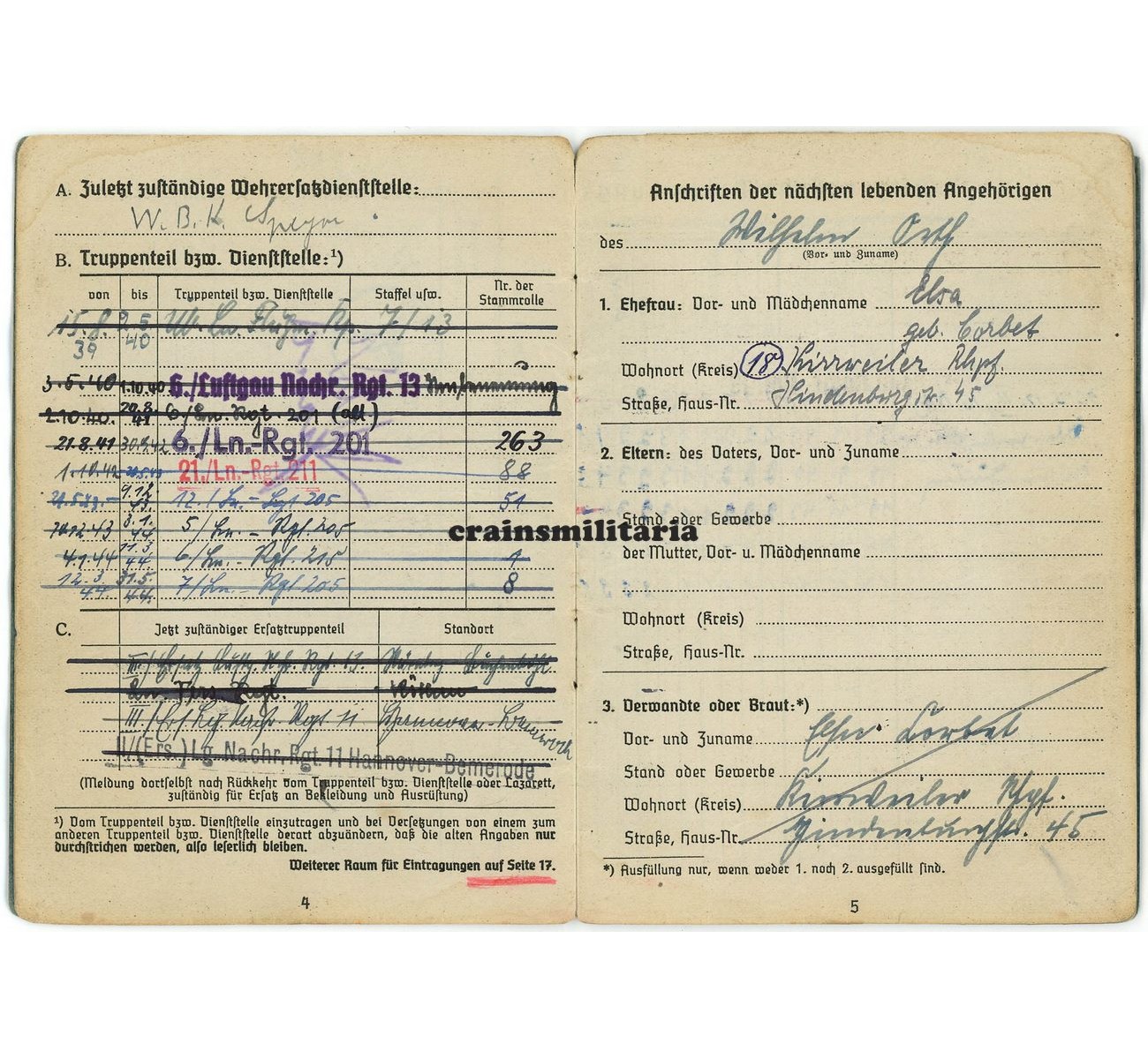 - Wehrpass, first issue from April 1937. Complete and very good condition. Interesting entries include the Nachtjagd battle entries, lots of training including the Freya radar, and a course followed in Brielle, on the Dutch coast near Hoek van Holland.