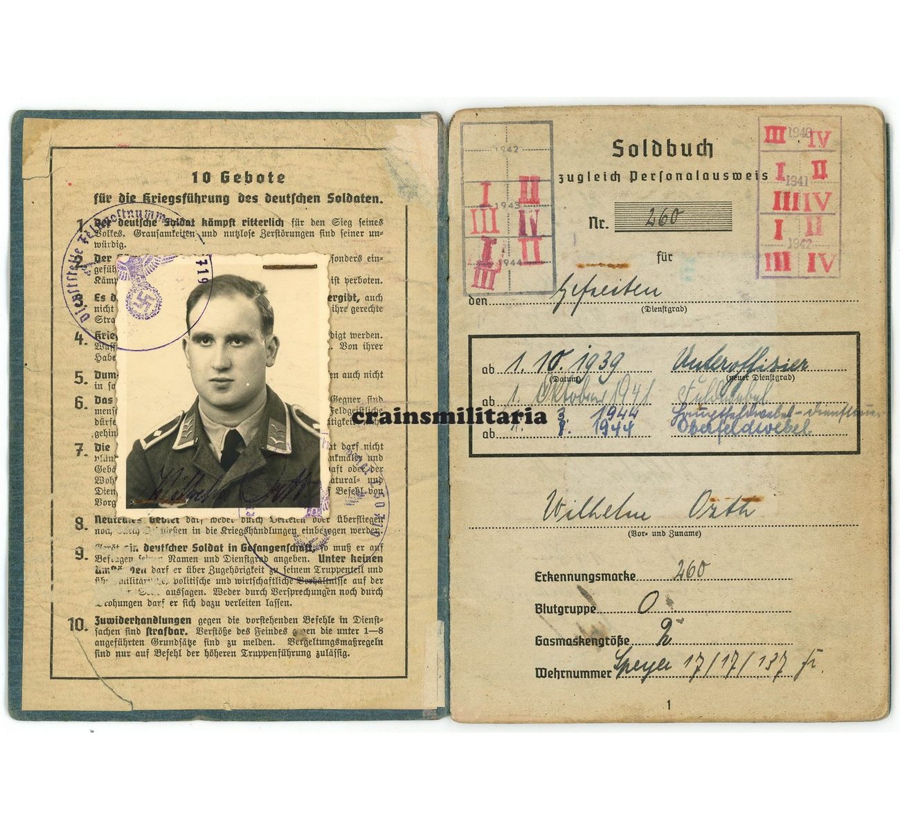 - Soldbuch, first issue from September 1939. Complete and very good condition with nice portrait photo. Interesting equipment entries include a M.37 pistol and a watch purchased from his unit.