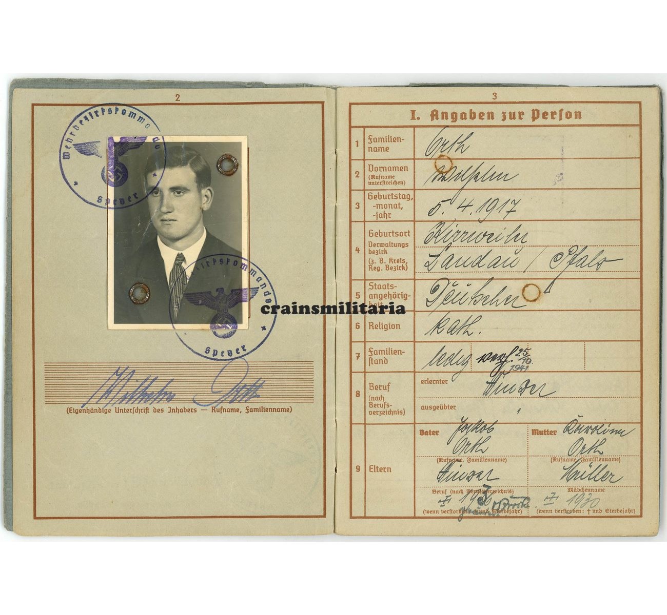 Soldbuch and Wehrpass grouping to Hauptfeldwebel Wilhelm Orth. Having lost both his parents before the age of 20, this young winemaker from the Pfalz area volunteered for the Luftwaffe in 1937. After completing his RAD service, he was trained as a Luftnachrichten soldier and signed for 12 years of service. Shortly after the war broke out, Orth was promoted to Unteroffizier. He participated in the Western campaign with Luftgau-Nachrichten-Regiment 13 in France. An interesting battle entry on page 32 of the Wehrpass proves his unit protected the Führerhauptquartier directly in the second part of June 1940. During the following years, Orth would mainly serve with the Luftnachrichten-Regimente 201, 211, 205, 215 and 217. These were all deployed in the West and back in the Heimat, protecting the Reich agains the Allied night fighters. Apart from the typical Luftnachrichten training, Orth received specialist education as Zugführer on the impressive Freya radar installations ("Freya-Gerätemann", "Gerätezugführer" on page 21 of the Wehrpass). In 1944, he was promoted to Hauptfeldwebel, and acted as "Der Spiess" in his Kompanie. He survived the war and was awarded the Czech annexation medal.