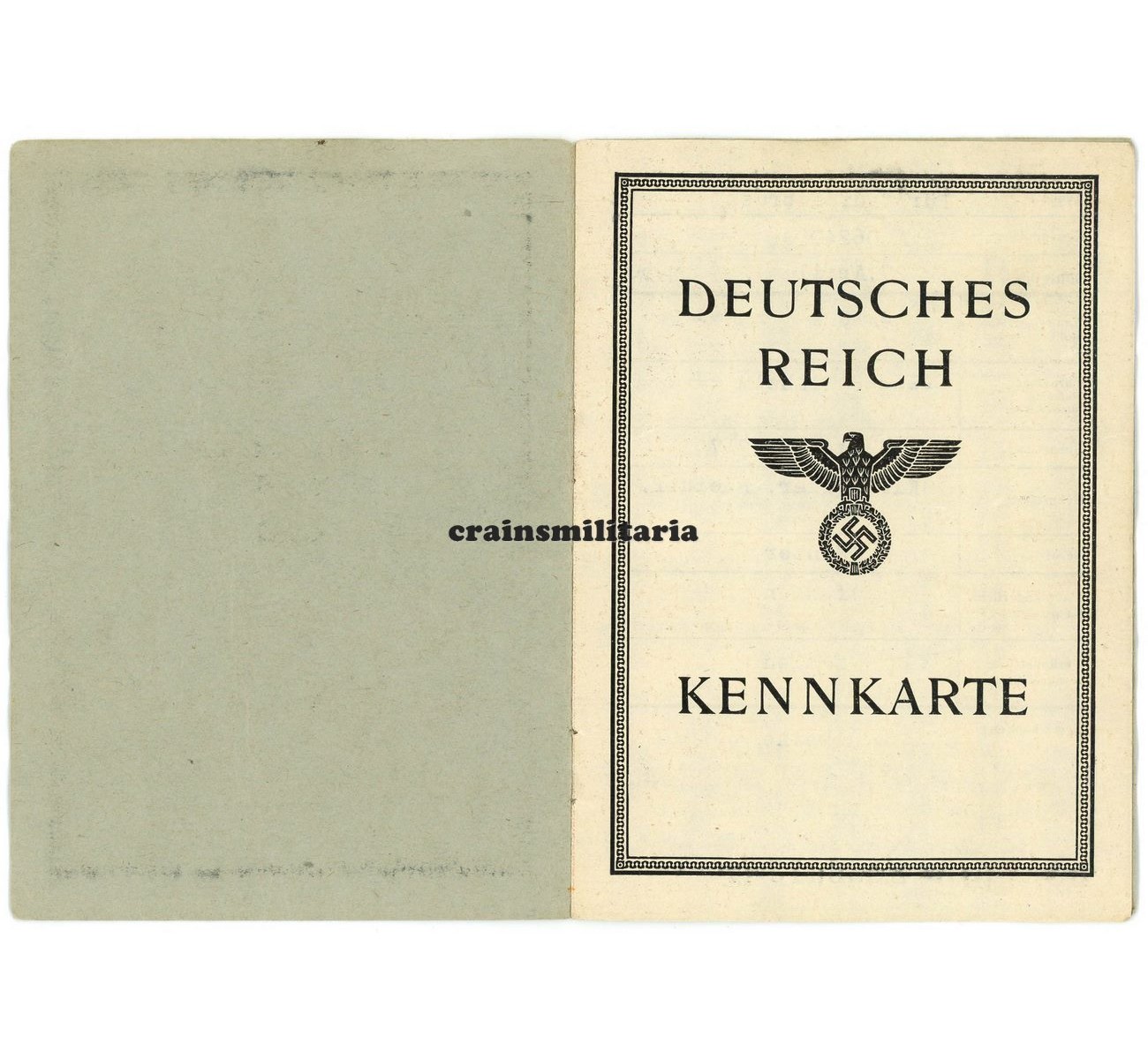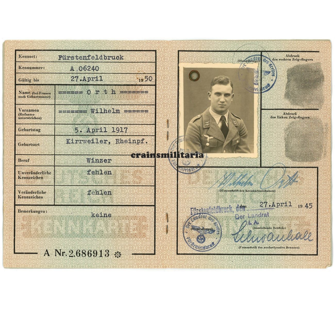 - Kennkarte, very late war issue from 27th of April 1945 in Fürsenfeldbruck. With nice portrait photo in early Luftwaffe uniform.