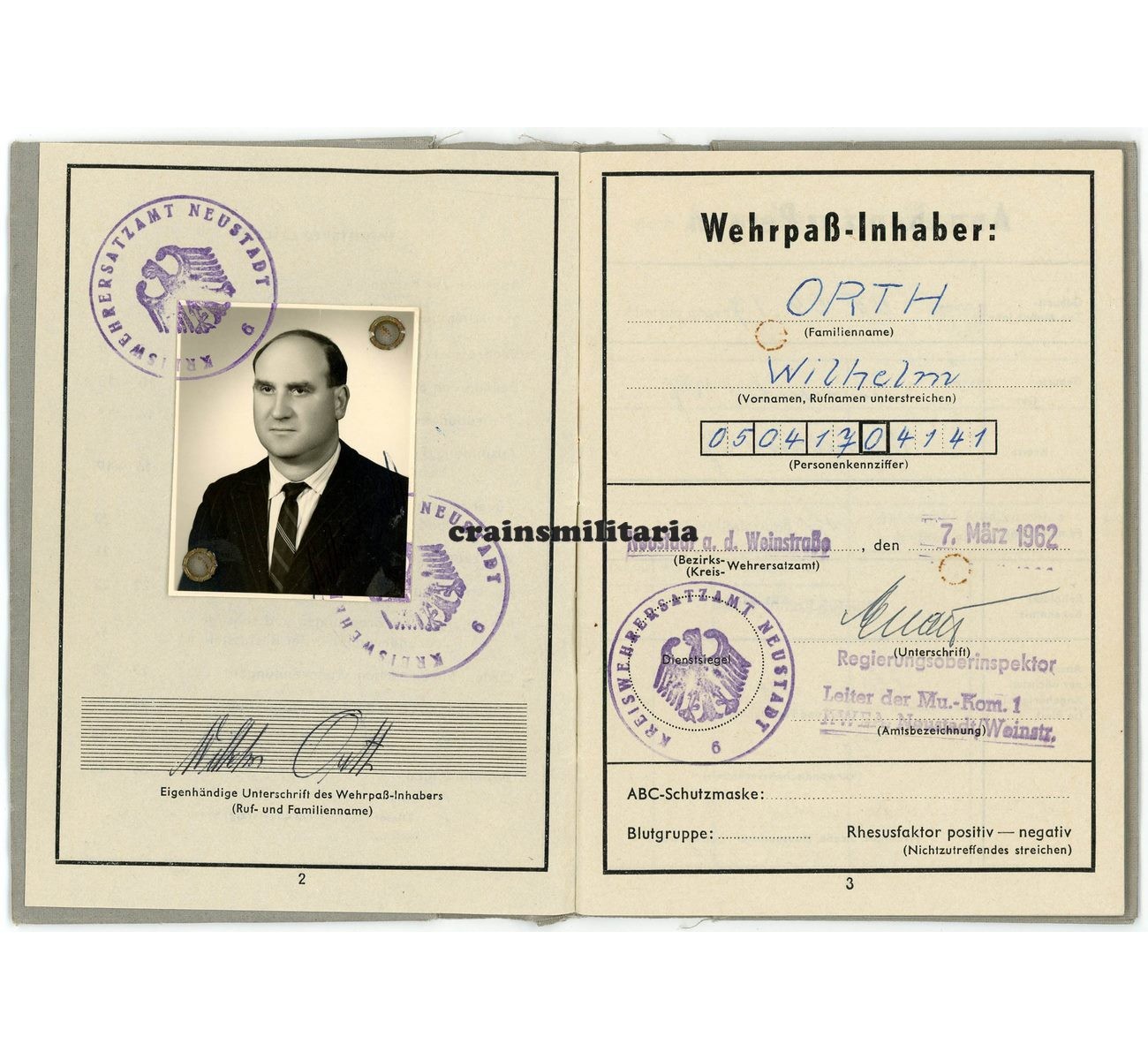 - Postwar Bundeswehr Wehrpass, March 1962, with minimal entries but complete and with a photo of Wilhelm Orth in later years.