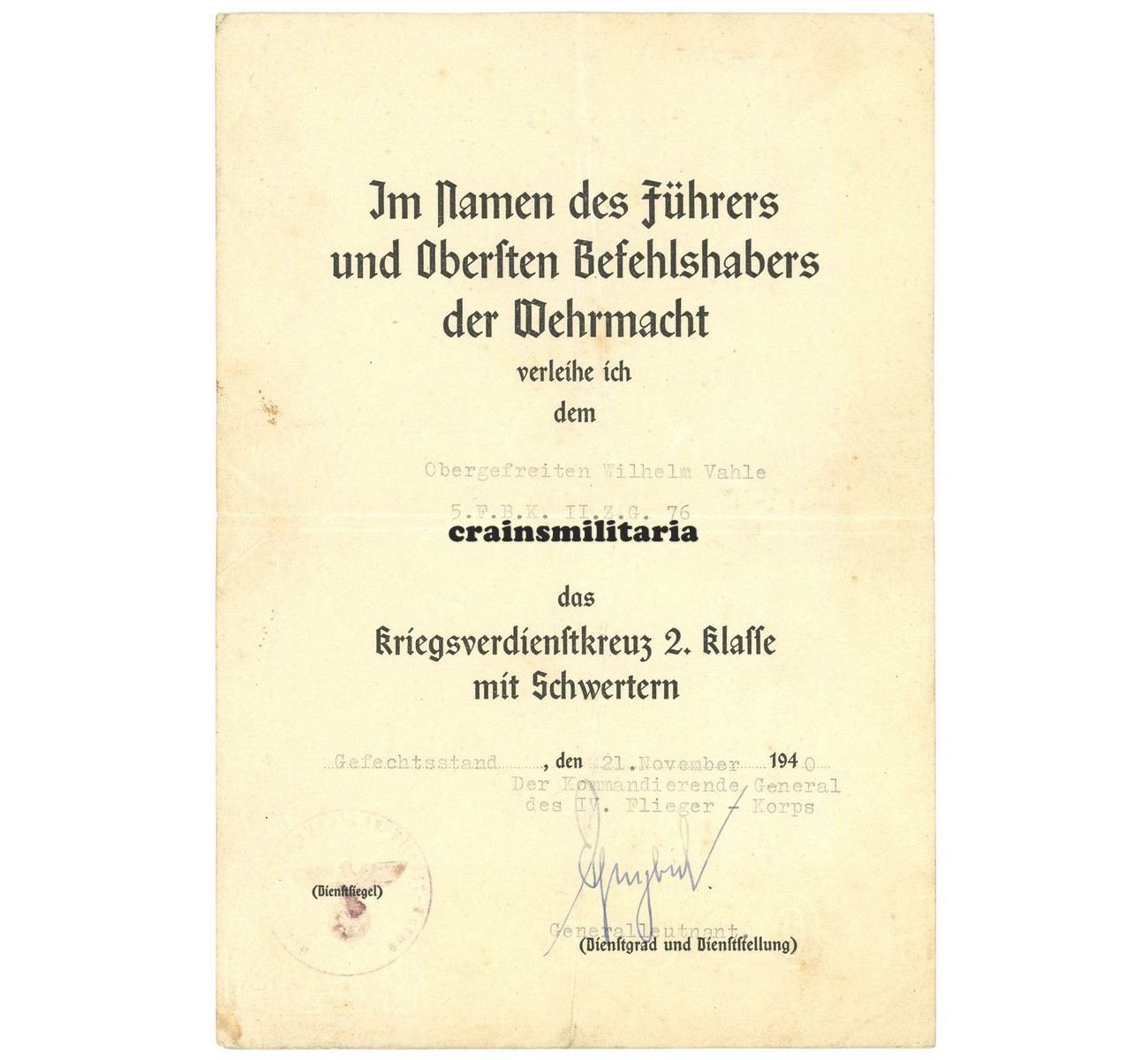 - Kriegsverdienstkreuz 2. Klasse mit Schwertern, November 1940, while serving with the II. Gruppe of Zerstörer-Geschwader 76. Hand signed by Generalleutnant Kurt Pflugbeil, Knight's Cross and Oak Leaves winner.