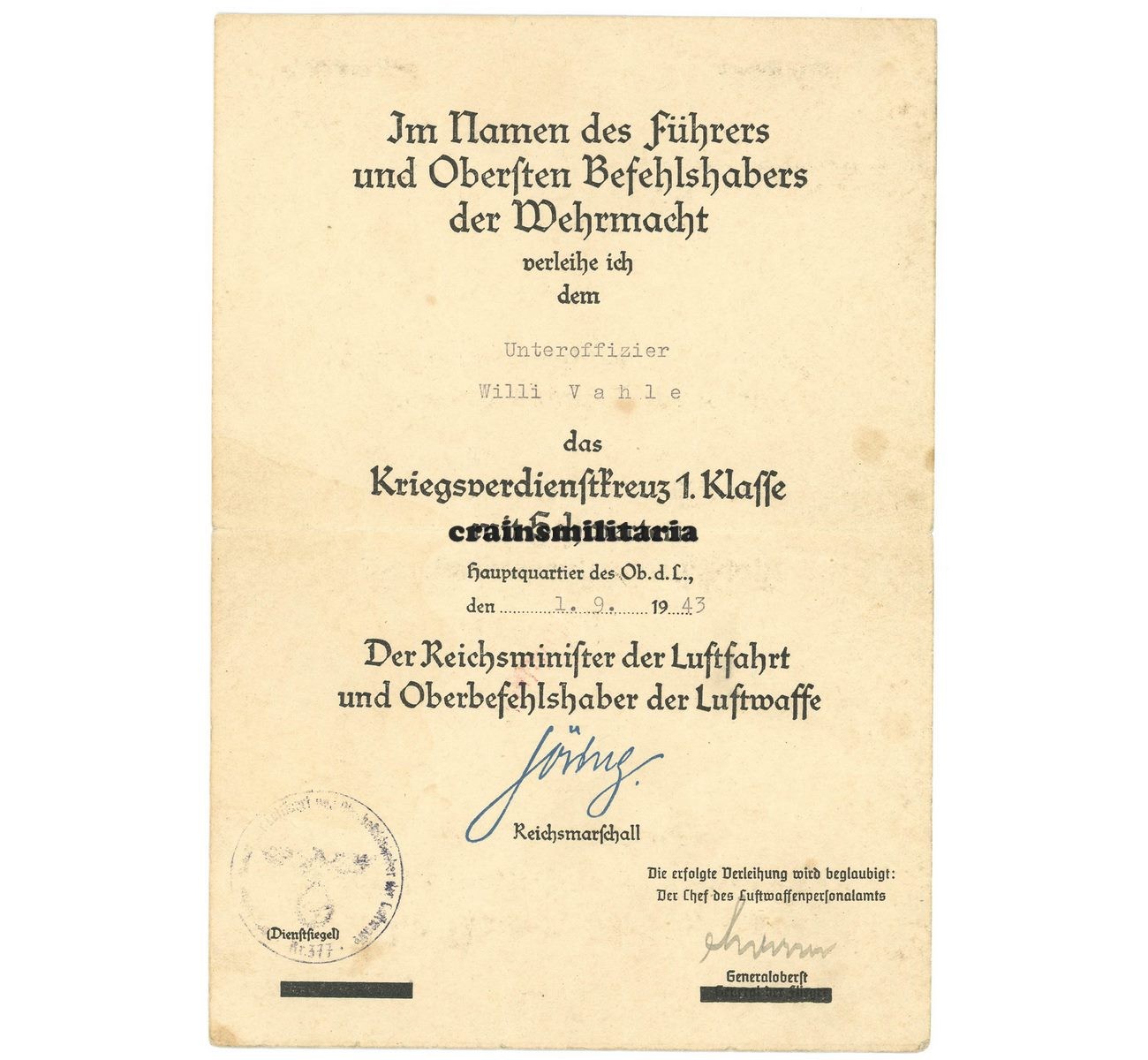 - Kriegsverdienstkreuz 1. Klasse mit Schwertern, September 1943, with facsimile signature of Hermann Göring and hand signed by Generaloberst Bruno Loerzer, Knight's Cross and Pour le Mérite winner.