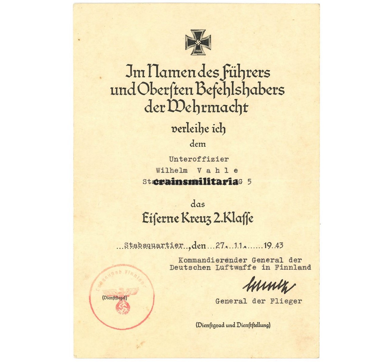 - EK2, November 1943, hand signed by General der Flieger Julius Schulz, DKiG. Awarded for action with III./J.G.5 from its base in Petsamo, mainly targeting the Murmansk area.