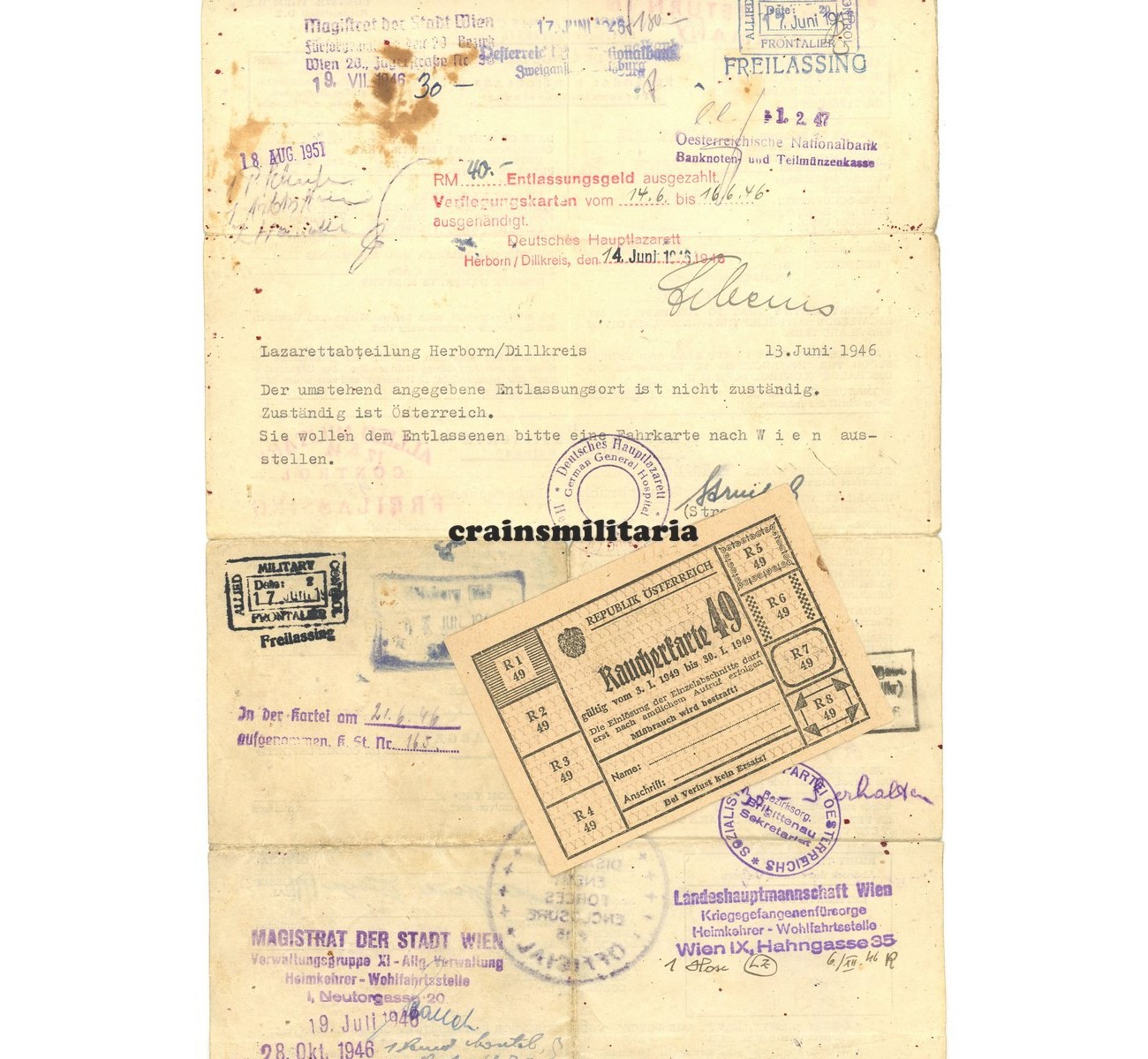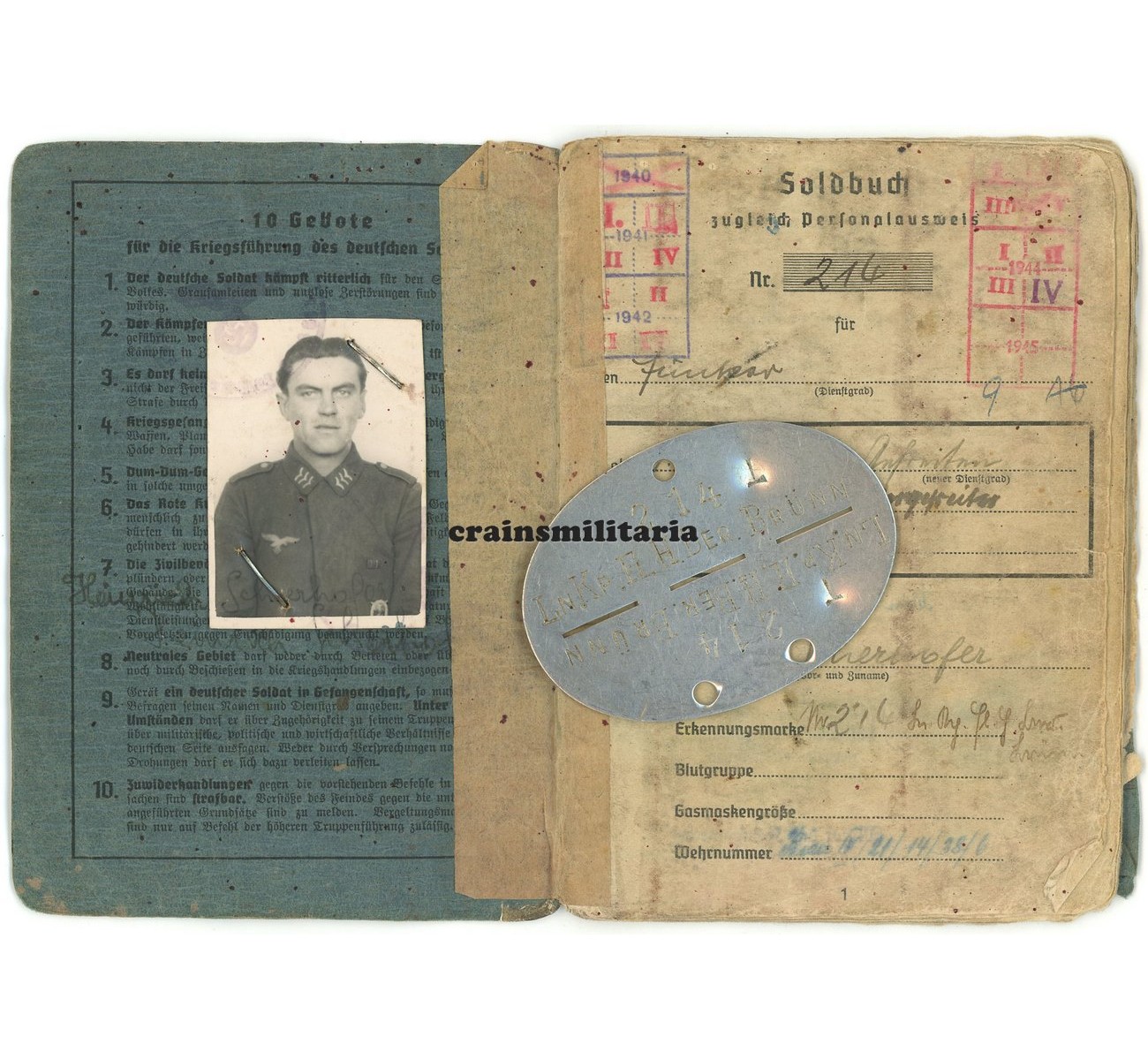 The Soldbuch is in a used but good and 100% complete condition with all pages fixed, and including a great portrait photo showing his Erdkampfabzeichen in wear. His FJ units are backed up with FJ equipment and the security signatures correctly stamped by Feldpostnummer 49725 on page 15. The Soldbuch comes with his POW discharge document, an Austrian Raucherkarte and the matching aluminium dogtag.