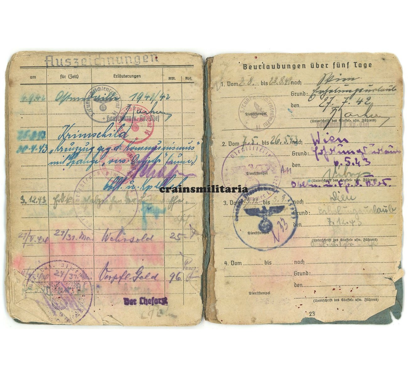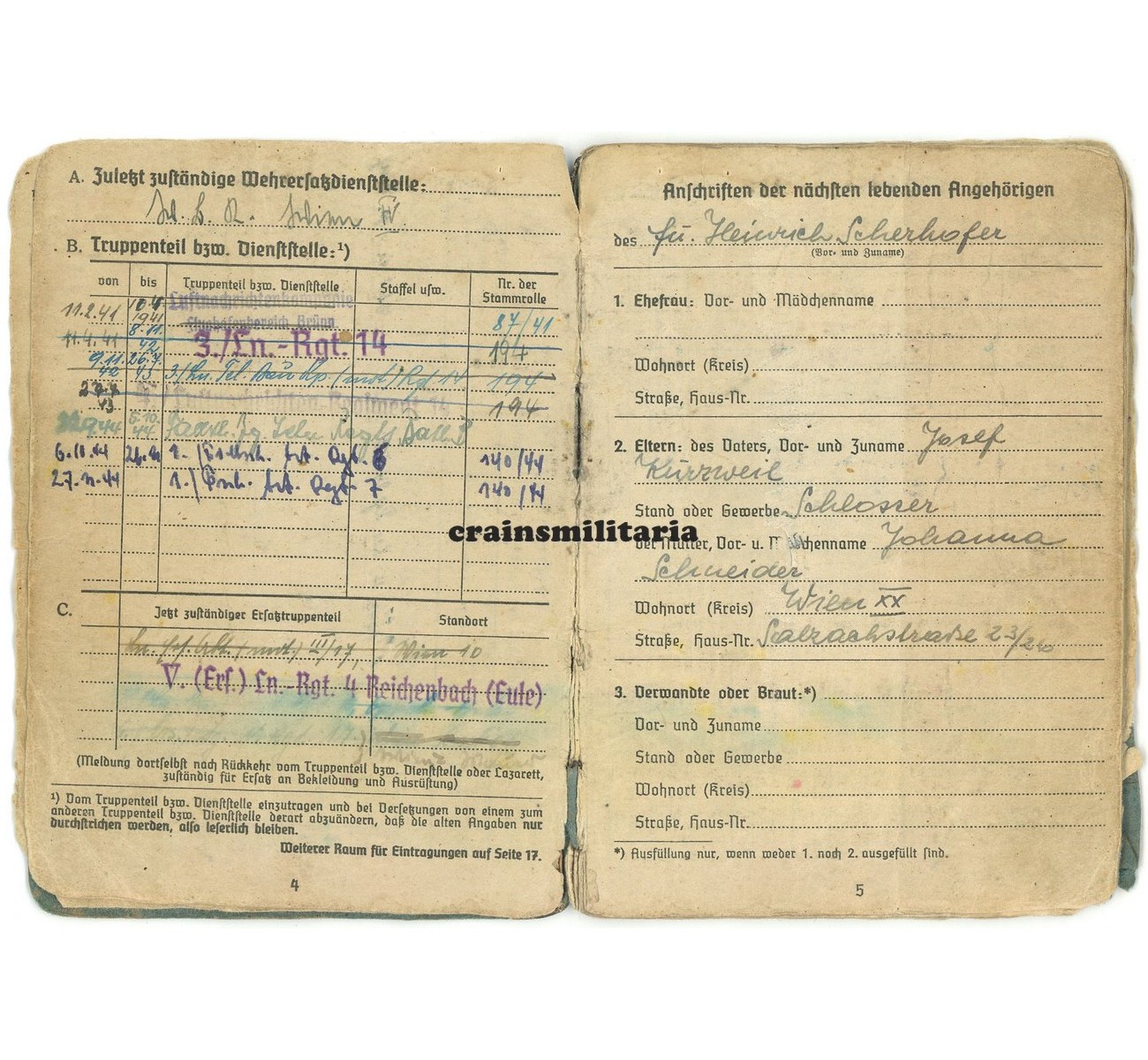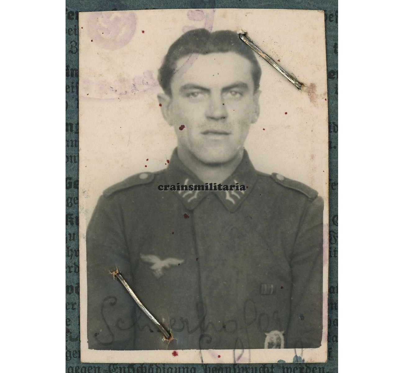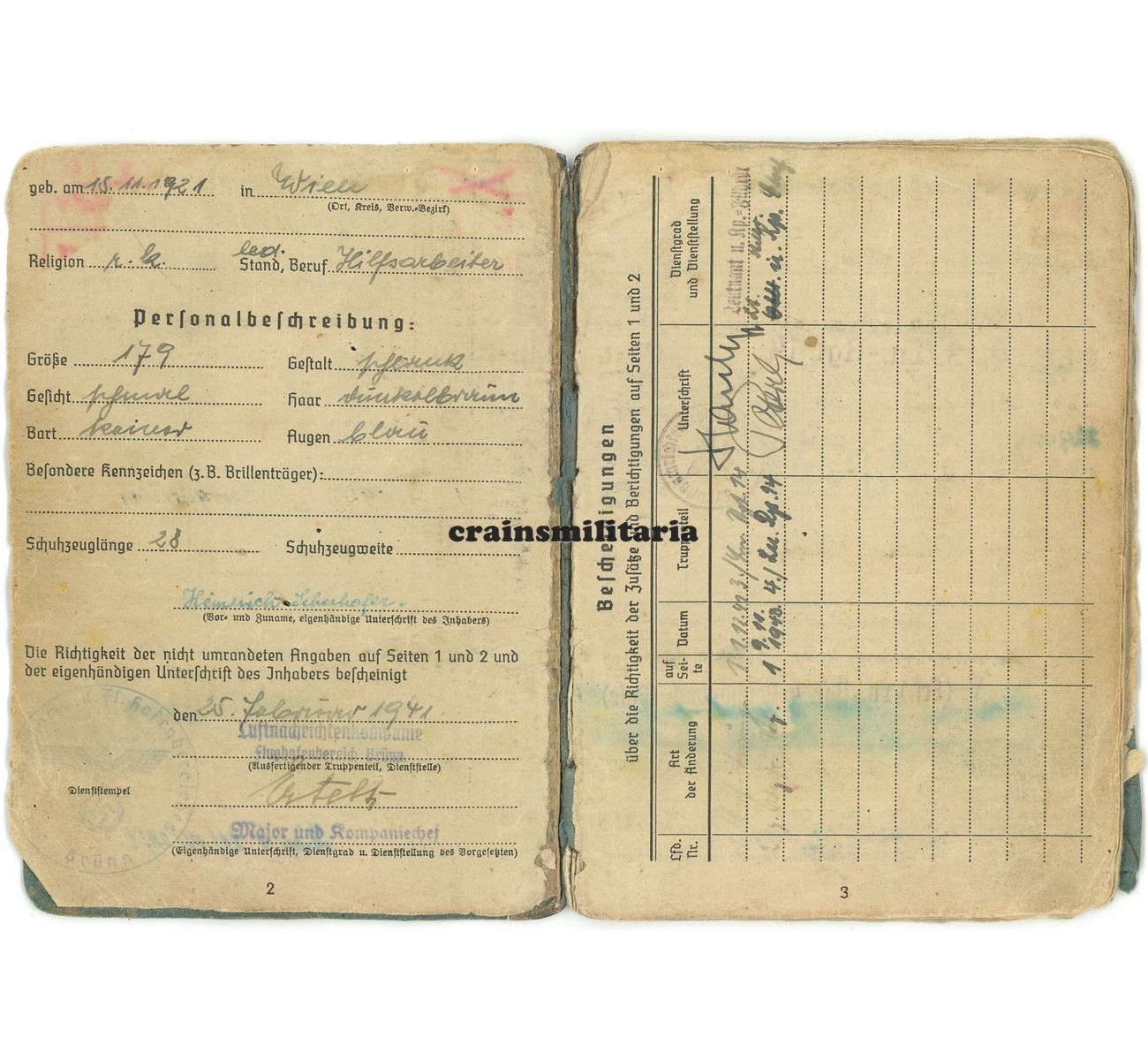 Soldbuch to Obergefreiter Heinrich Scherhofer. First issue from February 1941. This Vienna born Austrian laborer was trained as Luftnachrichten soldier in Brünn (Brno), and then served for over three years with Luftnachrichten-Regiment 14. With this unit, he saw a lot of action on the southern sector of the Eastern Front: they were on the Crimea in 1941-'42, then also in the Maikop - Krasnodar area of southern Russia. In 1944, the regiment retreated through Romania; by this time Scherhofer had been awarded the Ostmedaille, the Krimschild, the Kreuzzug gegen Kommunismus medal with the uncommon "Dnjestr" clasp, and last the Erdkampfabzeichen - not a sinecure for a Luftwaffe radio soldier!