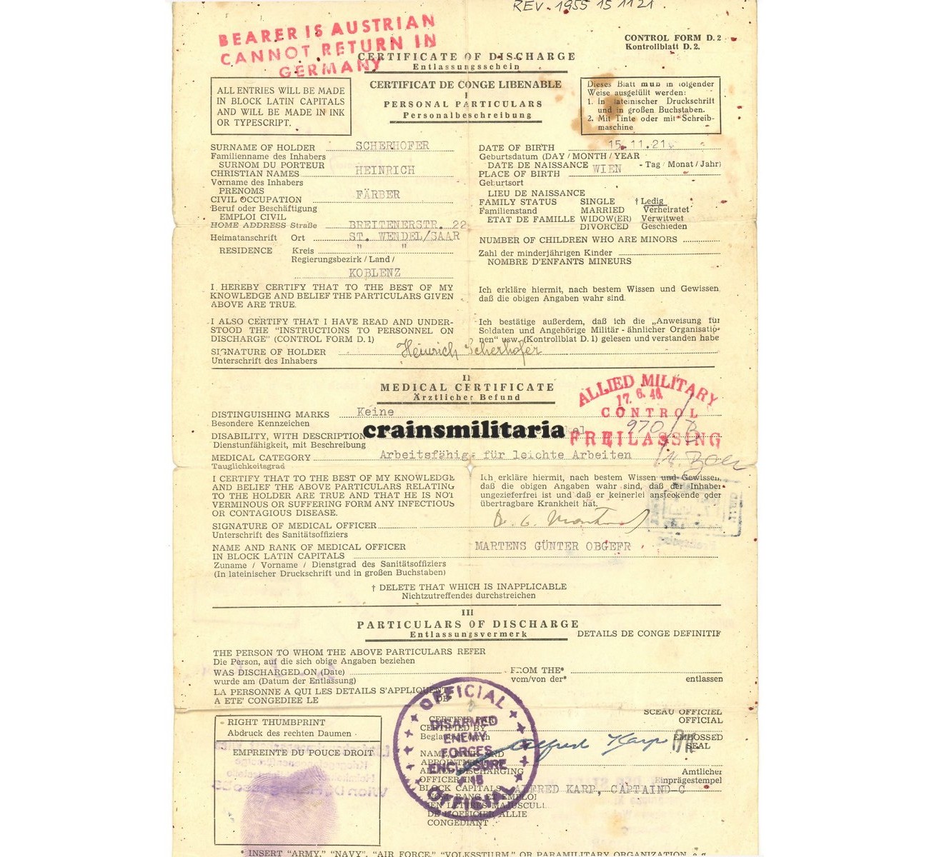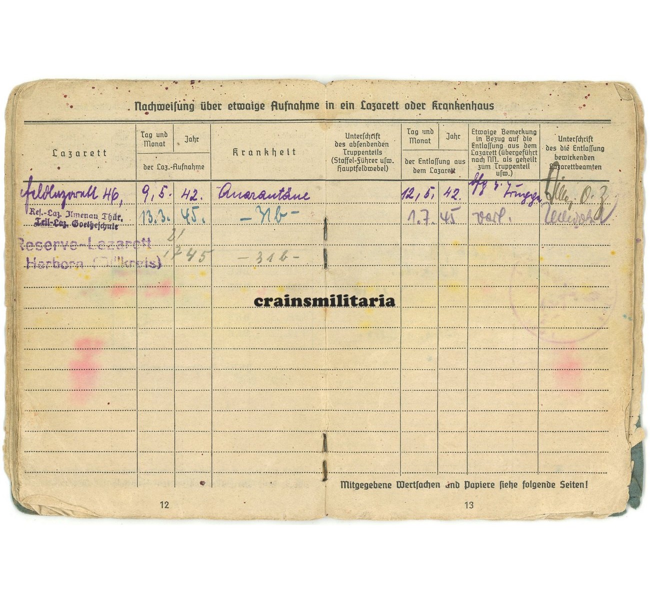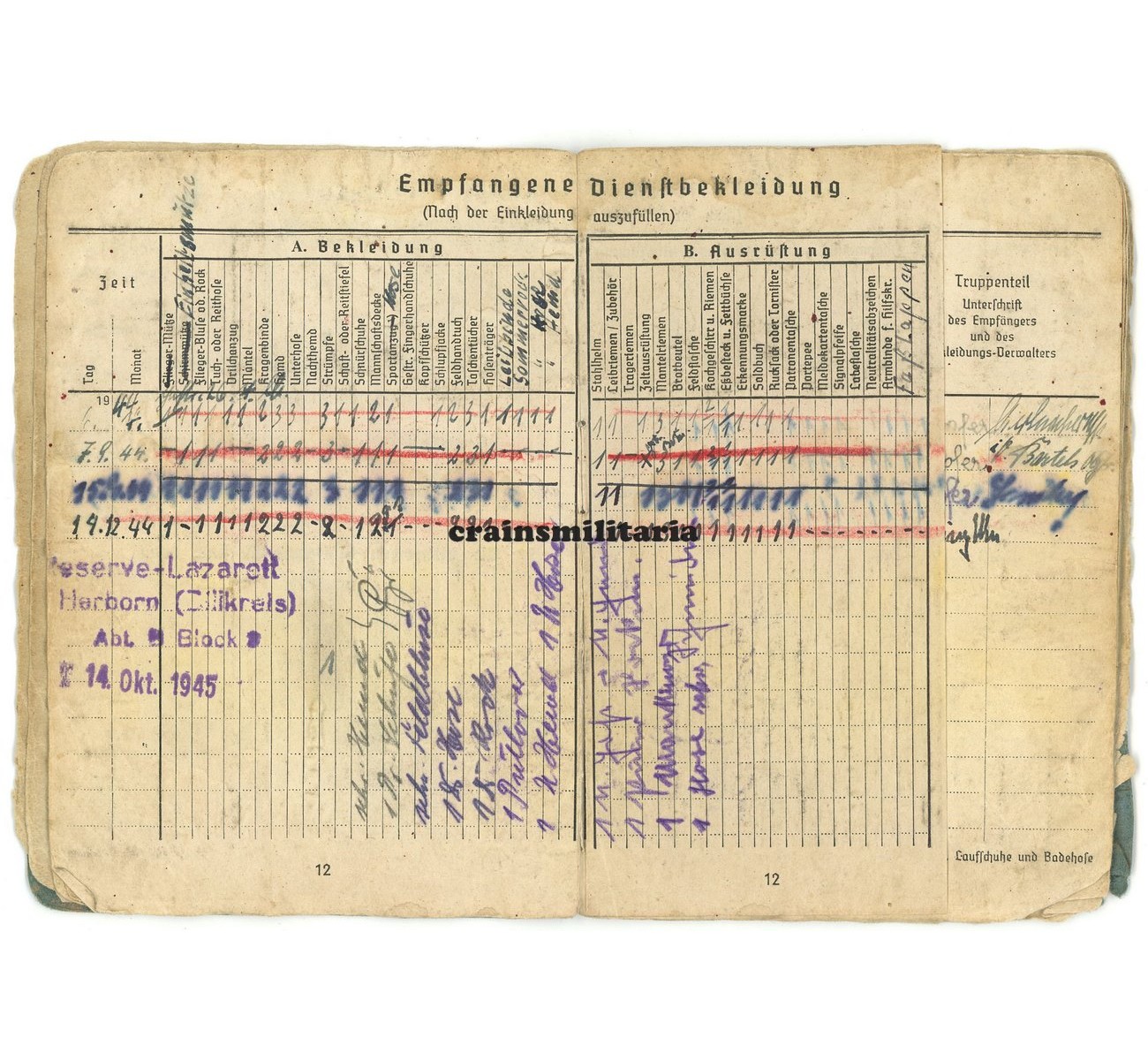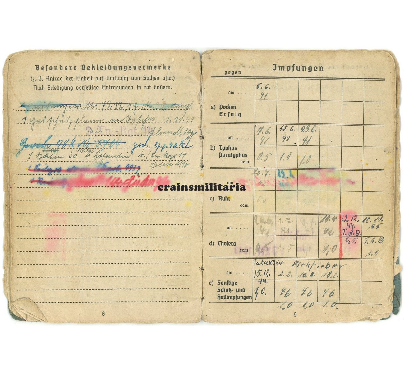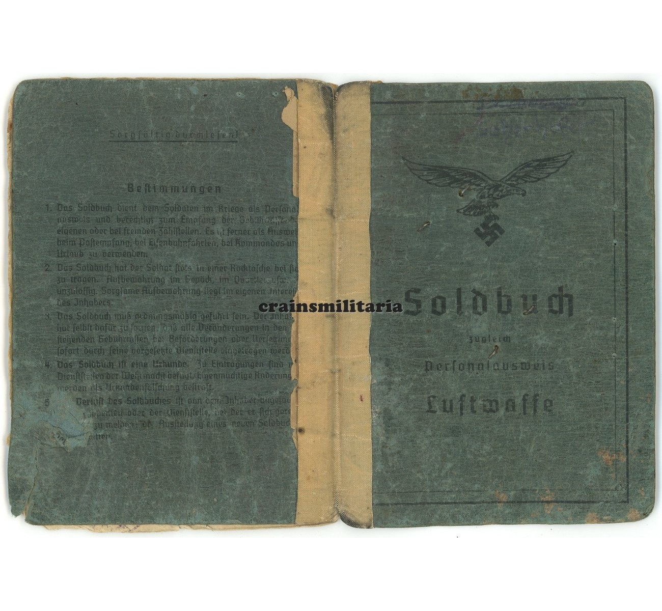 Soldbuch to Obergefreiter Heinrich Scherhofer. First issue from February 1941. This Vienna born Austrian laborer was trained as Luftnachrichten soldier in Brünn (Brno), and then served for over three years with Luftnachrichten-Regiment 14. With this unit, he saw a lot of action on the southern sector of the Eastern Front: they were on the Crimea in 1941-'42, then also in the Maikop - Krasnodar area of southern Russia. In 1944, the regiment retreated through Romania; by this time Scherhofer had been awarded the Ostmedaille, the Krimschild, the Kreuzzug gegen Kommunismus medal with the uncommon "Dnjestr" clasp, and last the Erdkampfabzeichen - not a sinecure for a Luftwaffe radio soldier!