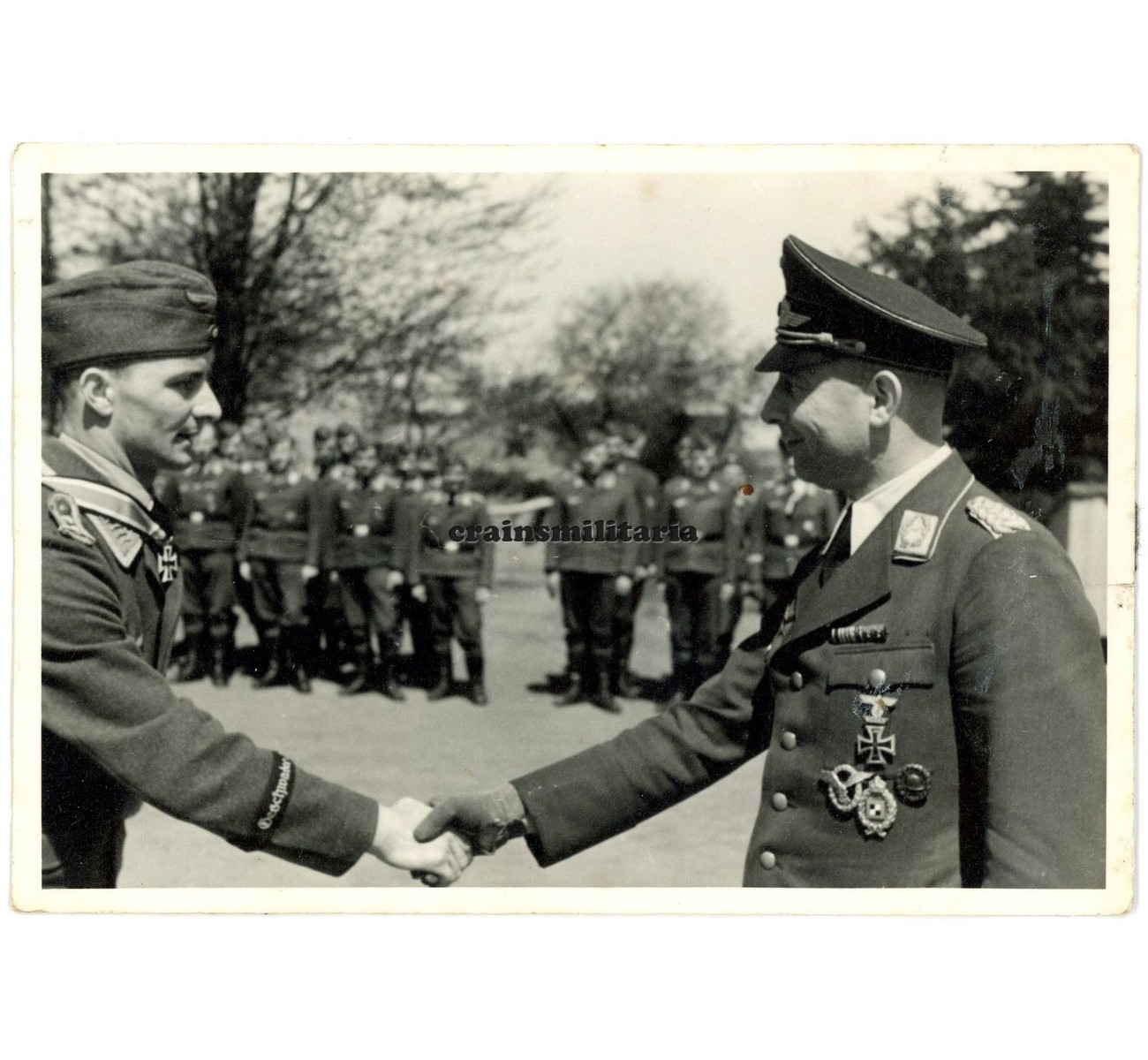 - Private photo of the Knight's Cross award ceremony of Oberfeldwebel Wilhelm Noller. He is seen wearing the Knight's Cross with long ribbon, also notice the SG2 cufftitle in wear. Noller is congratulated by a Luftwaffe general also wearing many awards.