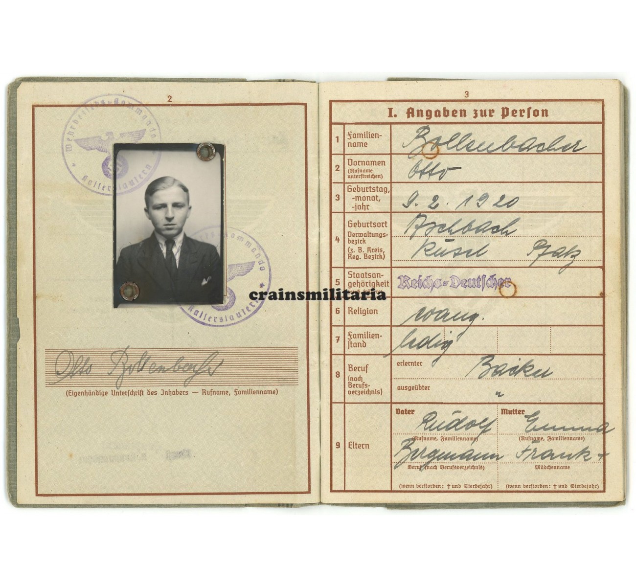 Wehrpass to Oberjäger Otto Bollenbacher. First issue from September 1939. A baker in daily life, Bollenbacher enlisted in the Luftwaffe after completing his RAD service in occupied France, 1940. After basic training in Pilsen (Czech Republic) and half a year with an airfield staff unit in the Heimat, he joined the III. Luftwaffen-Schützen-Bataillon in December 1941. This was one of the first Luftwaffe infantry units, later better known as the Luftwaffen-Felddivisionen. After two months of fighting on the central sector of the Eastern Front, Bollenbacher fell victim to the harsh winter conditions: he suffered from severe frostbite in both his feet. As he didn't recover from the wounds, both his lower legs were amputated in Reservelazarett Halberstadt in June 1942. Following these painful events, he was awarded the Verwundetenabzeichen in Gold, the Eisernes Kreuz 2. Klasse and the Ostmedaille.