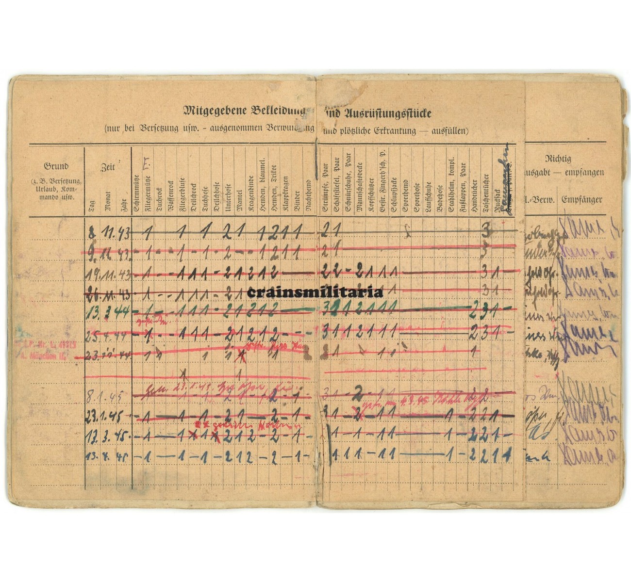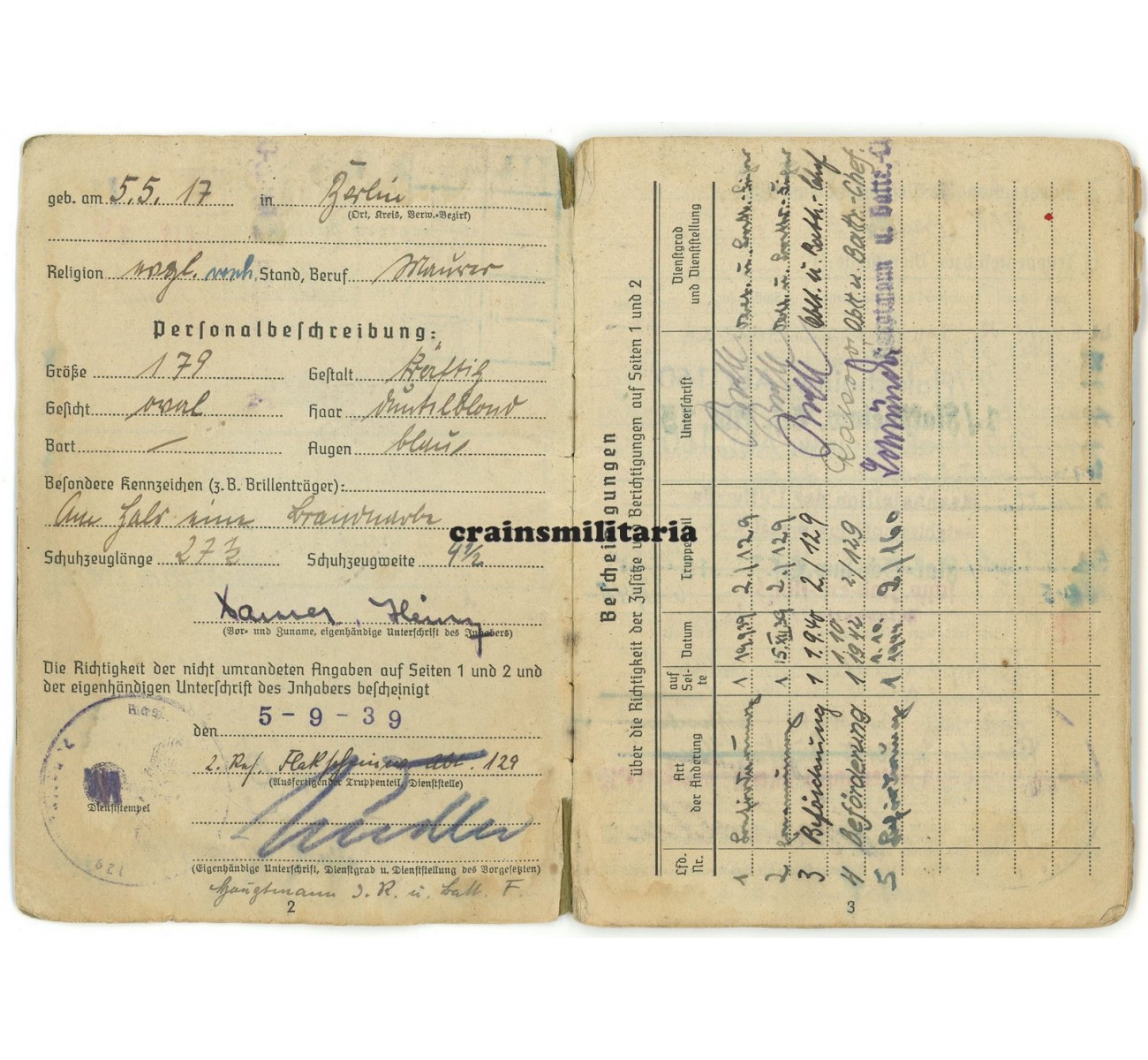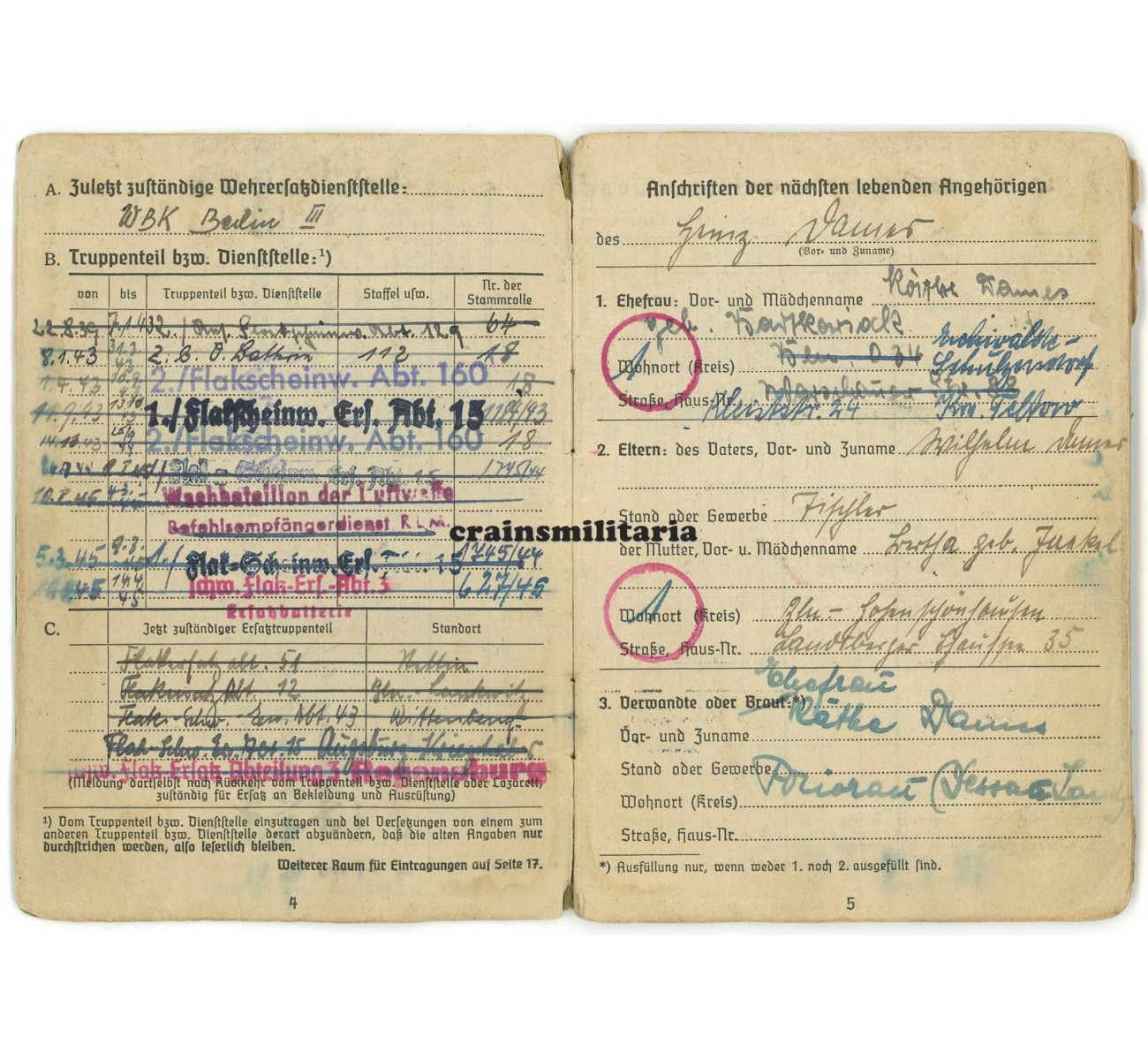 Soldbuch to Oberwachtmeister Heinz Dames. First issue from September 1939. The Berlin resident spent the entire first half of the war with Reserve-Flakscheinwerfer-Abteilung 129 in Darmstadt. In 1943, he moved to Flakscheinwerfer-Abteilung 160 on the Italian front. It served under the 3. Flak-Brigade and was for quite some time stationed in Verona. September 1943, Dames contracted malaria and entered the Luftwaffen-Lazarett in Istonio, now called Vasto on the Adriatic coast southeast of Pescara. After a month he was found fit to rejoin his unit fighting until September 1944, when he left the Italian front through a hospitalisation in Fallschirm-Feldlazarett 4.