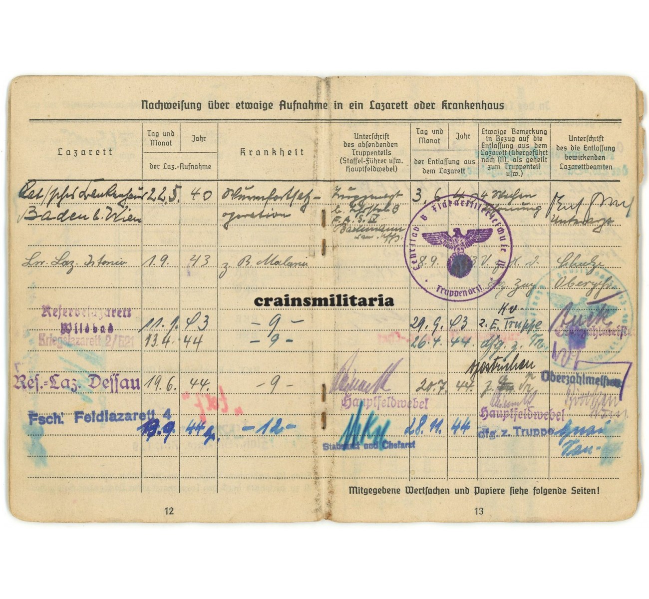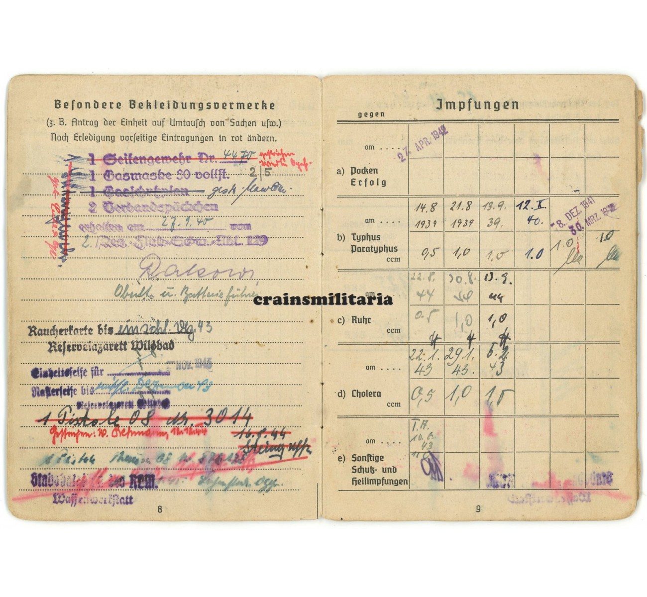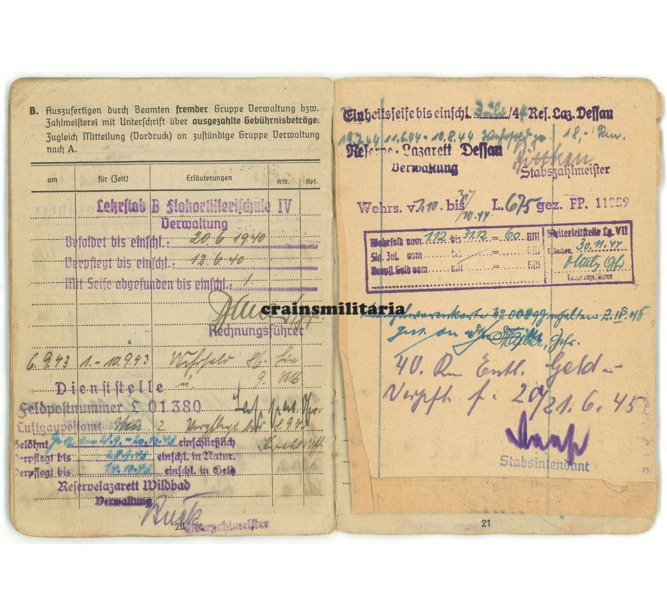 Soldbuch to Oberwachtmeister Heinz Dames. First issue from September 1939. The Berlin resident spent the entire first half of the war with Reserve-Flakscheinwerfer-Abteilung 129 in Darmstadt. In 1943, he moved to Flakscheinwerfer-Abteilung 160 on the Italian front. It served under the 3. Flak-Brigade and was for quite some time stationed in Verona. September 1943, Dames contracted malaria and entered the Luftwaffen-Lazarett in Istonio, now called Vasto on the Adriatic coast southeast of Pescara. After a month he was found fit to rejoin his unit fighting until September 1944, when he left the Italian front through a hospitalisation in Fallschirm-Feldlazarett 4.