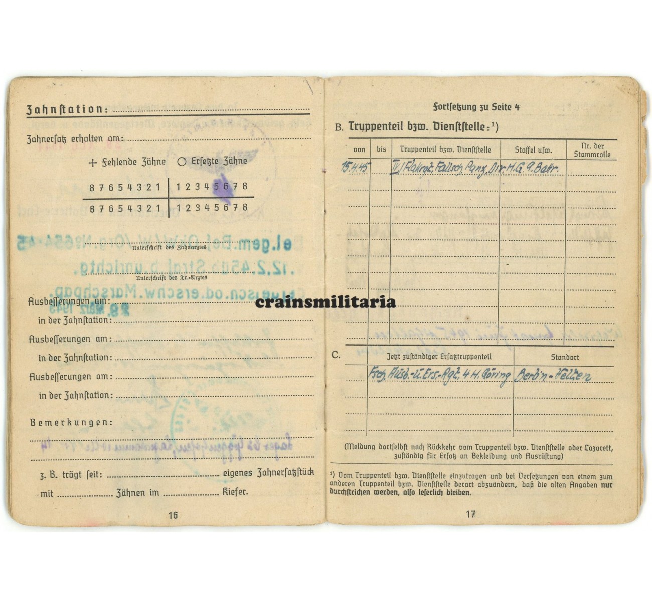 January 1945, Dames was assigned to an interesting HQ unit in his home city Berlin: the Befehlsempfängerdienst R.L.M. of the Wachbataillon der Luftwaffe. He must have worked in the highly secured Reichsluftfahrtministerium (R.L.M.) in the Wilhelmstrasse under command of Albert Speer. For the last weeks of the war, Dames moved to the front again with another high profile unit: the Fallschirm-Panzer-Division "Hermann Göring", where he would serve in the 9. Batterie of the divisional HG Flak-Regiment. In April 1945, the HG Division was pushed back from Silesia to Saxony, surrendering to the Russians. The release entry made on the day of the armistice on page 15, correctly stamped by IV./Flak.Rgt.HG, suggest he did make it to the Western Allies, and was detained in a POW camp in Göggenhofen near Munich. For his long service in the Luftwaffe, Dames was awarded the Tätigkeitsabzeichen der Flakartillerie, the Czech annexation medal and the KVKII.