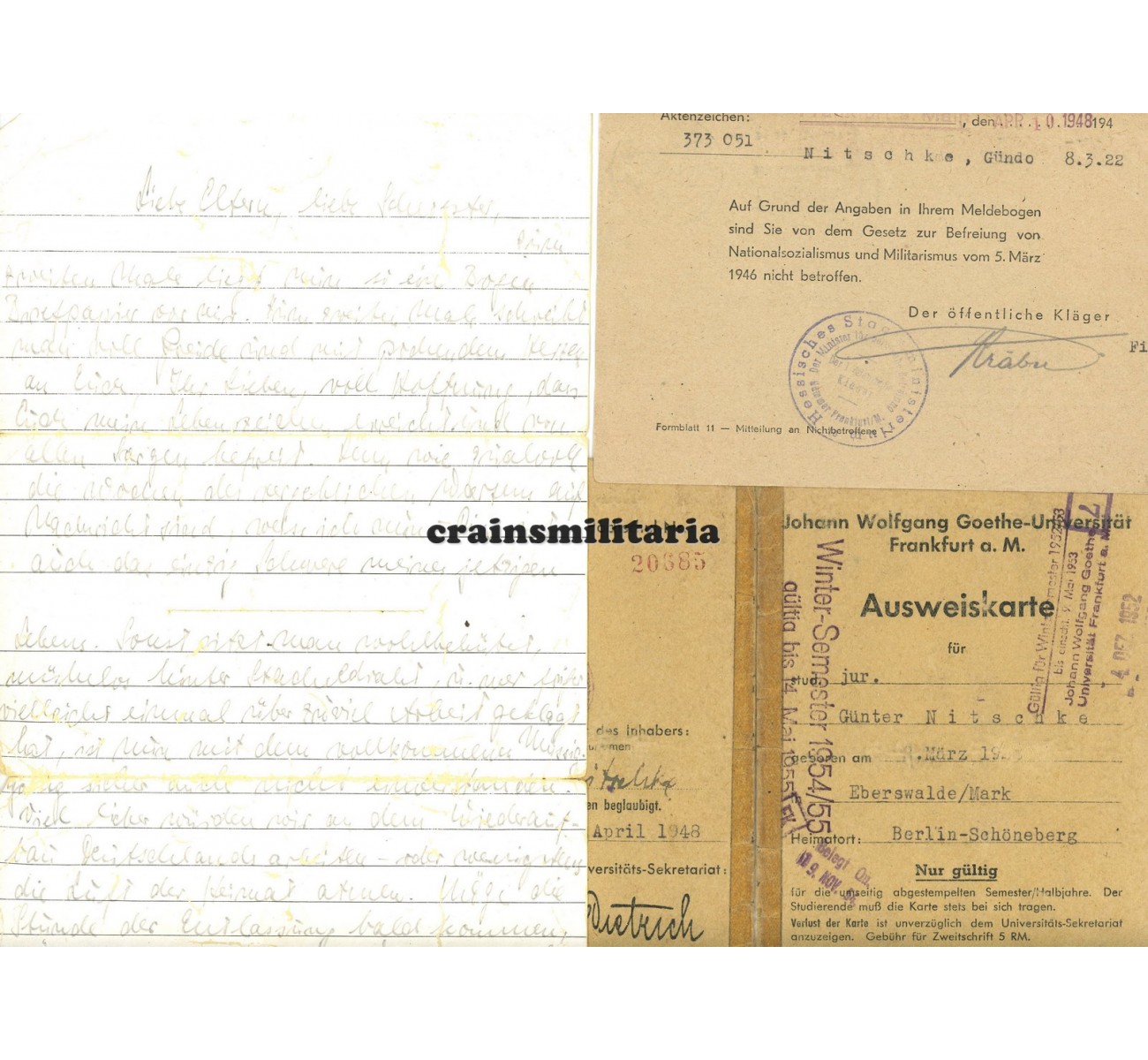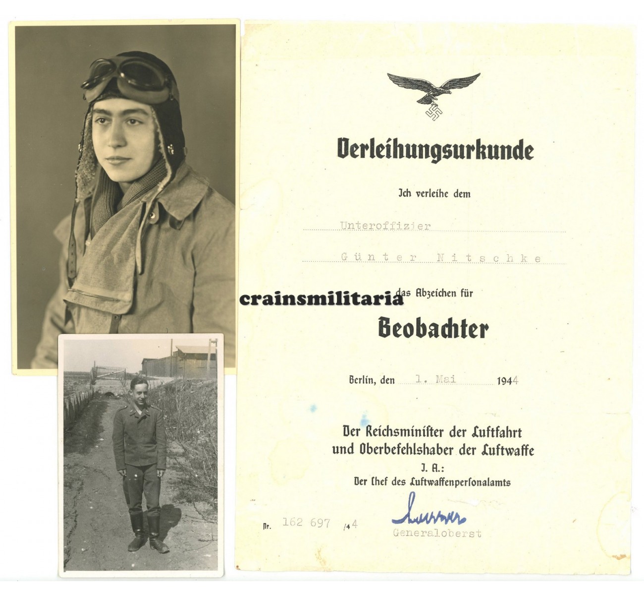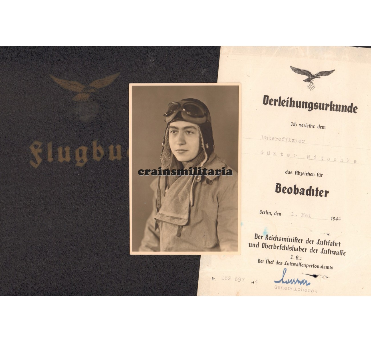 Document grouping to Unteroffizier Günter Nitschke, a fighter pilot who later became a bomber observer. Joining the Luftwaffe in 1940, Nitschke was admitted to pilot school later that year, flying with the Flugzeugführerschule A/B 118 in Stettin (Sczecin, Poland) until mid 1941, when he was transferred to Jagdfliegervorschule 1 in Kamenz, and shortly after to Jagdfliegerschule 5 in Toussus le Noble, near Paris. The following three years are less clear but on one photo we can see him wearing the pilot's badge in the Beaujon hospital in Paris. By May 1944, Nitschke had transferred from fighter to bomber roles, when he earned the Beobachterabzeichen. Later that year, he was reported with the 5. Staffel of Kampfgeschwader 30 then flying on the Invasion front. On April 15th, 1945, he surrendered to the British in Leeuwarden, Holland.