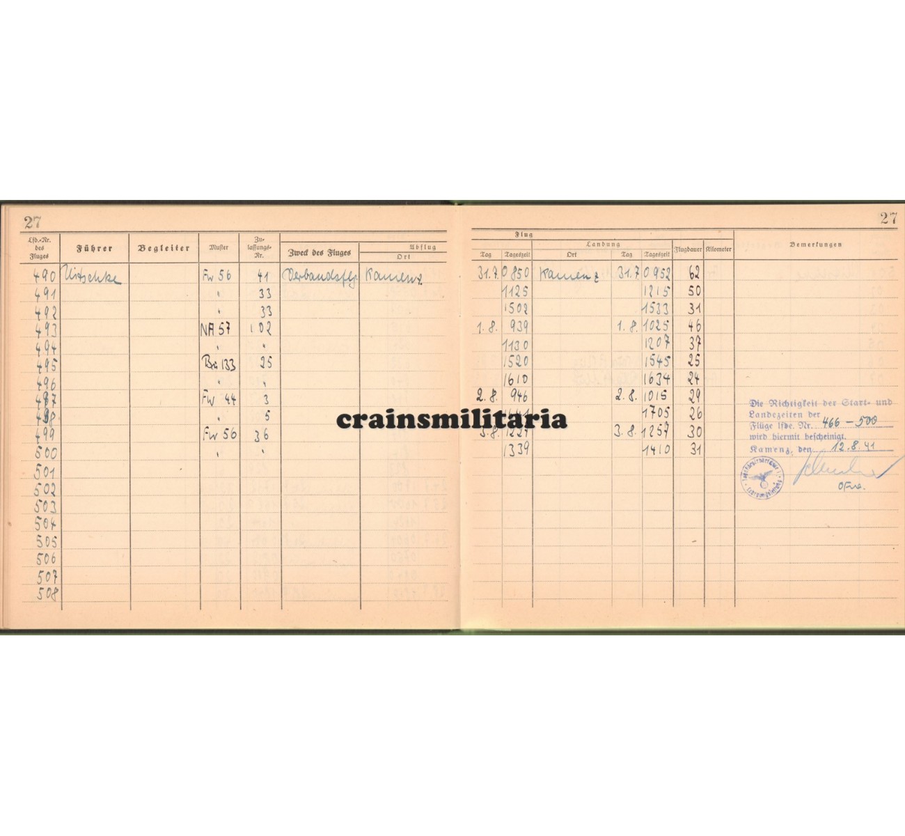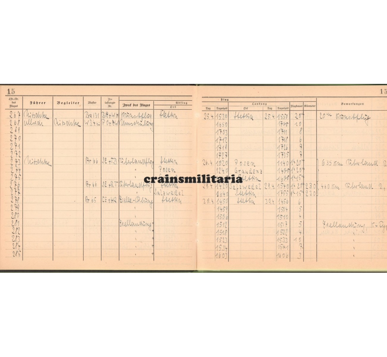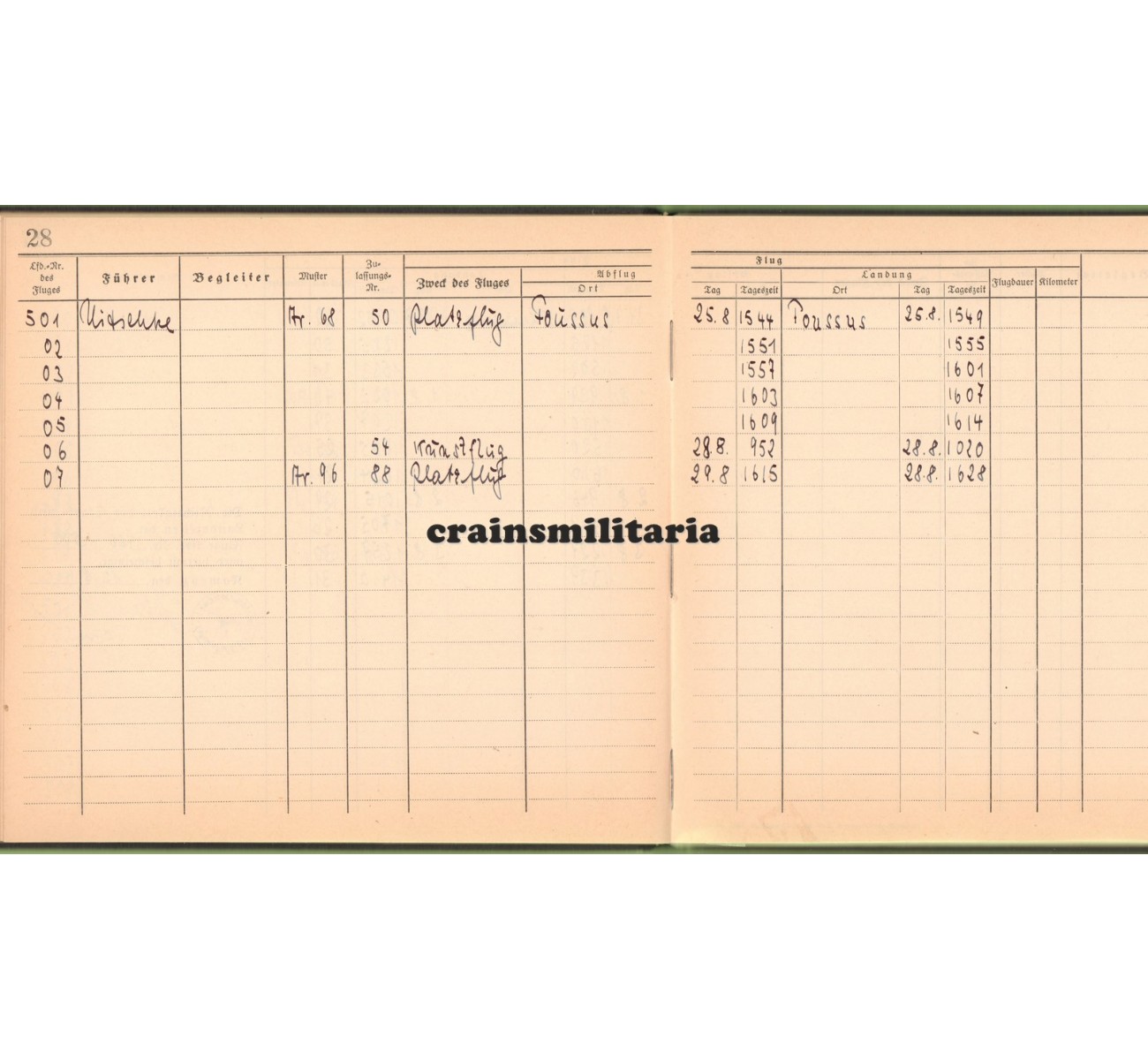- Flugbuch, with a total of 507 flights from November 1940 until August 1941, with the forementioned pilot schools in Stettin, Kamenz and Toussus. These include many interesting aircraft types such as the captured North American 57 (NA-57) and the Caudron C-445, among many German types like the Arado Ar 65, 66, 68 and 96. The Flugbuch is a large, luxury hardcover in perfect condition except for the denazification of the cover.