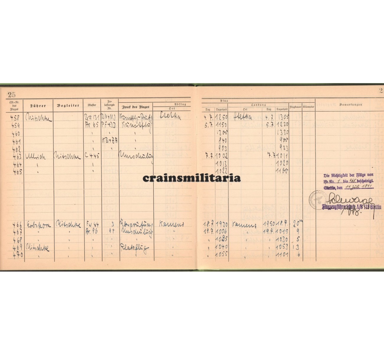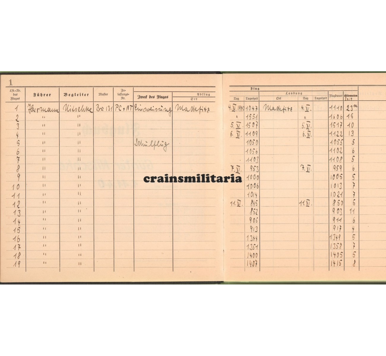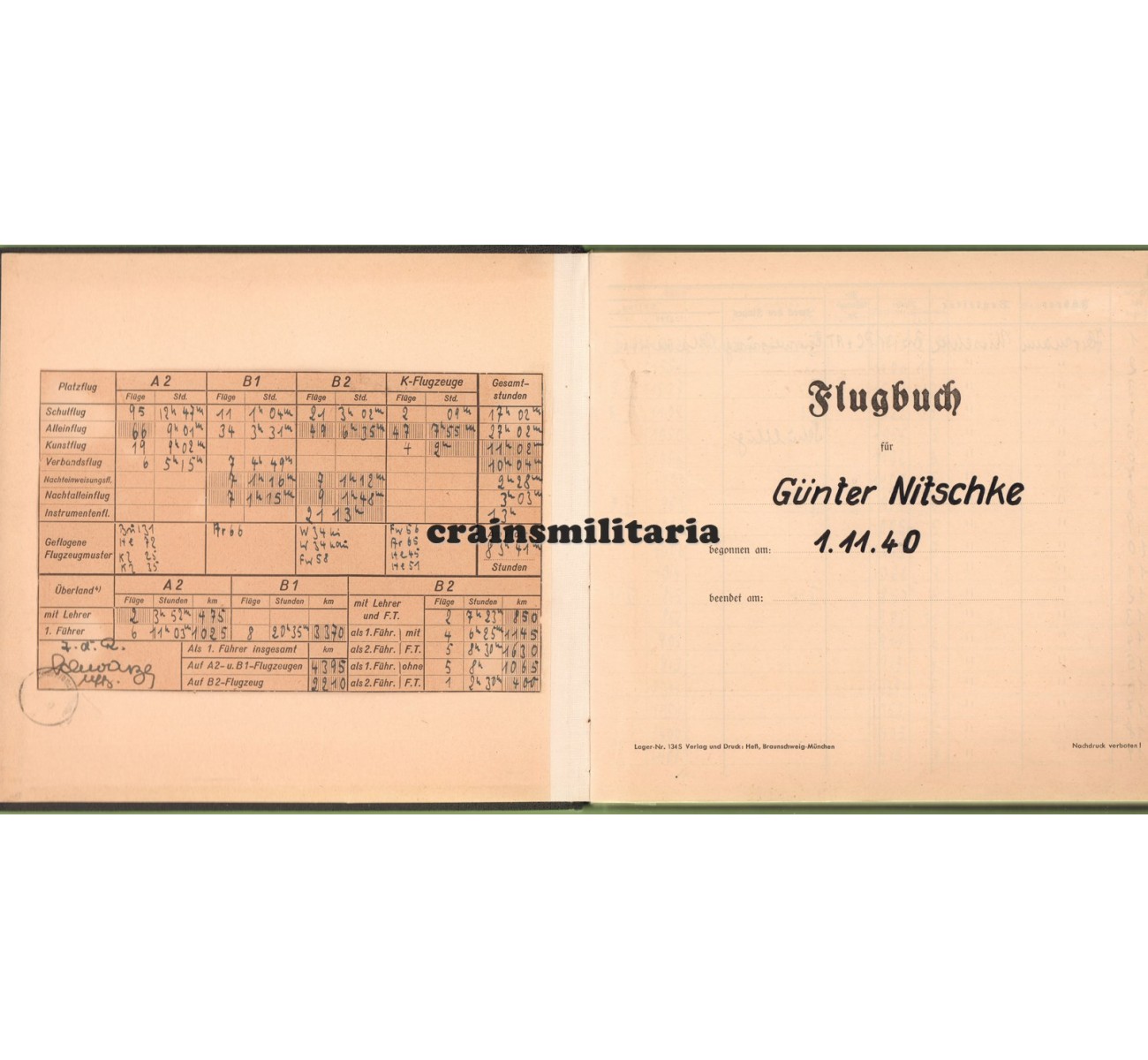 - Flugbuch, with a total of 507 flights from November 1940 until August 1941, with the forementioned pilot schools in Stettin, Kamenz and Toussus. These include many interesting aircraft types such as the captured North American 57 (NA-57) and the Caudron C-445, among many German types like the Arado Ar 65, 66, 68 and 96. The Flugbuch is a large, luxury hardcover in perfect condition except for the denazification of the cover.