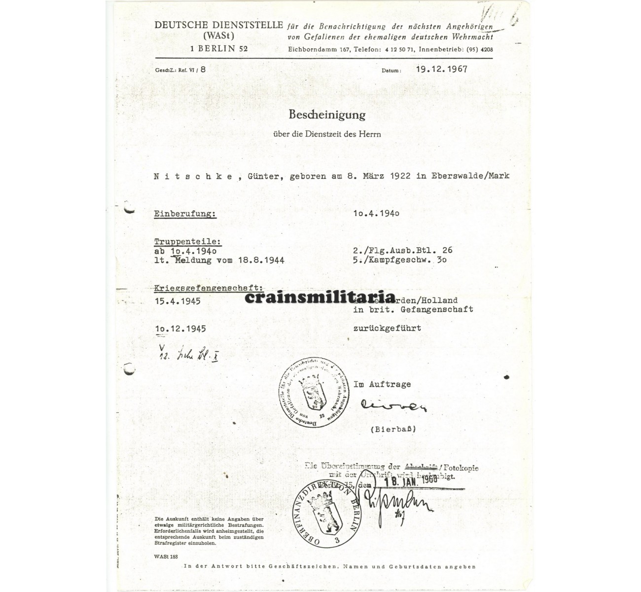 - Document from the WASt confirming his last known unit and capture in Holland.