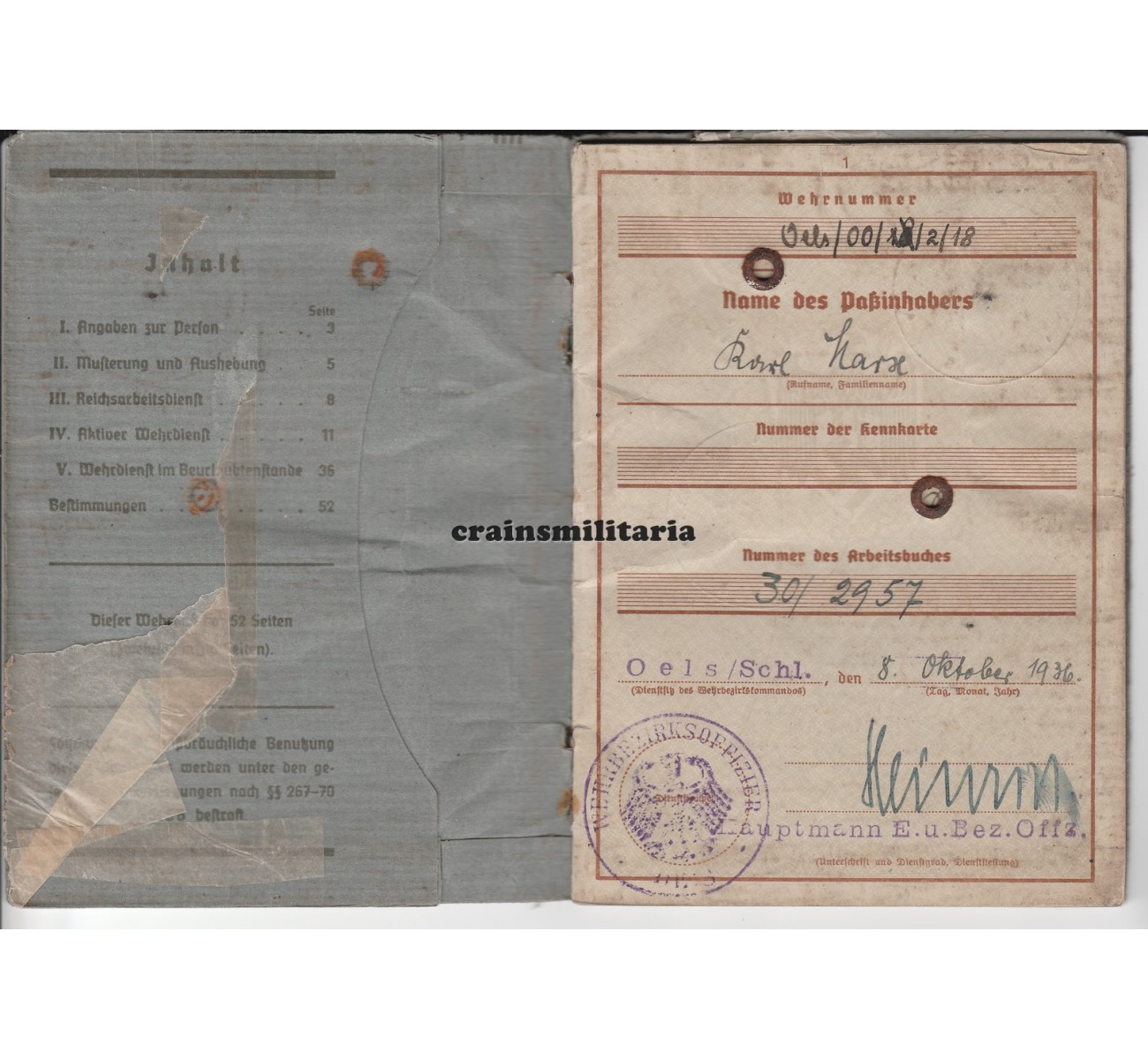 Wehrpass to Schütze Karl Marx. First issue from October 1936. Although not bearing the most popular name for service in Nazi Germany, Marx volunteered for the Wehrmacht and served with Infanterie-Regiment 49 in Breslau, 1936. He trained with Panzer-Abwehr-Abteilung 221 in Lamsdorf in the Summer of 1939, but then got ill just days before the start of the war and was discharged. Called up again in 1944, he switched to the Luftwaffe, serving with Luftgau-Nachrichten-Regiment 8 in Oppeln-Birkental, and from November 1944 onwards with the A.u.S.-Regiment der Luftflotte 4, seucring the airfields in Slovakia and Austria from the approaching Russian army.