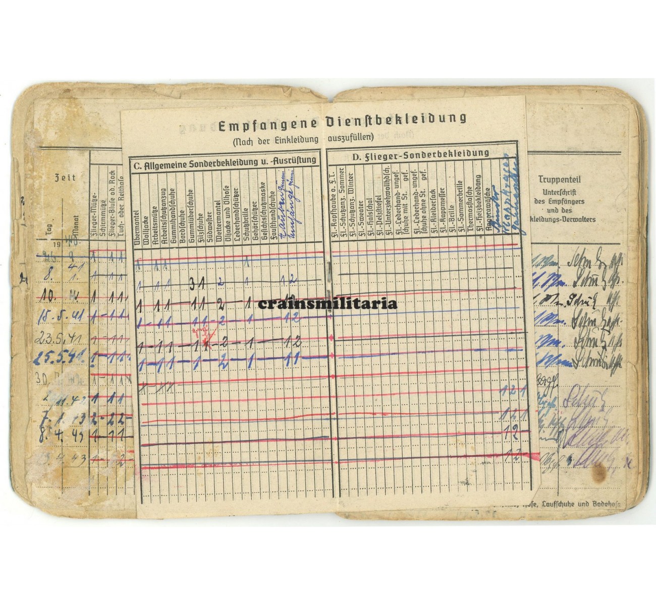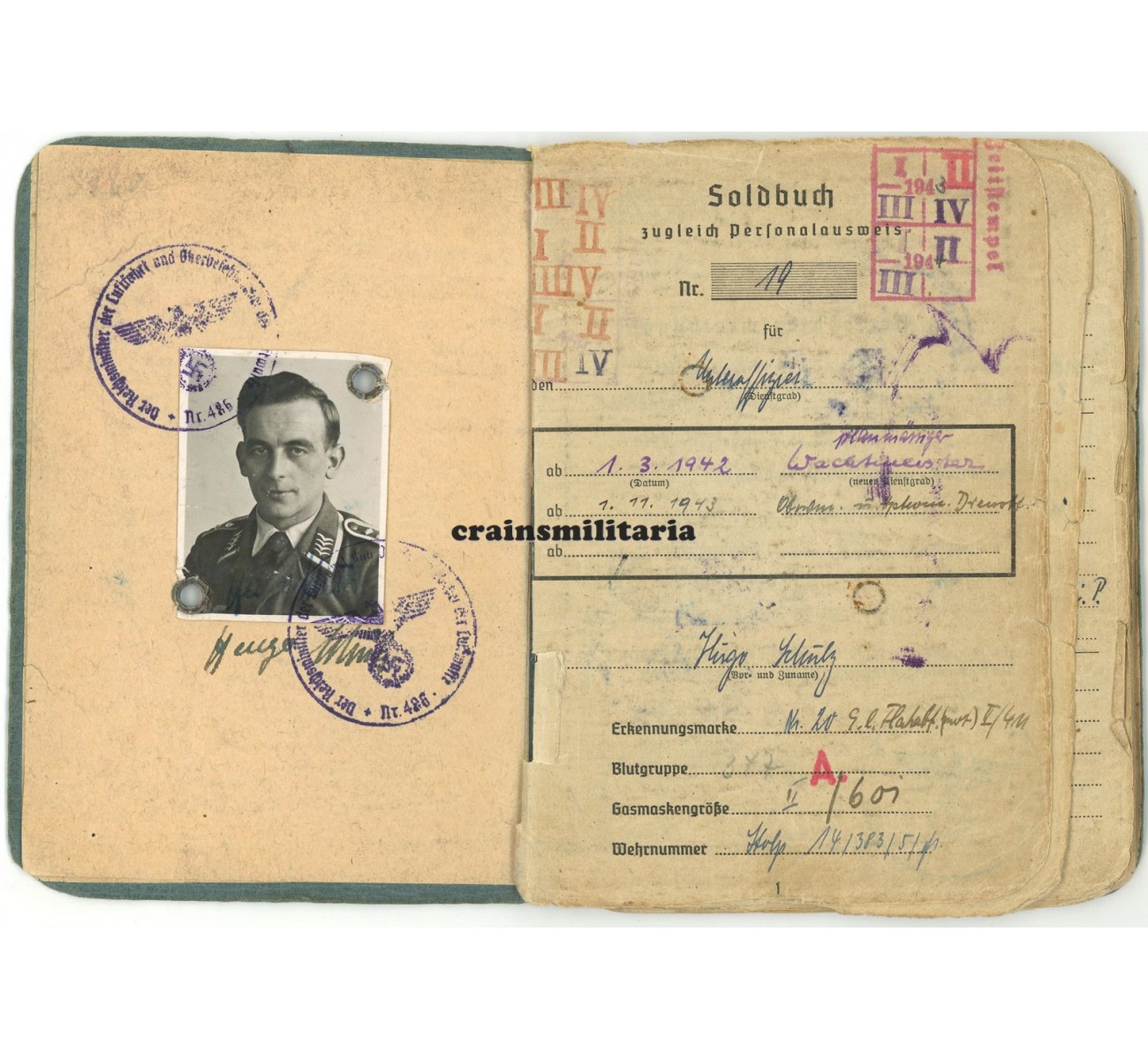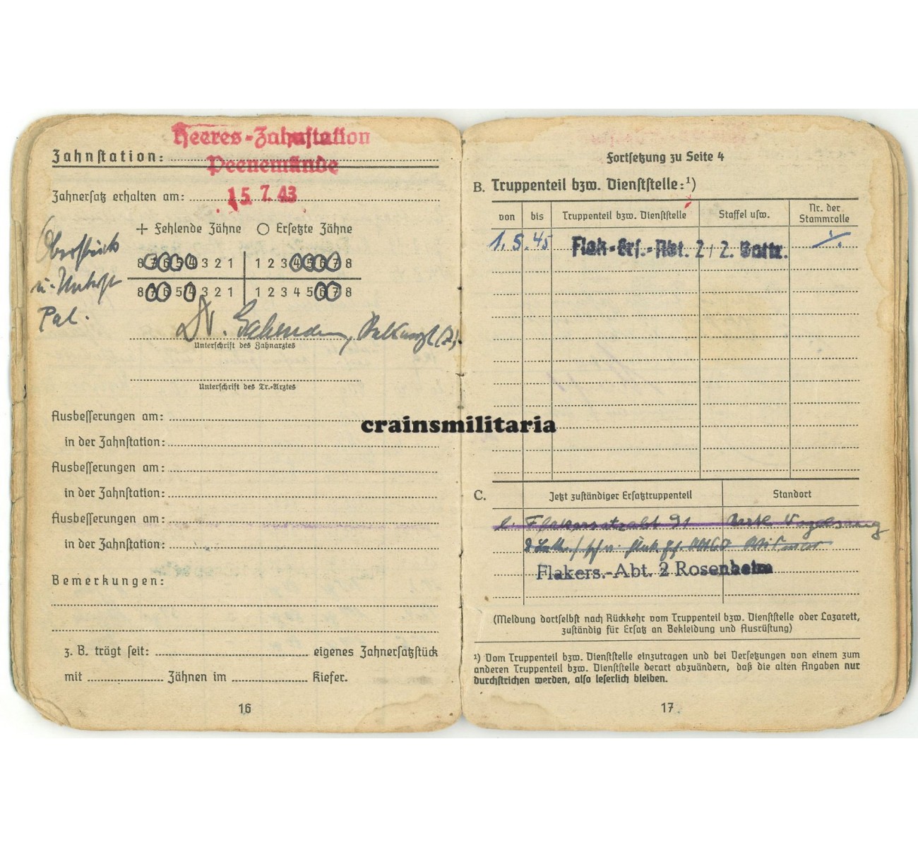 This medical condition would mean the end of his front career, but also the start of a third and most exciting chapter. Schulz now entered a number of experimental anti-aircraft units subordinate to the Reichsluftfahrtministerium; notice the RLM stamps appear throughout the booklet, also signing off his eighth and final award in September 1943, the KVKII mit Schwertern. Mid 1943, Schulz was sent to the "Flakversuchsstelle der Luftwaffe Karlshagen", a secret anti-aircraft missile development center closely connected to the V1 and V2 base in Karlshagen-Peenemünde. Many entries in the Soldbuch reflect his stay there from mid 1943 to early 1945, not only the units page, but also promotion entries, various equipment entries with the "Flakversuchsstelle d.Lw. Karlshagen 1 / Pom.) stamp, a security stamp on page 14, and even the dental record by "Heeres-Zahnstation Peenemünde" from July 1943.
