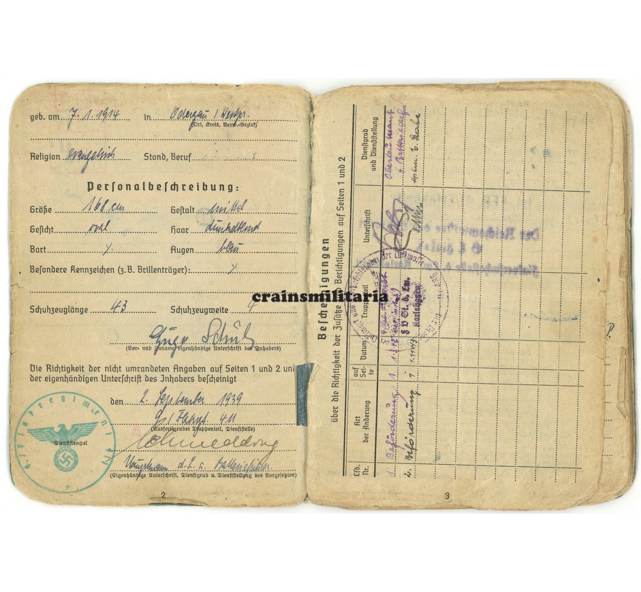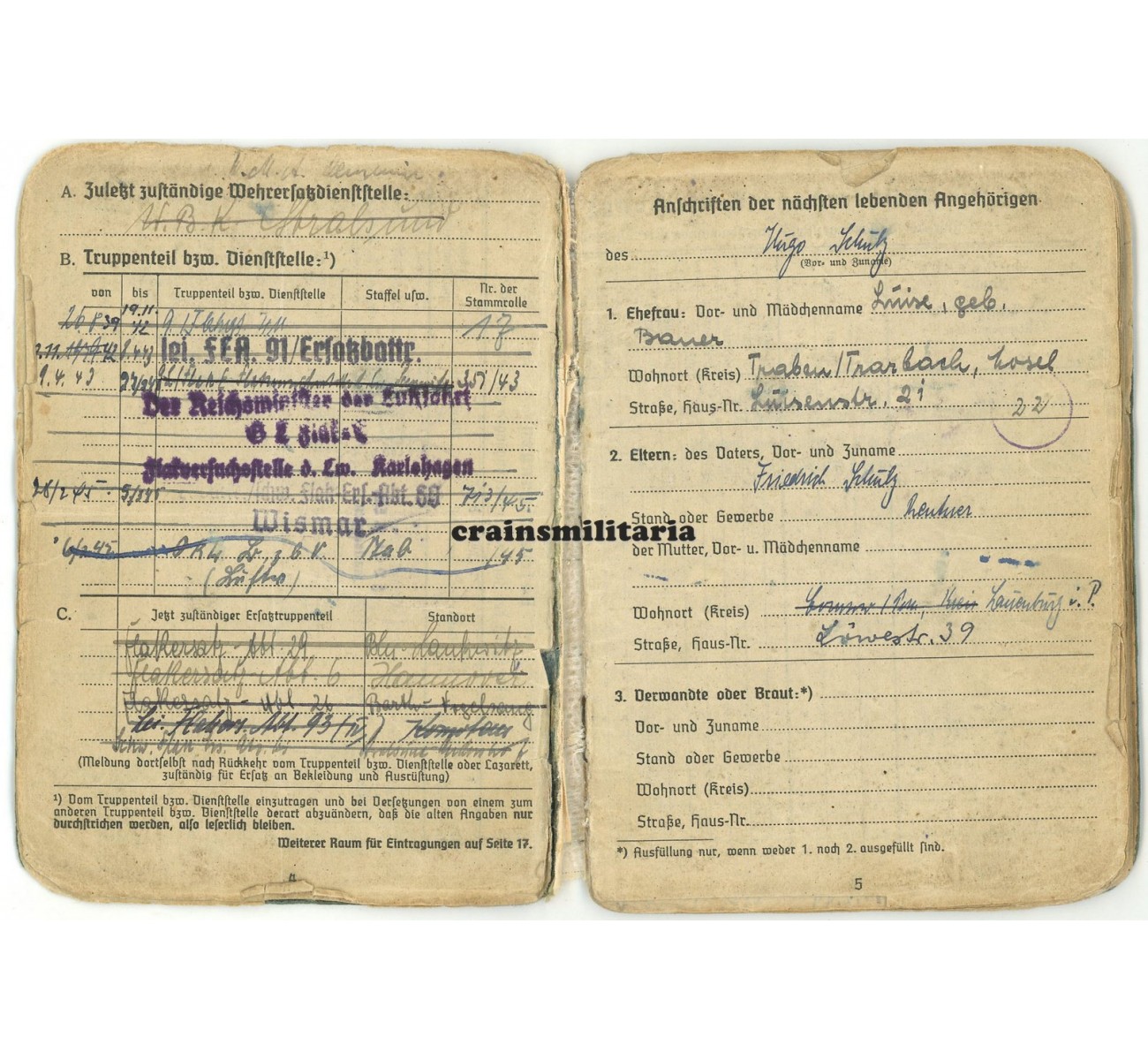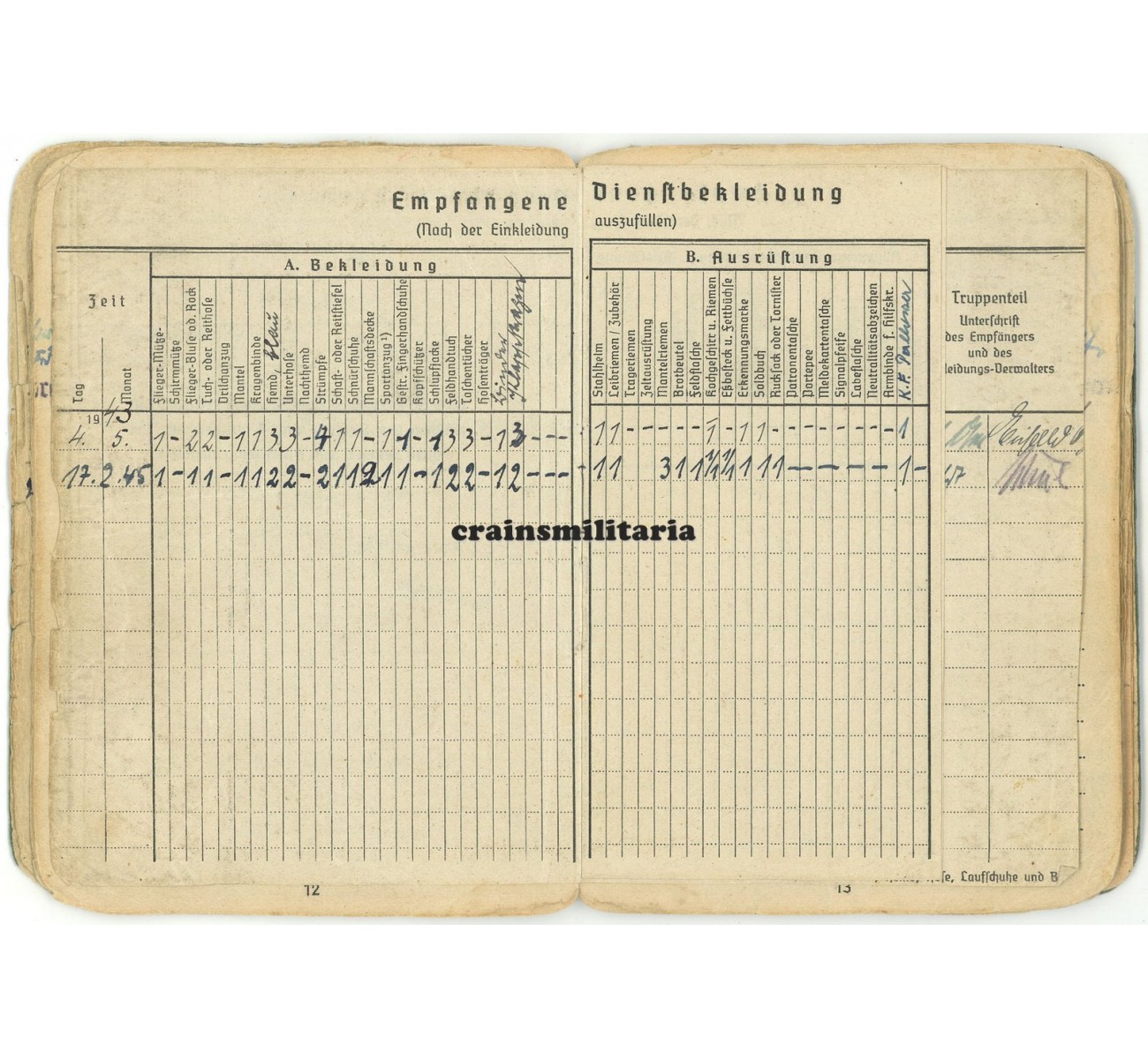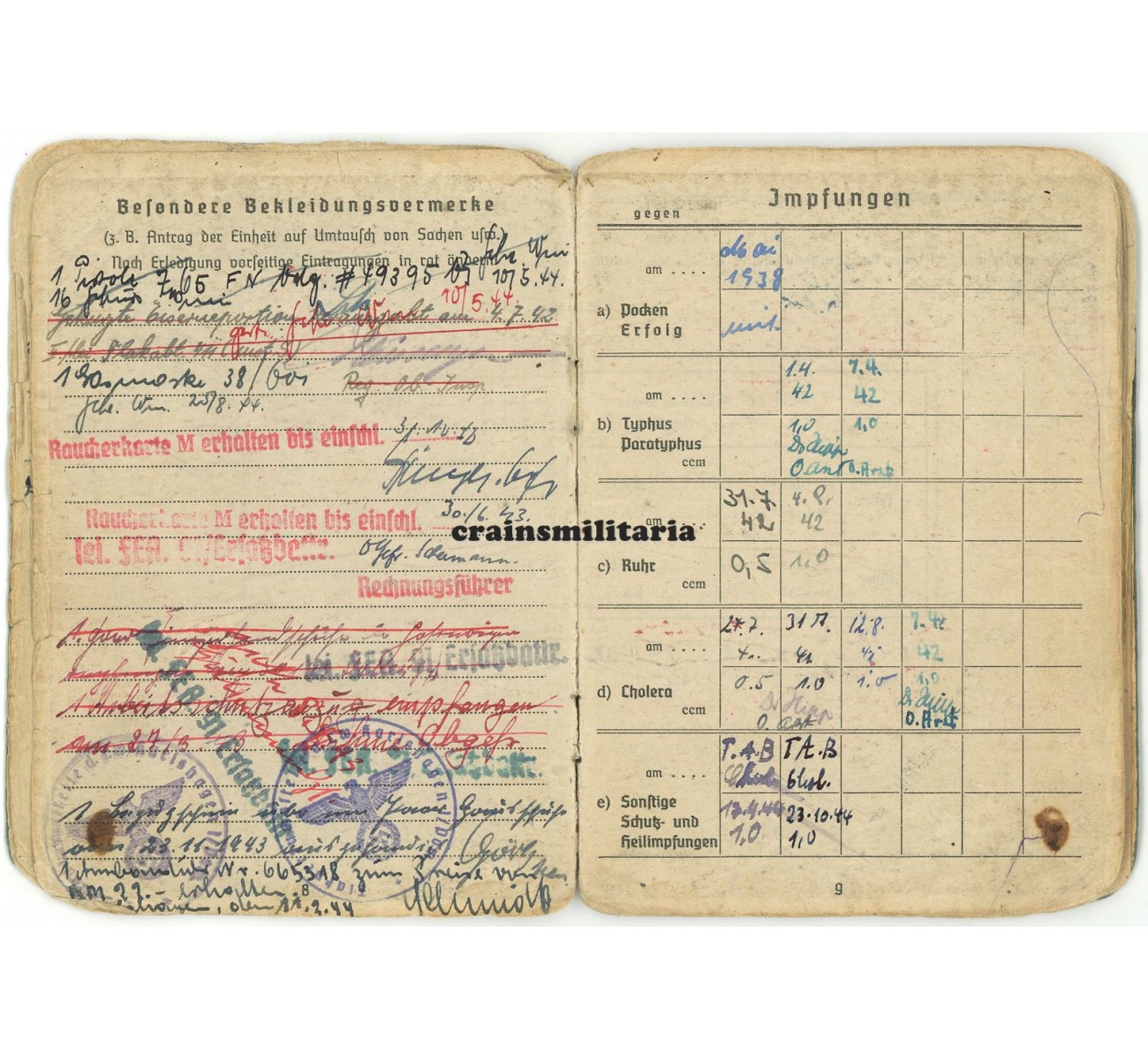 This medical condition would mean the end of his front career, but also the start of a third and most exciting chapter. Schulz now entered a number of experimental anti-aircraft units subordinate to the Reichsluftfahrtministerium; notice the RLM stamps appear throughout the booklet, also signing off his eighth and final award in September 1943, the KVKII mit Schwertern. Mid 1943, Schulz was sent to the "Flakversuchsstelle der Luftwaffe Karlshagen", a secret anti-aircraft missile development center closely connected to the V1 and V2 base in Karlshagen-Peenemünde. Many entries in the Soldbuch reflect his stay there from mid 1943 to early 1945, not only the units page, but also promotion entries, various equipment entries with the "Flakversuchsstelle d.Lw. Karlshagen 1 / Pom.) stamp, a security stamp on page 14, and even the dental record by "Heeres-Zahnstation Peenemünde" from July 1943.