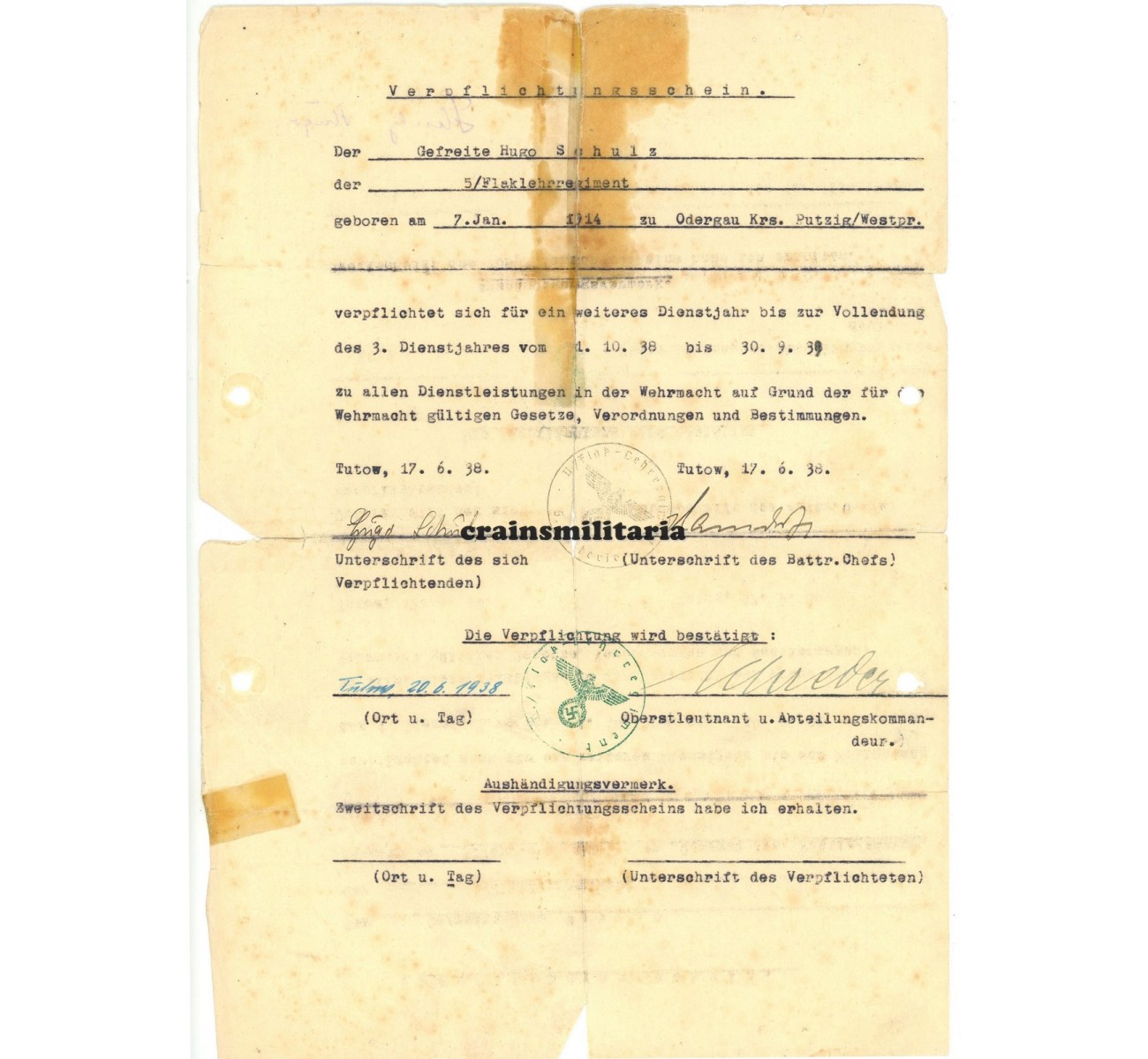 During the last months of the war, Schulz stayed with a few last units in northern Germany, such as schw.Flak.Ers.Abt.60 (east of Hamburg), but also a mysterious zbV staff unit directly subordinate to the OKL (Oberkommando der Luftwaffe), until he was released from service in May 1945. The Soldbuch is in used but very good condition, including the portrait photo, and packed with entries, also listing a private wrist watch and Belgian 7.65 mm pistol among his equipment. It comes with his A4 sized promotion document to Wachtmeister signed by DKiG winner Major Walter Barg as commander of II./Flak.Rgt.411, a document volunteering for another year of service in 1938, and the forementioned confirmation of the personal possession of the Spanish Astra pistol. Also added are a few copies of Bundesarchiv documents.