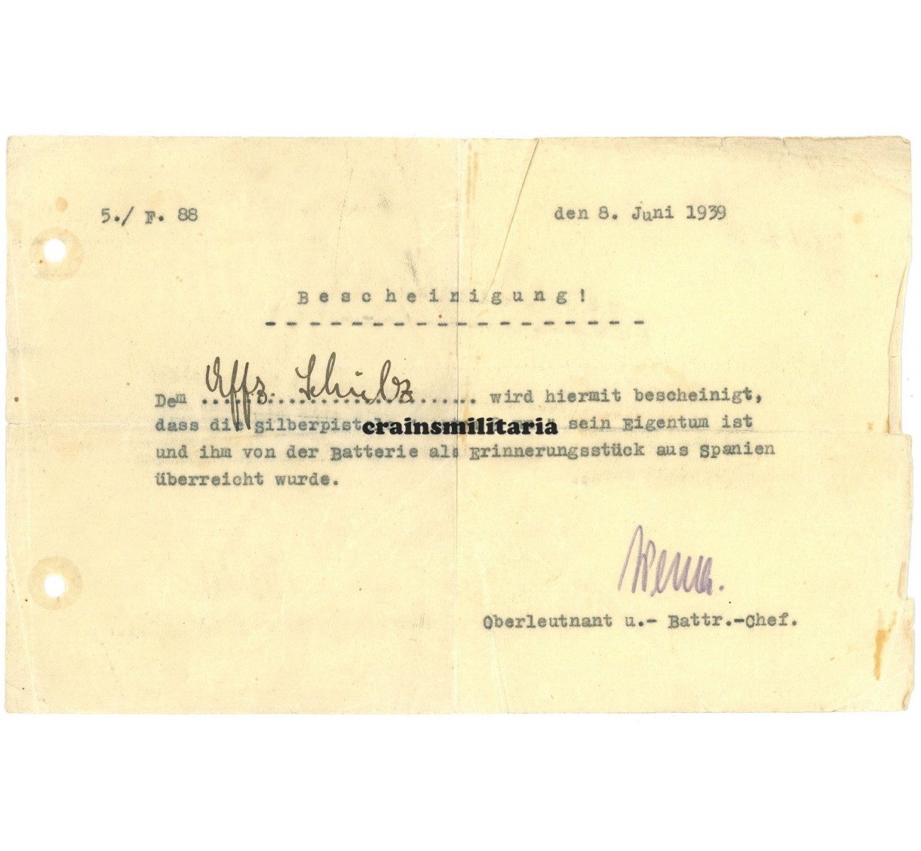 Soldbuch to Oberwachtmeister Hugo Schulz. First issue from September 1939. The lengthy Luftwaffe career of this Western Prussian can be divided in three main parts. His first chapter was in the earlier 1930's, when he was sent to the Spanish front as soldier of the 5. Batterie of the heavy Flak unit "F/88" of the Legion Condor. He was awarded the Spanienkreuz in Silber, and two Spanish awards for this time: the Medalla de la Cruz Roja and the Medalla de la Campana. Also notice the very nice extra document allowing him to bring home a silver Spanish Astra 9 mm pistol, awarded to him by his Batterie as a souvenir.