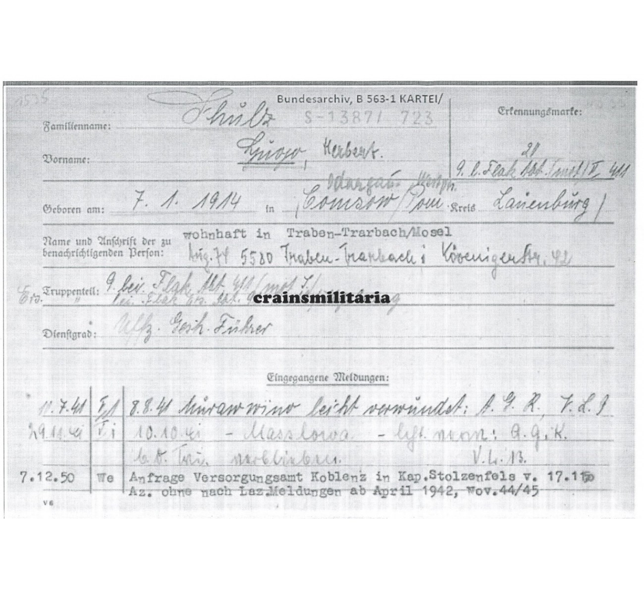 The second chapter starts for Schulz at the outbreak of war, when he was already an Unteroffizier with the 9. Batterie of Flak-Regiment 411, immediately fighting in the Polish campaign with the 4. Armee. In 1940, his Batterie was assigned to the 1. Armee to support the French campaign: Schulz performed well and earned an EKII on June 1st for France. In 1941, the 9./Flak.Rgt.411 supported the Panzergruppe 3 in its attacks on the Eastern Front, in 1942 it followed the 18. Flak-Division also in the East. Schulz kept on adding to his awards list: the Verwundetenabzeichen in Schwarz for two minor wounds in 1941, the Kampfabzeichen der Flakartillerie and the Ostmedaille followed. But in September 1942, he was hospitalised in Orscha (central Russia) with a thrombosis.