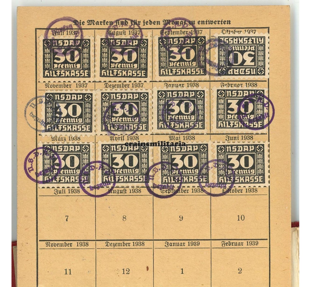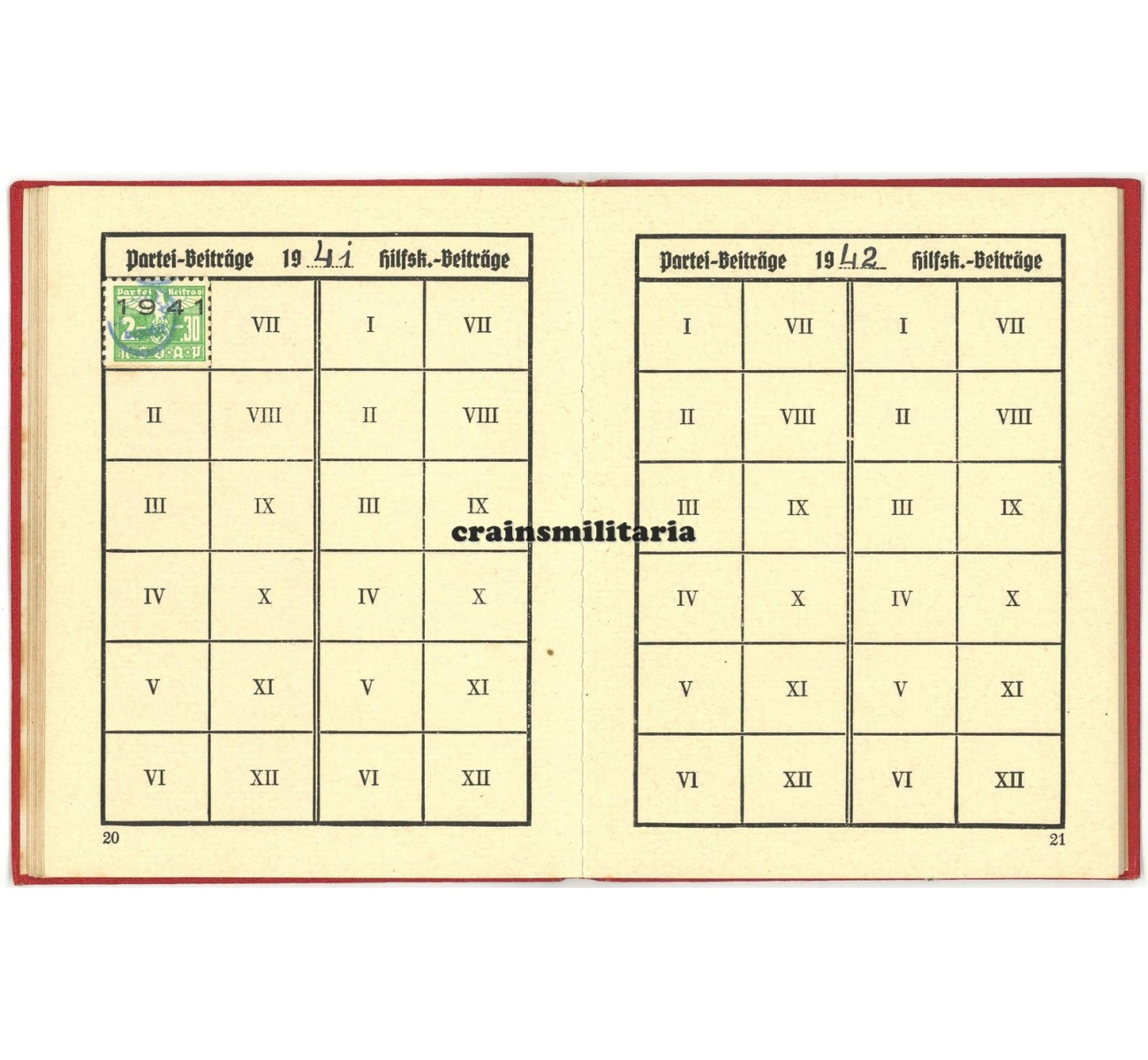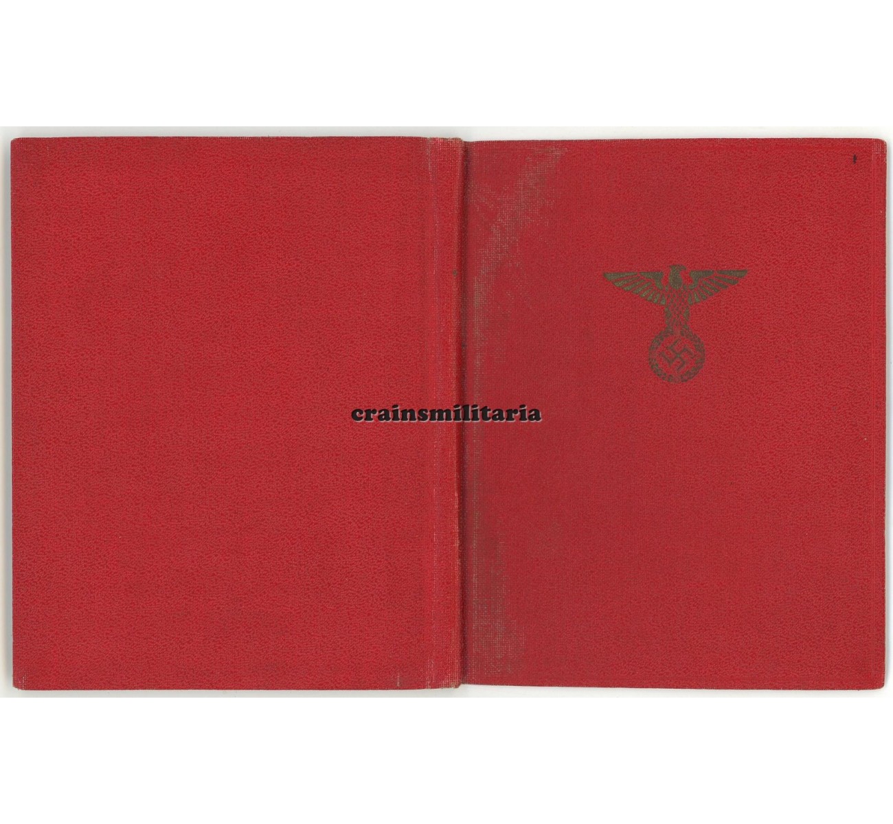 The book is a 1935 version produced by the Reichsleitung München, including seven introducing pages with the list of the 1923 Putsch victims and an introduction by Hitler. It was issued in October 1938 by the NSDAP Ortsgruppe Hamburg - Jarrestadt. Given his civilian profession, it is quite possible he joined the Luftwaffe at a later stage, the stamps stopping in 1941 also point in this direction.