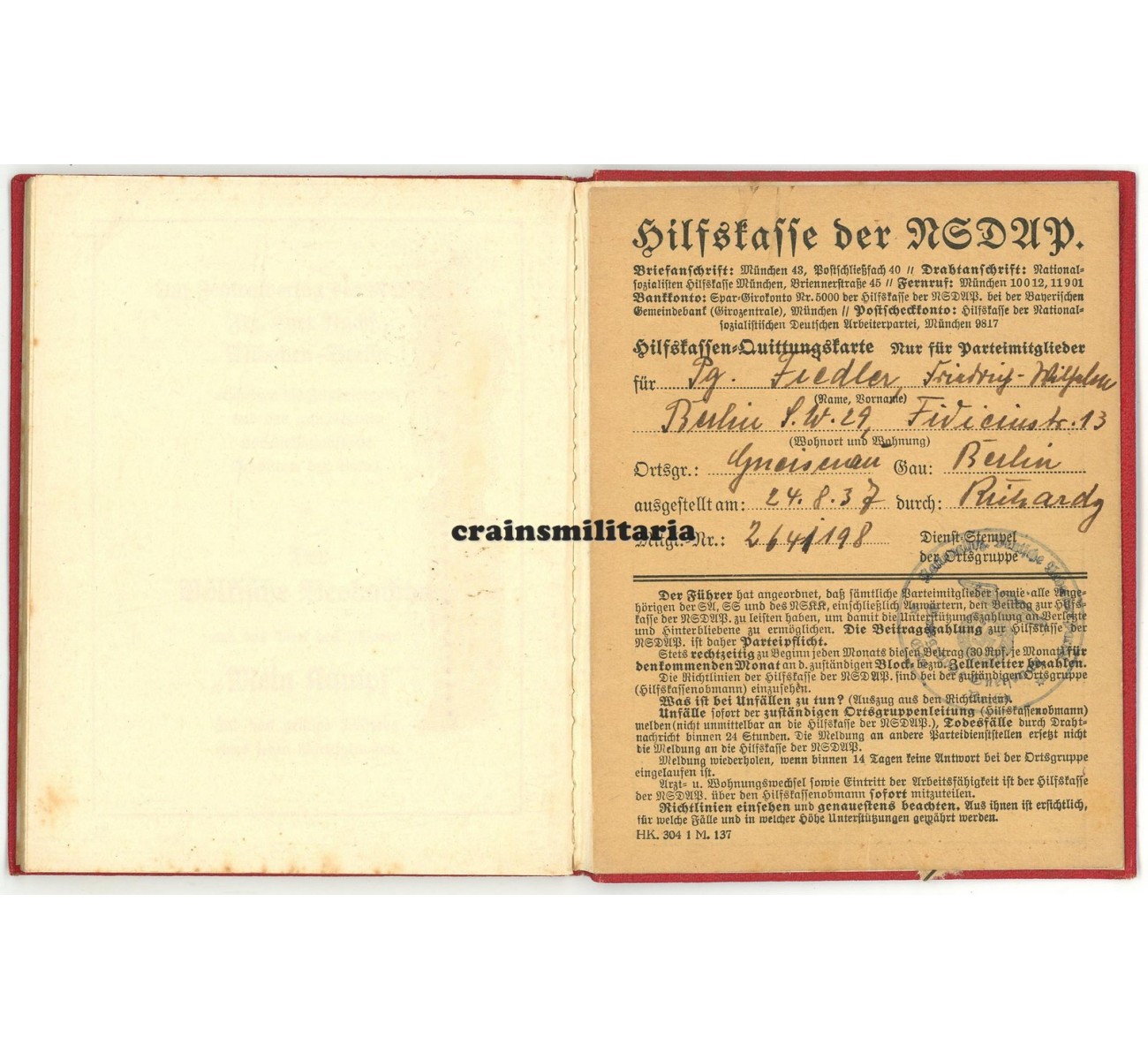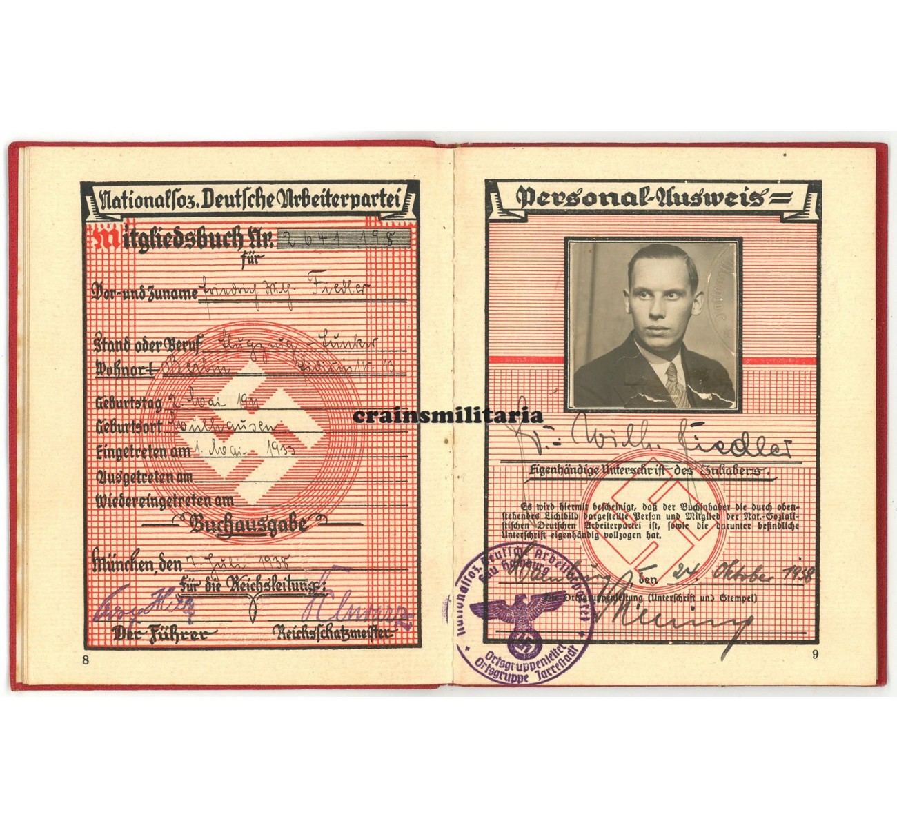 Party book "NSDAP Mitgliedsbuch" to Friedrich Wilhelm Fiedler, a "Flugzeug-Funker" born in Mülhausen but living in Berlin, and later Hamburg. He joined the NSDAP on the symbolic day of 1st of May in 1933, receiving the party number 2.641.198.