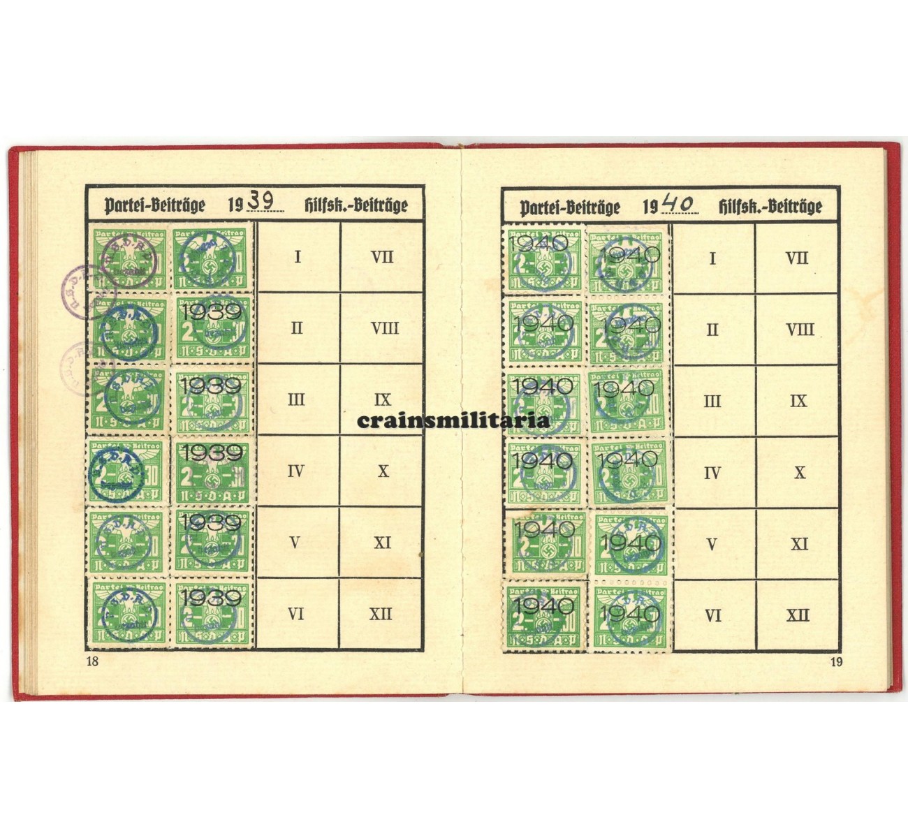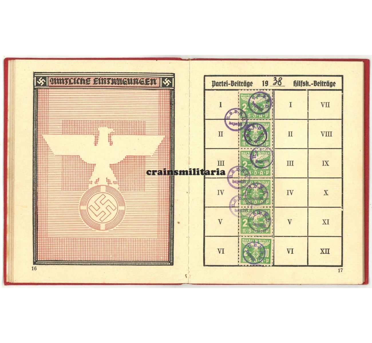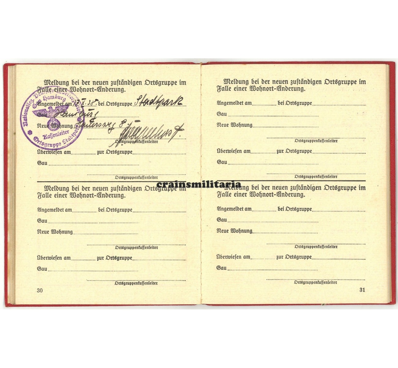 The party book has contribution stamps going from 1938 to 1941, including specials stamps for the Reichsparteitage in 1938 and 1939. On page 30 is an extra entry for a transfer to the NSDAP Ortsgruppe Hamburg-Stadtpark, and on the last page an extra NSDAP Quittungskarte document was pasted in - the reverse with stamps for 1937-'38 is still mostly visible. The Parteibuch is in very good condition, complete with all 48 pages and the portrait photo, with an intact red cover showing the party eagle.