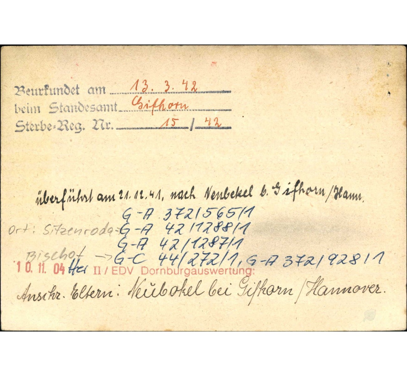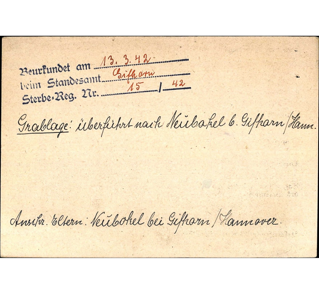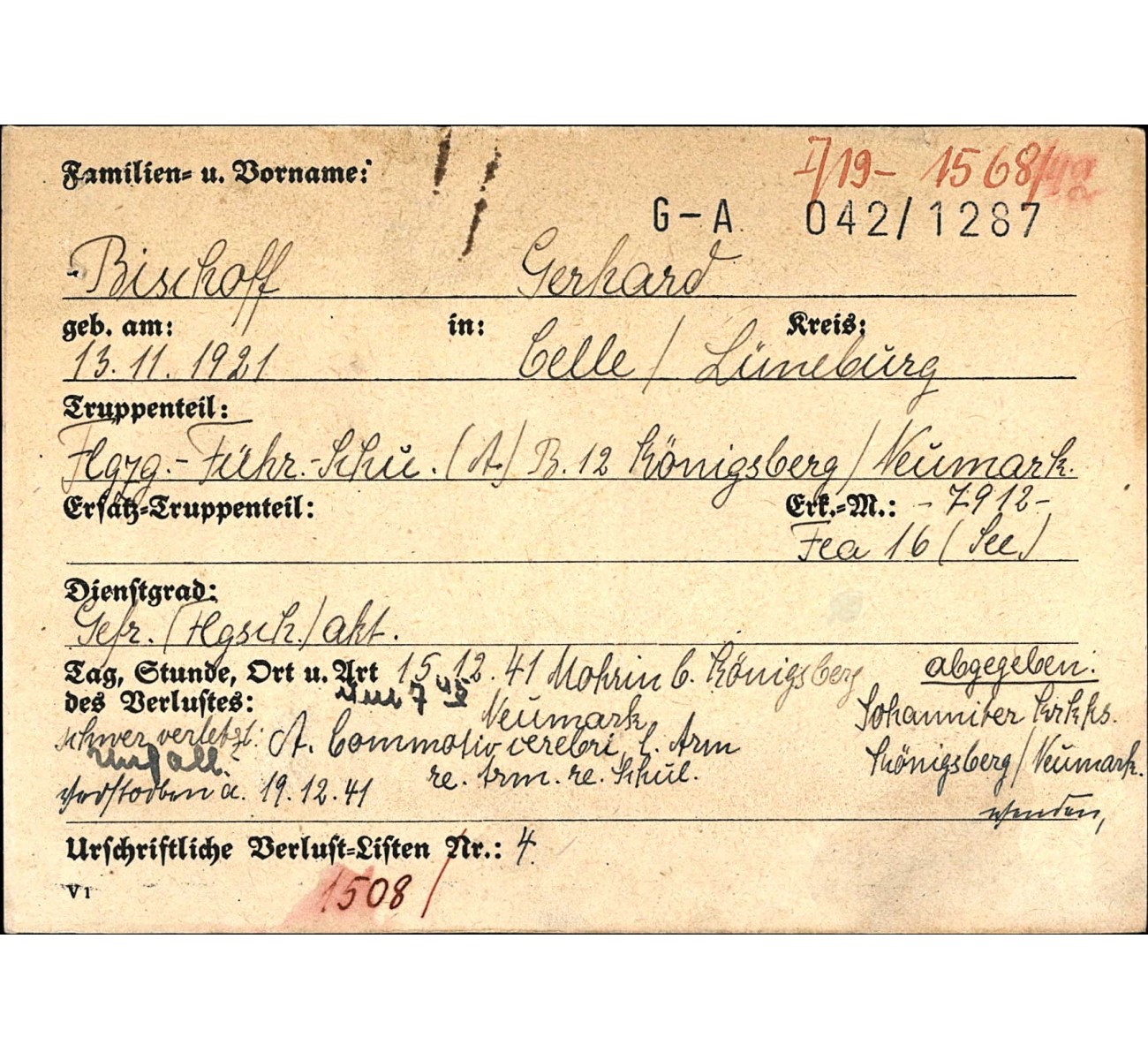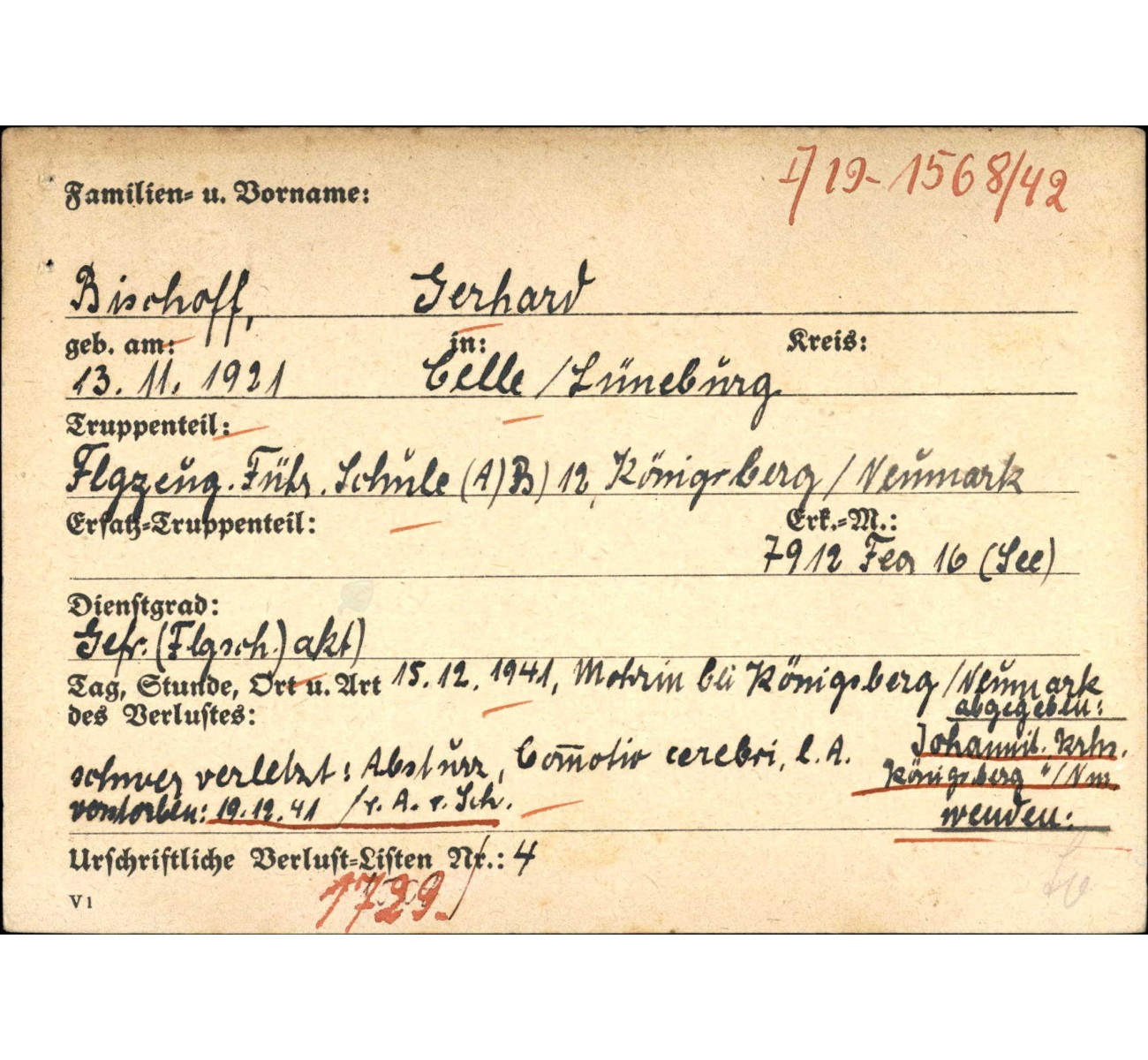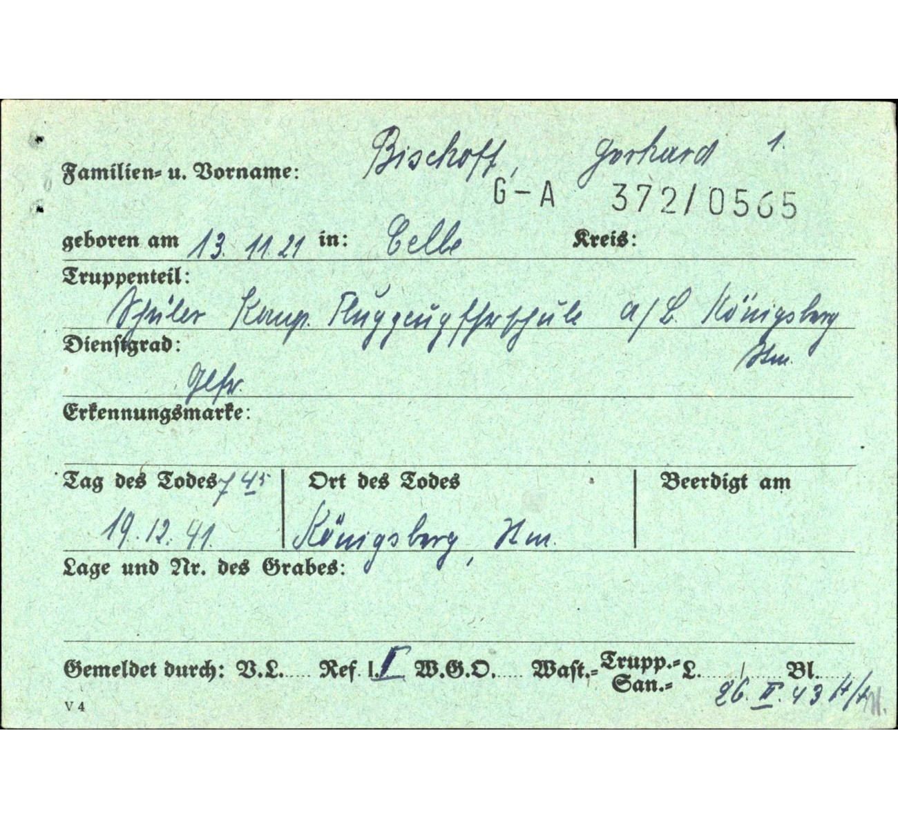 During one of his training flights, on 15th of December 1941, Bischoff made a serious crash in Mohrin (Moryn), just south of Königsberg. The pilot school had a small satellite airfield there. Bischoff had fractures in both arms and his shoulder, but also suffered brain damage. He was brought to hospital and arrived there in a comatose state, succumbing to his wound four days later, on 19th of December. His body was transported to his residence in Neubokel near Gifhorn, where his father worked as a teacher.