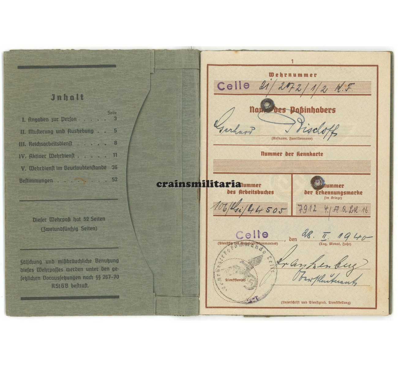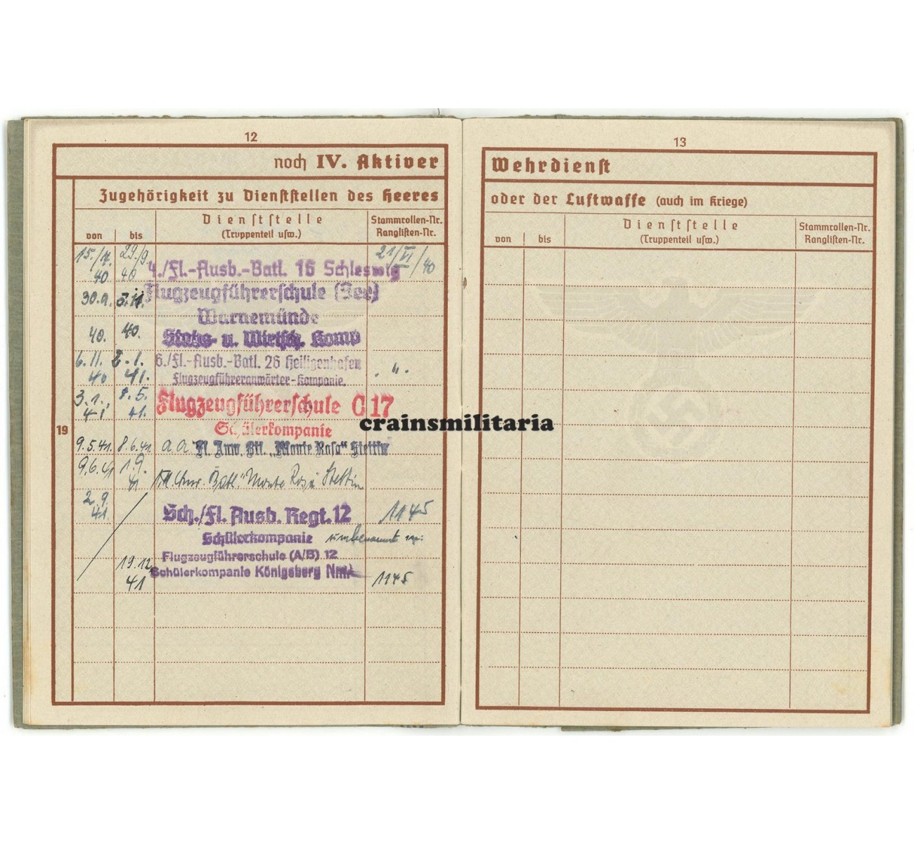 Wehrpass to Gefreiter and Unteroffizier-Anwärter Gerhard Bischoff. First issue from February 1940. Bischoff had earned the HJ-Leistungsabzeichen in his youth, studied in the aviation industry to pursuit his dream to become a pilot, and volunteered for the Luftwaffe in March 1940. He was found fit for flying duty and after his basic training in Schleswig, he joined a number of pilot schools. He trained with Luftwaffe air bases in Warnemünde, Heiligenhafen, Pütnitz and Stettin, before joining the Flugzeugführerschule (A/B) 12 in Königsberg / Neumark in Autumn 1941. This city is now called Chojna in Poland, and is not to be mistaken with the larger city Kaliningrad. Many different airplanes were used by the school, also including the Italian Saiman and French Caudron C.445 planes.